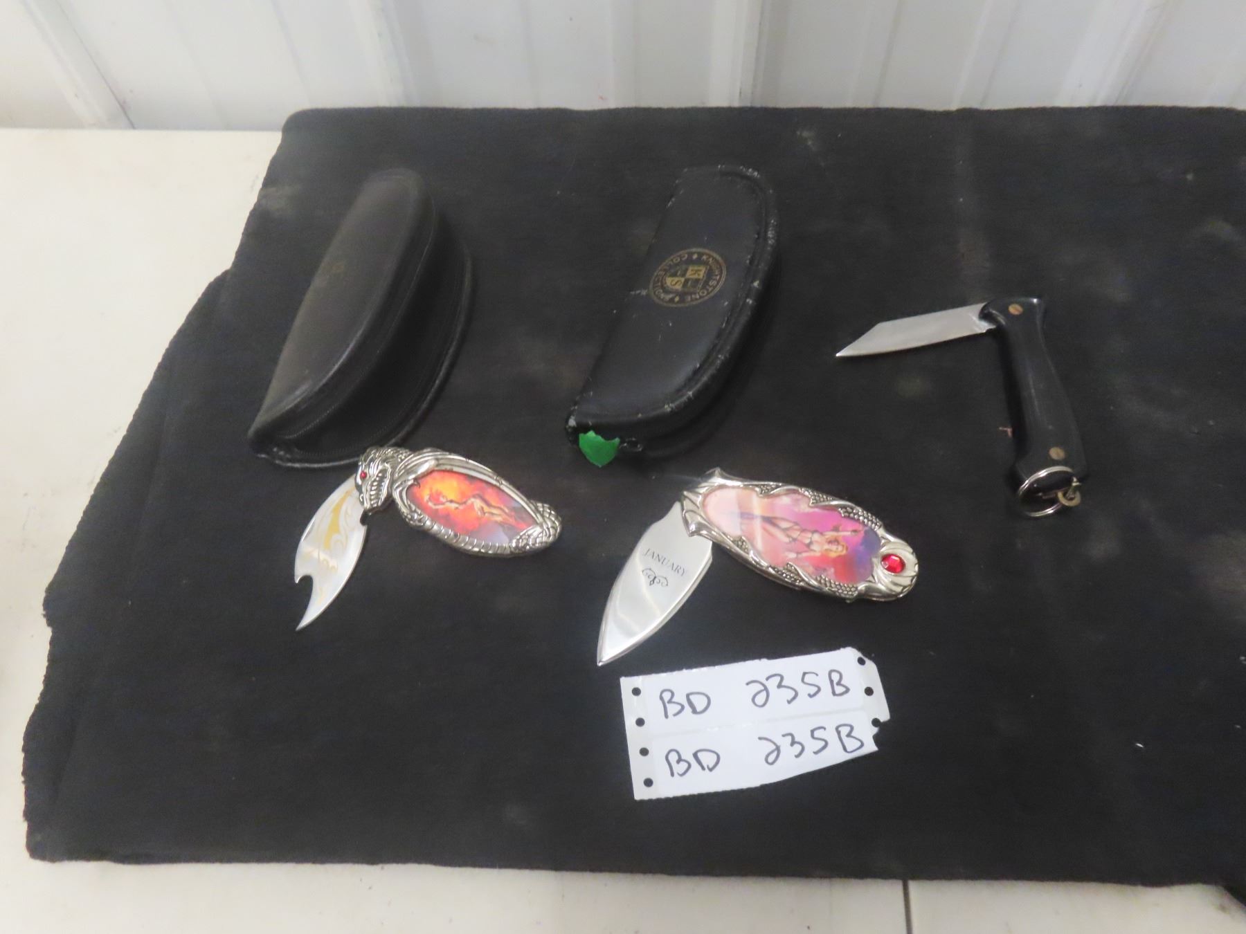 Vintage Normark " BK,SWEDE" Folding Pocket Knife Plus 2 Night Stone Fantasy Pocket Knives with Cases