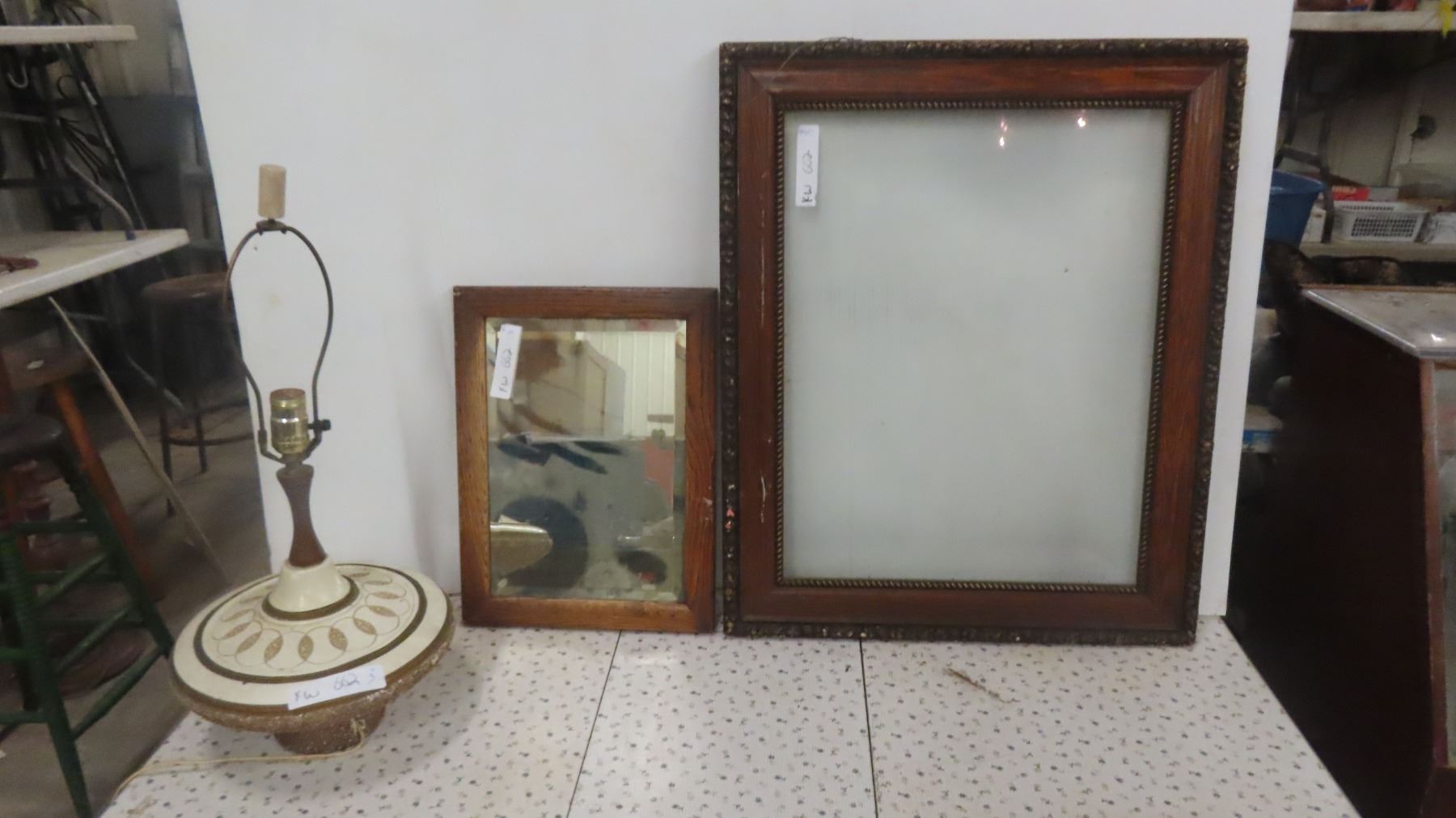 Vintage Oak Picture Frame 22'' x 28'' , Oak Bevelled Mirror 12 1/2'' x 17'' , Pottery Lamp