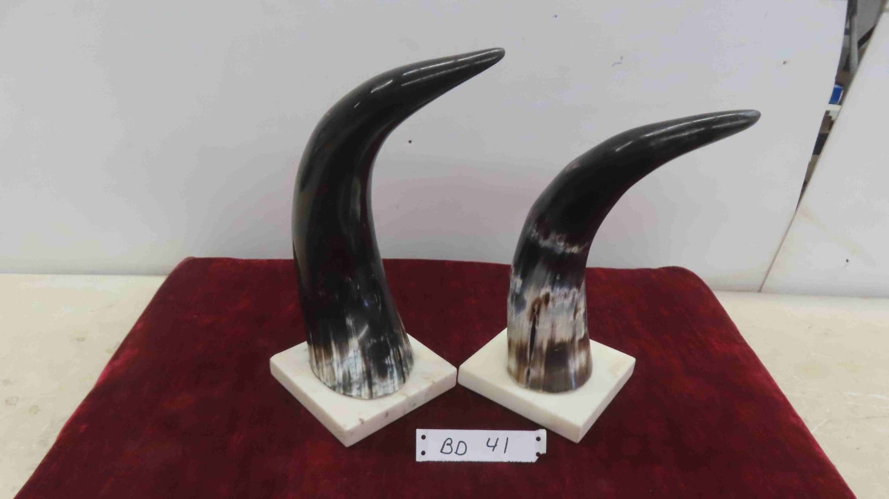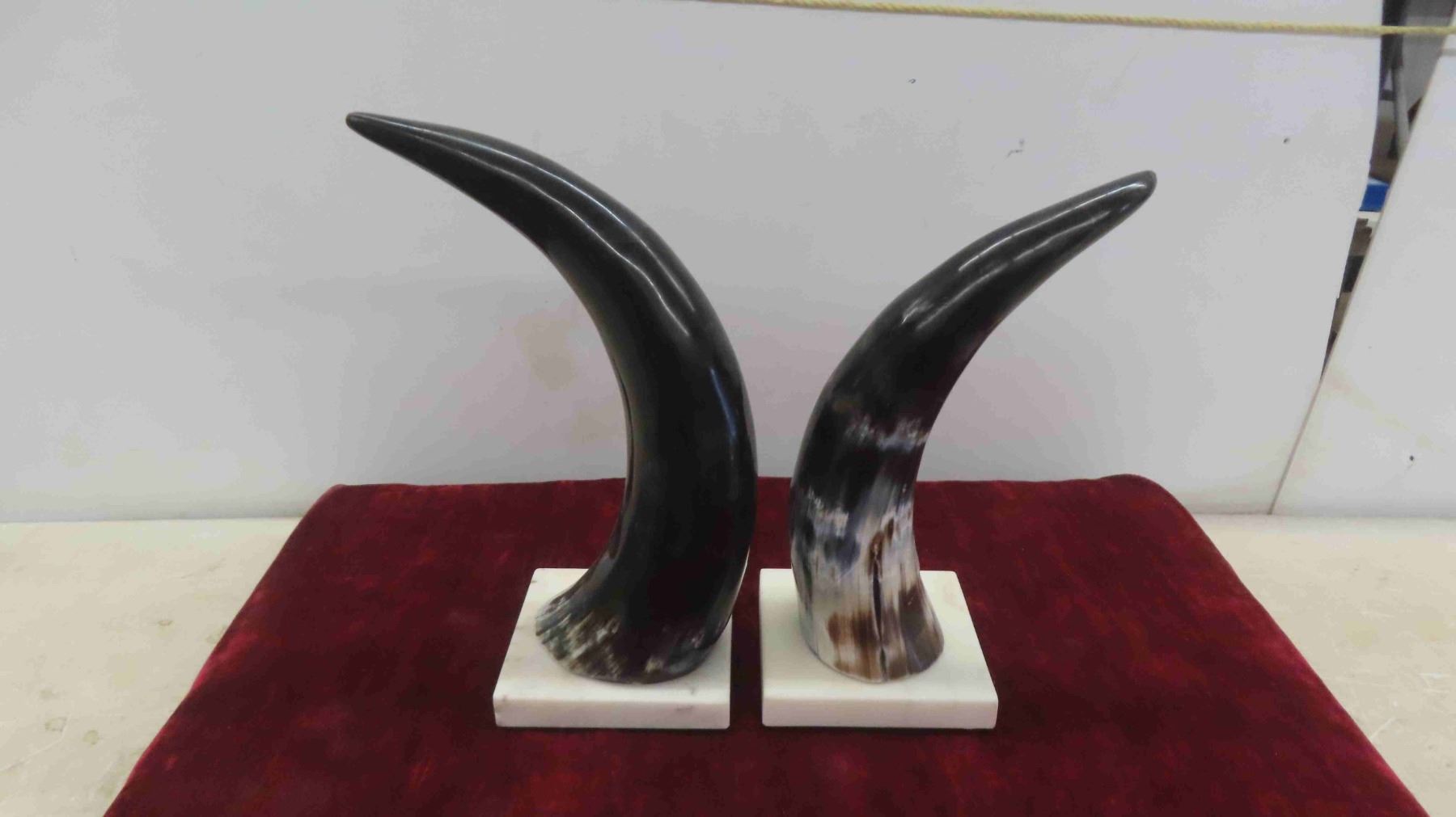 Vintage Pair of Authentic Bull Horn Book Ends on Marble Base - Both Measure 1ft Tall