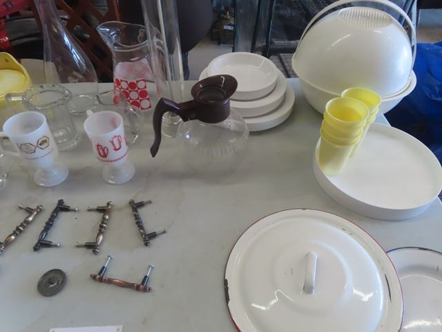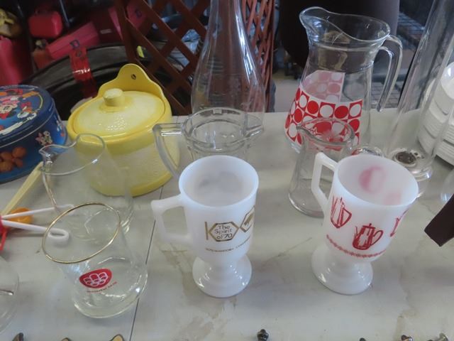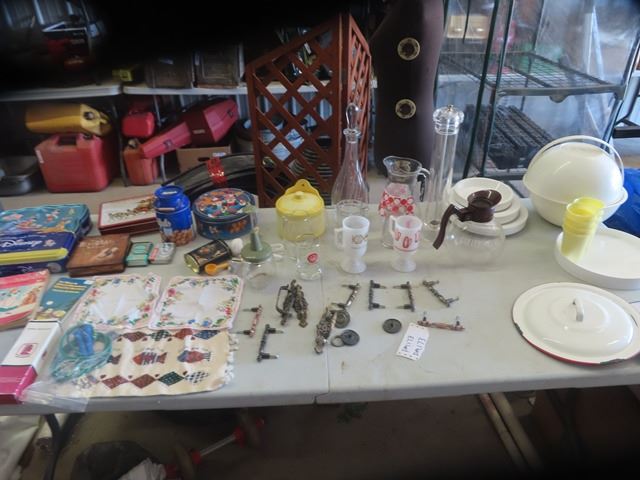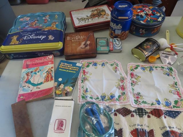 Vintage Picnic Basket, Tins, Door Hardware, Tea Pot, Mugs, Creamers, Kitchen Ware, Books: Alice in Wonderland, Charlie Brown