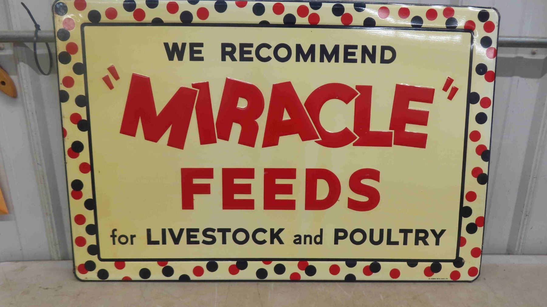 Vintage Porcelain ''Miracle Feeds'' Sign 35'' x 23 1/4'' - Never Hung Up