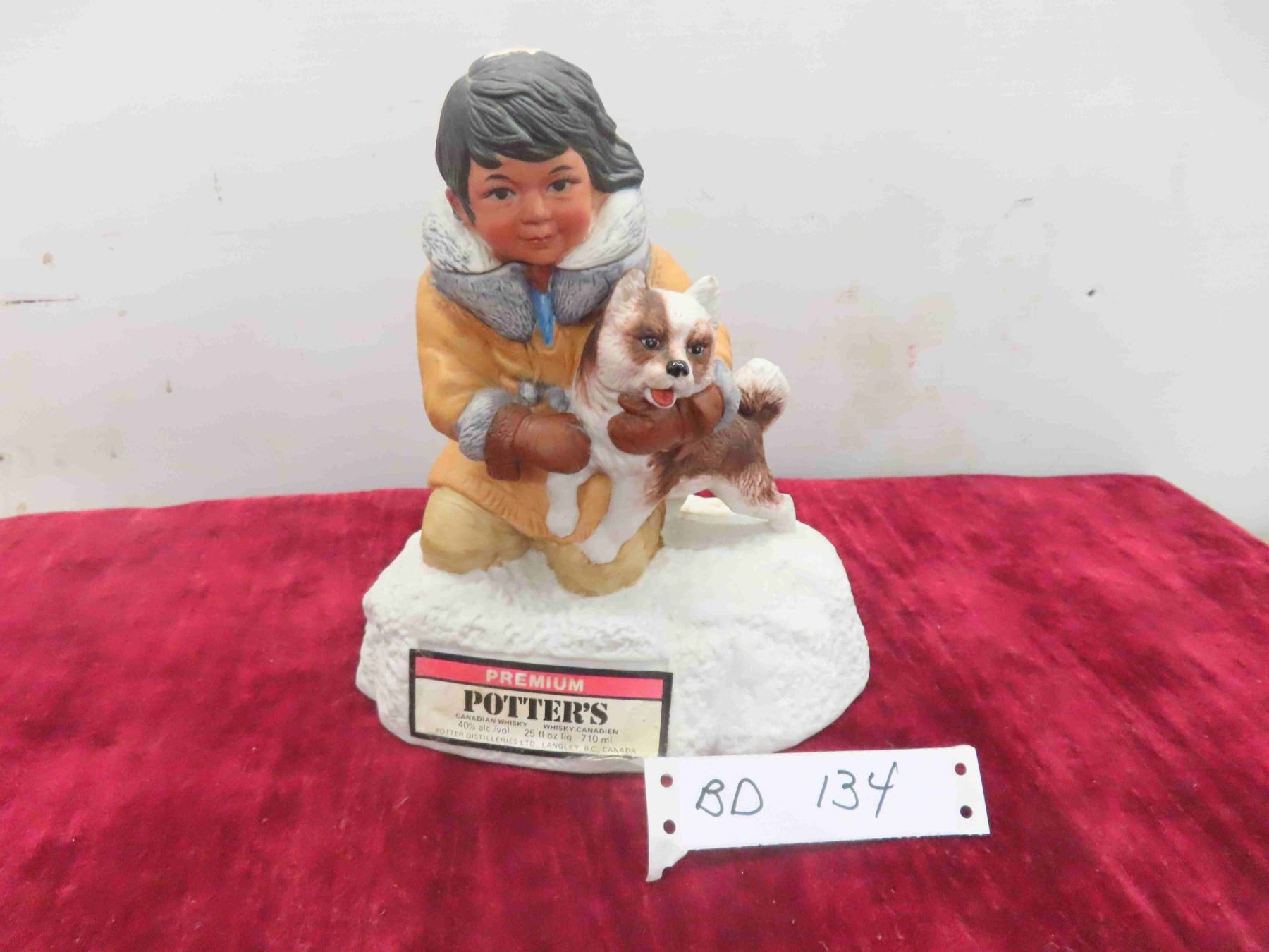 Vintage Potters Canadian Whiskey, Porceclain Decanter shaped like Inuit Child and Husky Dog