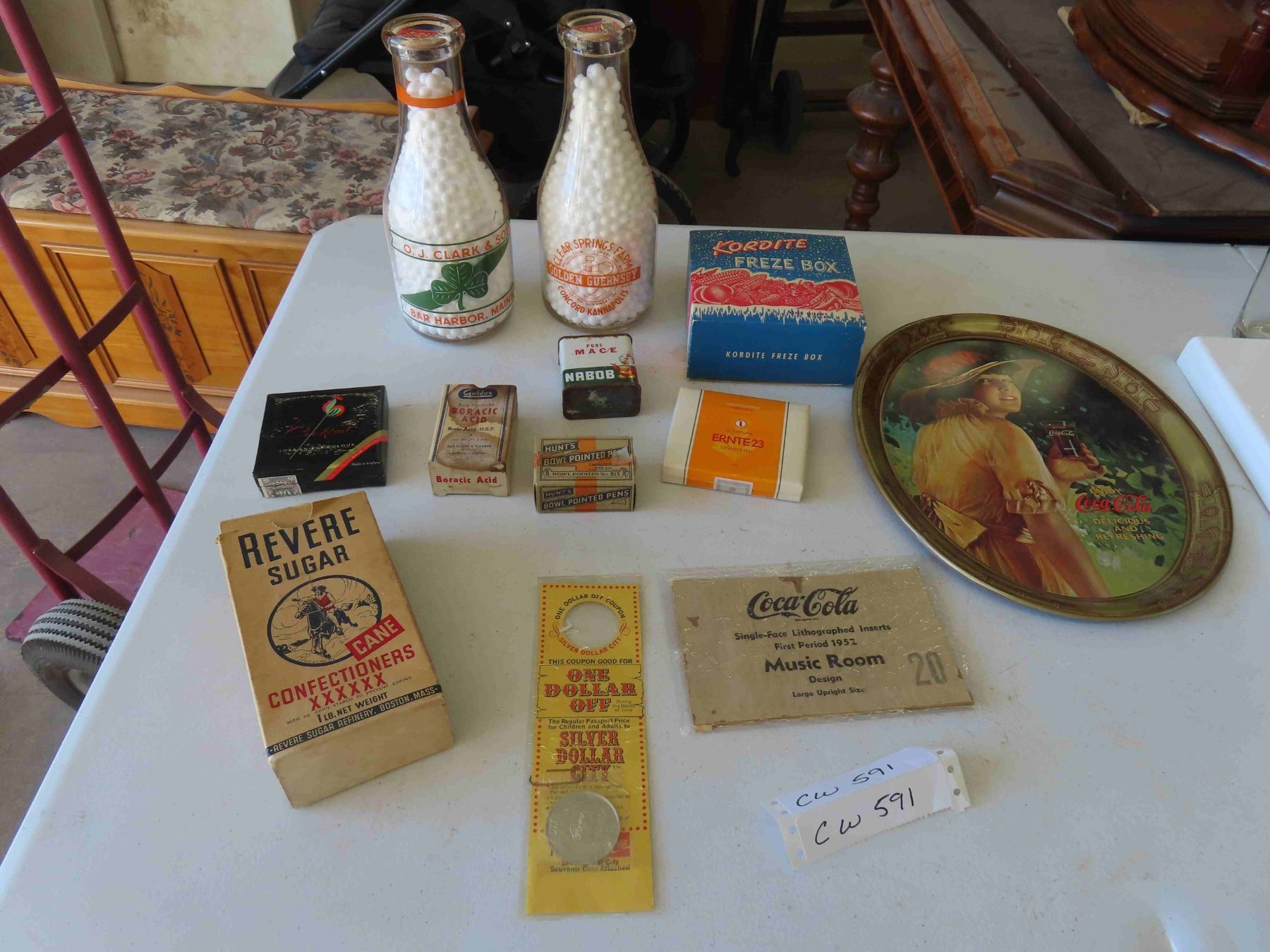 Vintage Products with Advertising : Revere Sugar , Kordite Freeze Box , Nabob , OJ Clark & Sons Milk Bottle , Golden Guernsey Milk Bottle , Coca Cola Tray , Plus