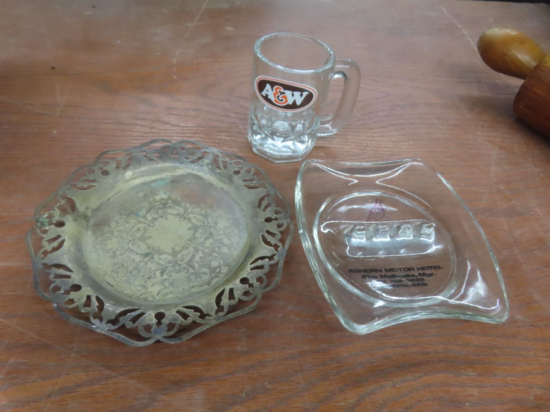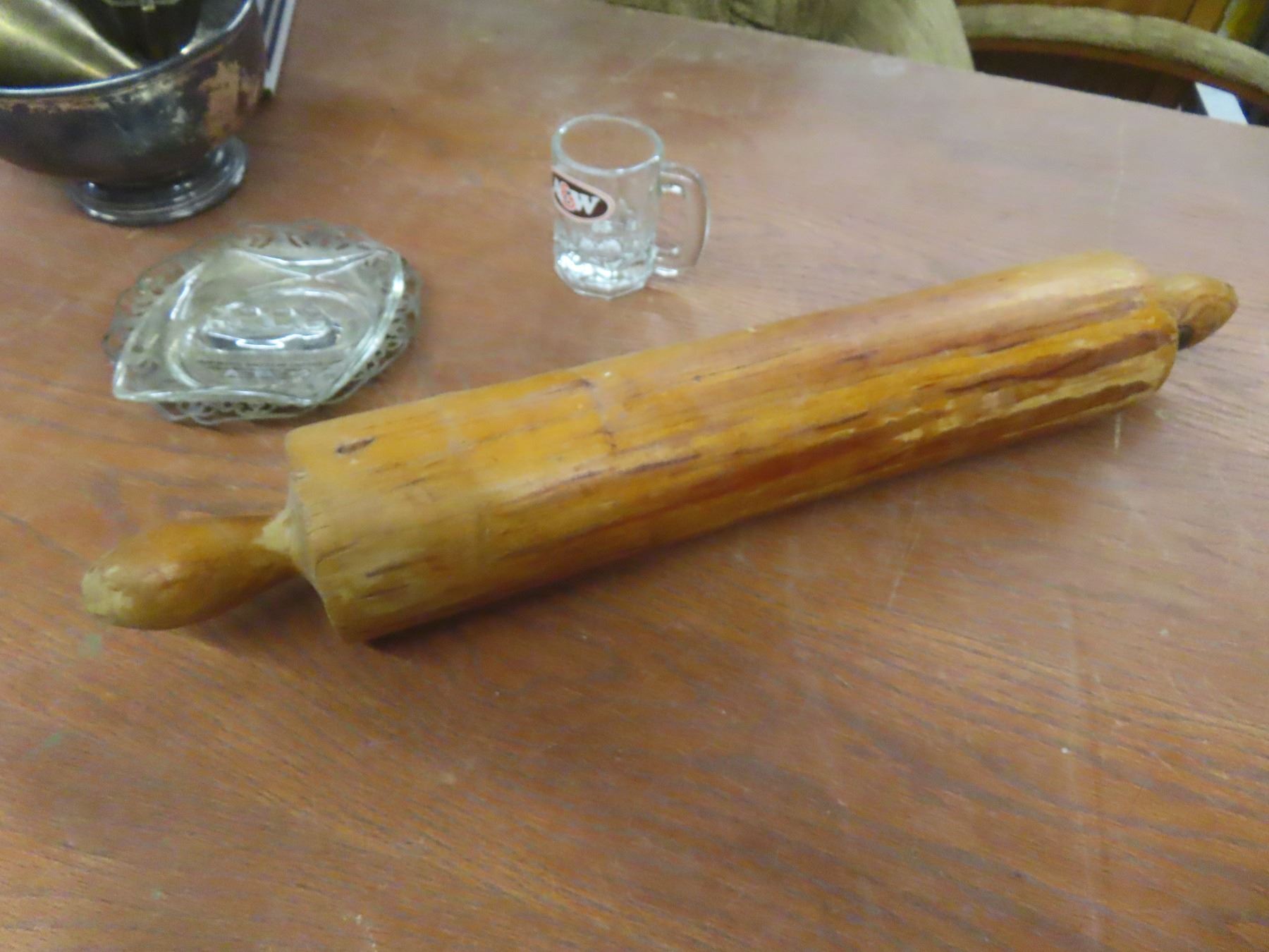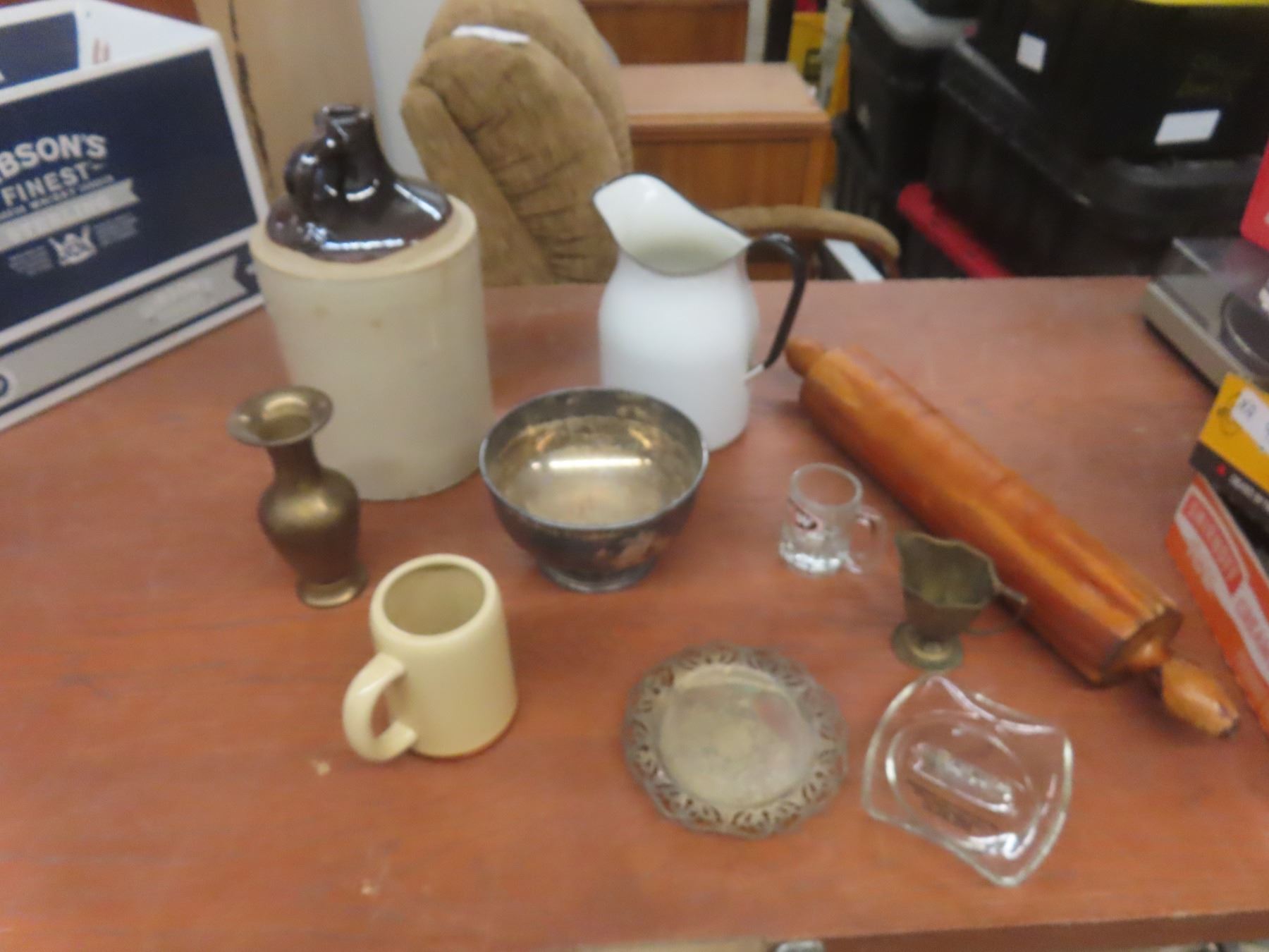 Vintage Rolling Pin, Stoneware Finger Jug, Cream Pitcher, A and W Baby Mug Silver Plated Bowl