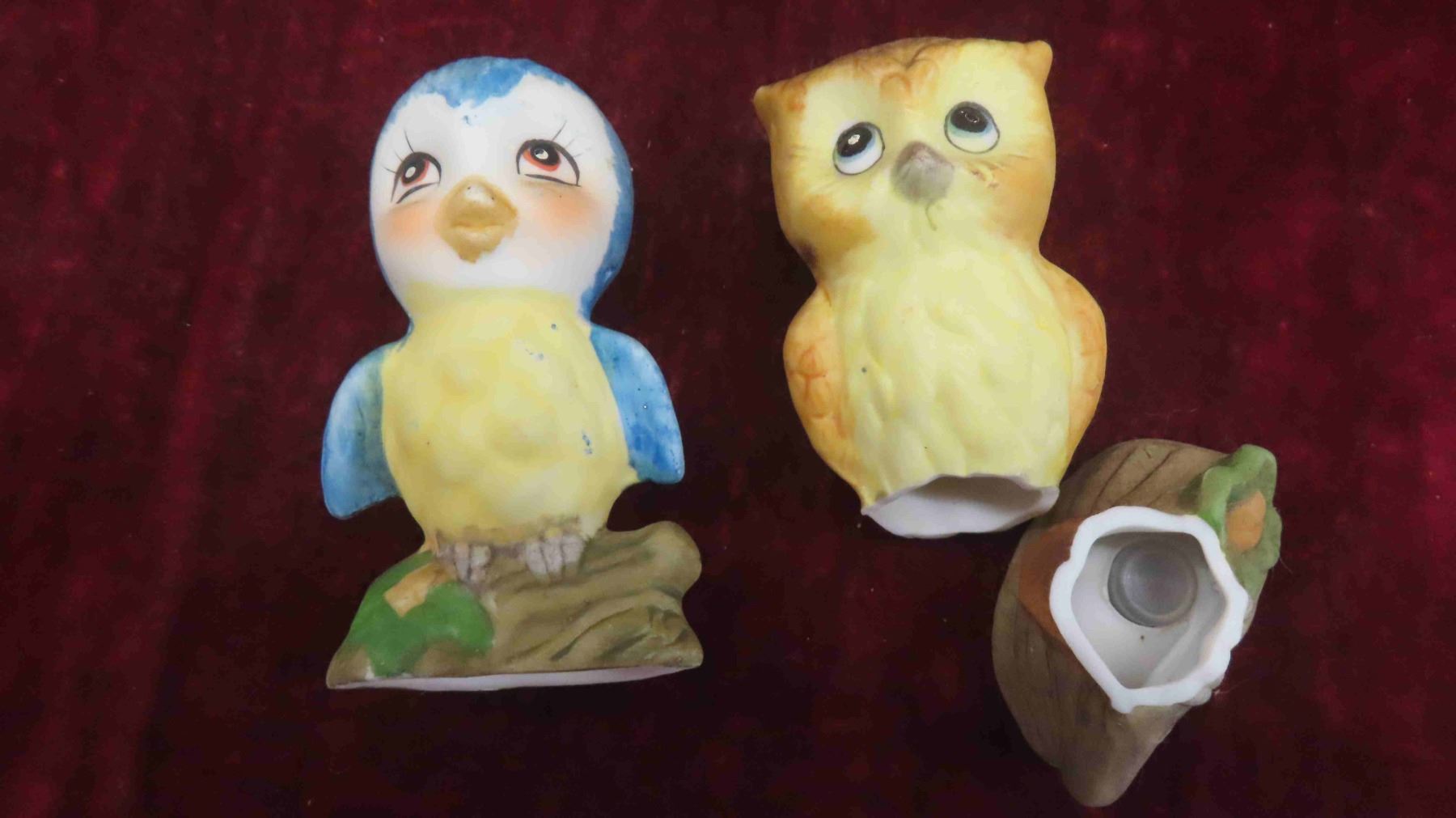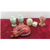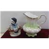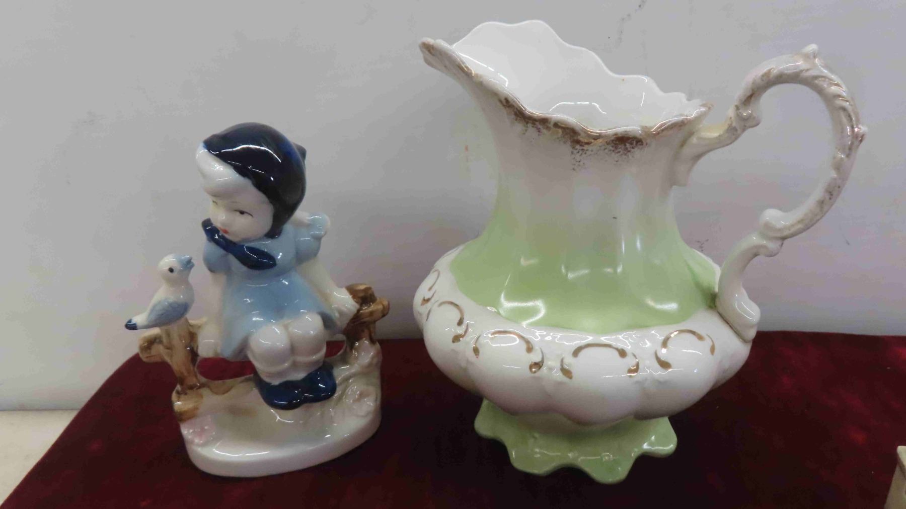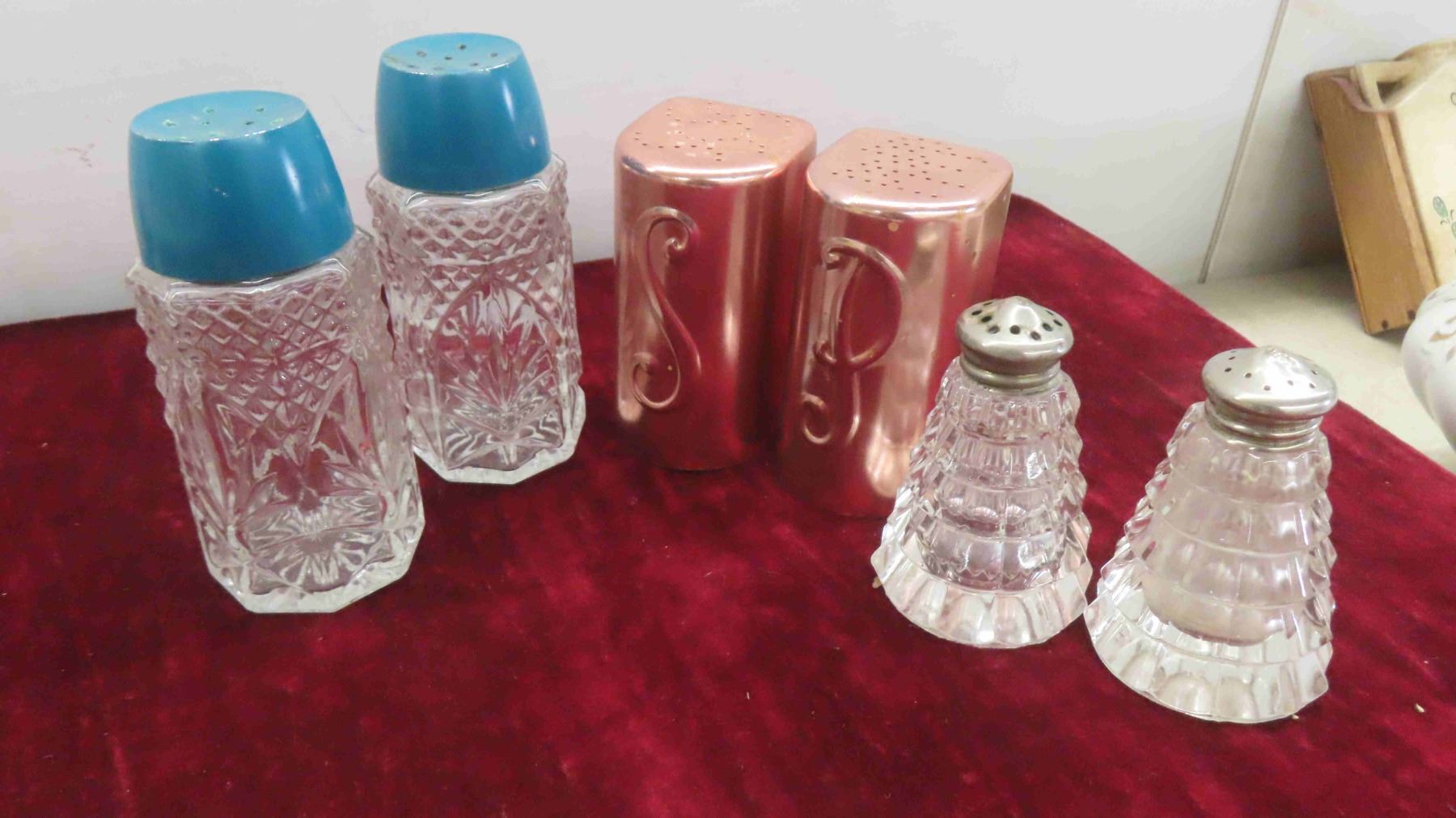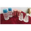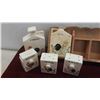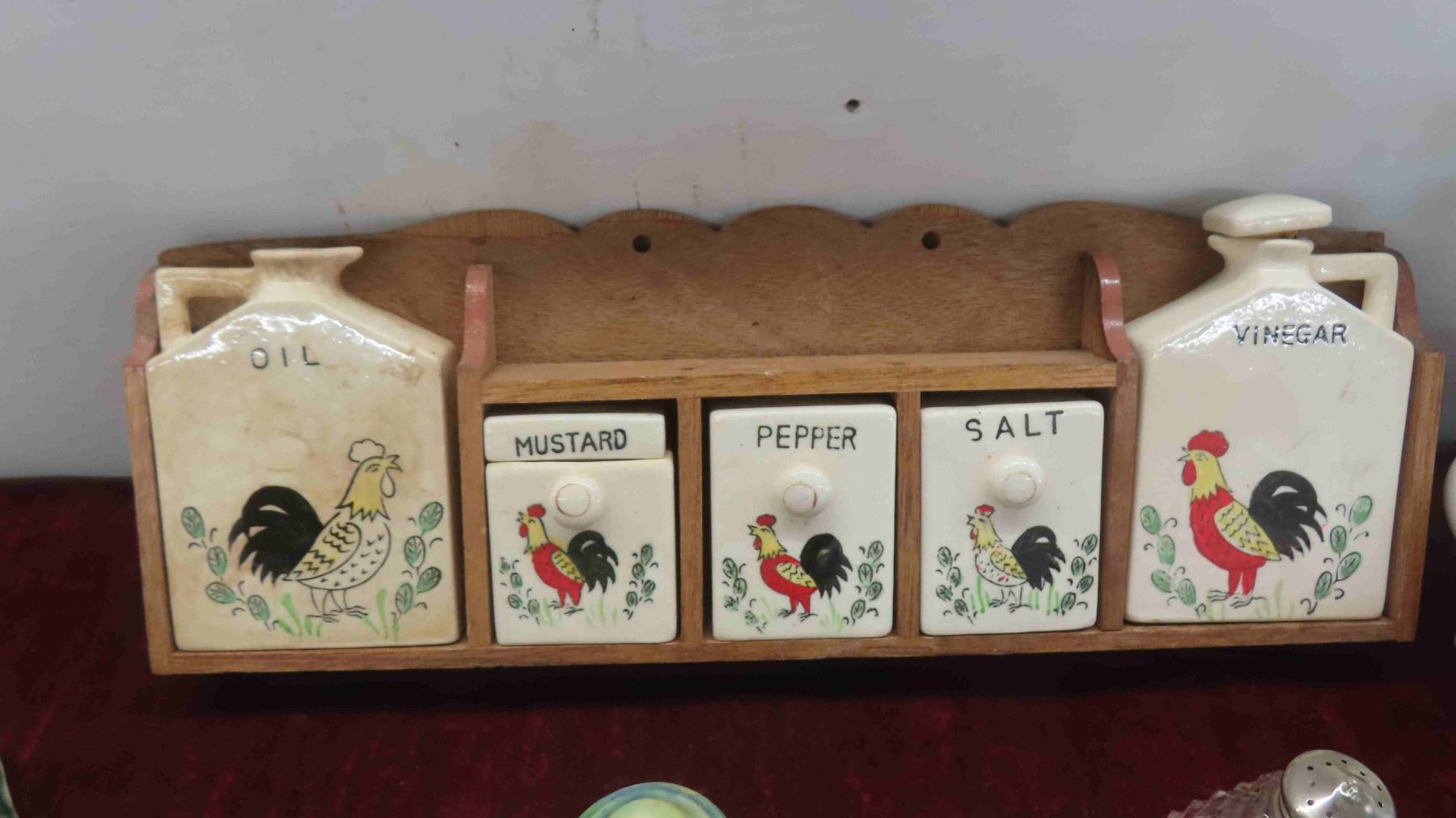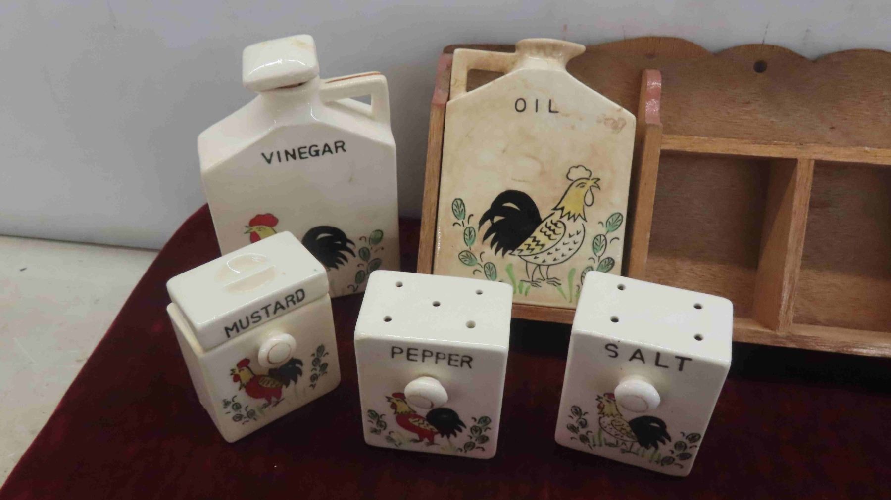 Vintage Salt , Pepper , Oil, Vinegar in Wood Display Rack , More Salt and Peppers, Royal Vitreons Pitcher, Hand Decorated Shafford China with Bird Display
