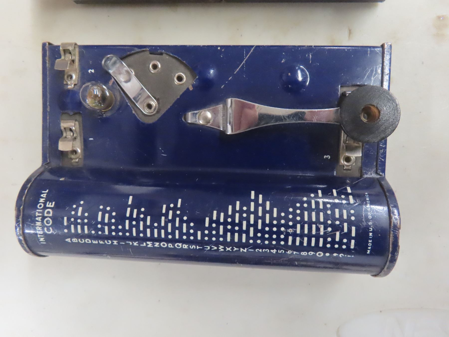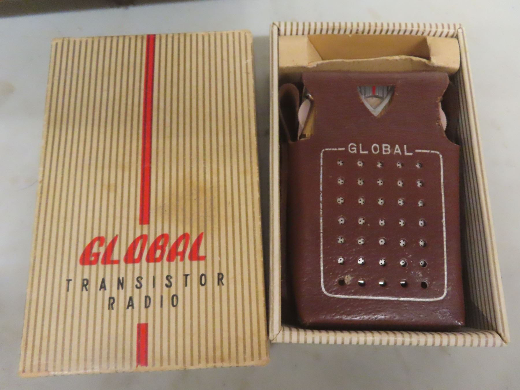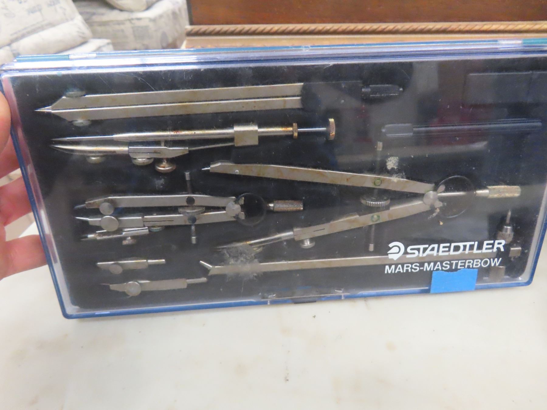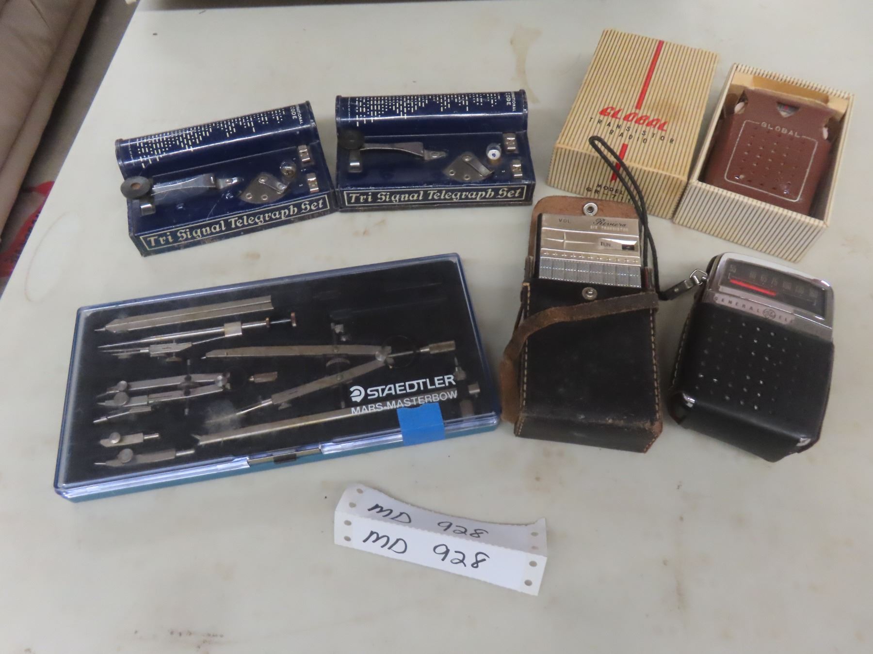 Vintage School and Office Items Including StaedtlerProtractor Set, Tri-Signal Telegraph Set, and Three Transistor Radios