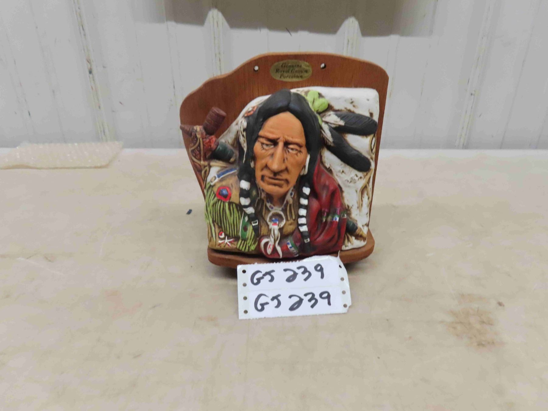 Vintage Sealed with Tax Stamp Genuine Royal Crown Porcelain Liquor Decanter of Native American Bust on Wooden Stand with Sticker