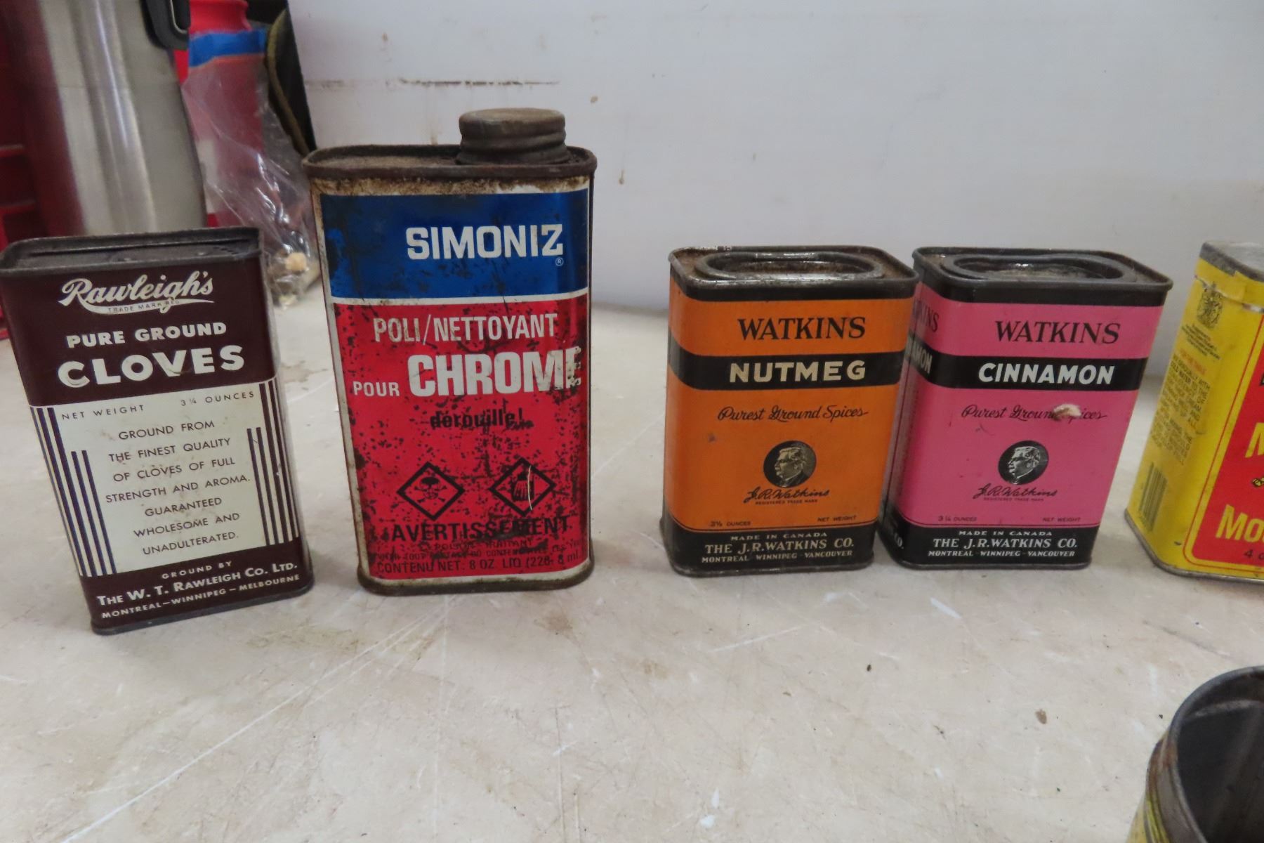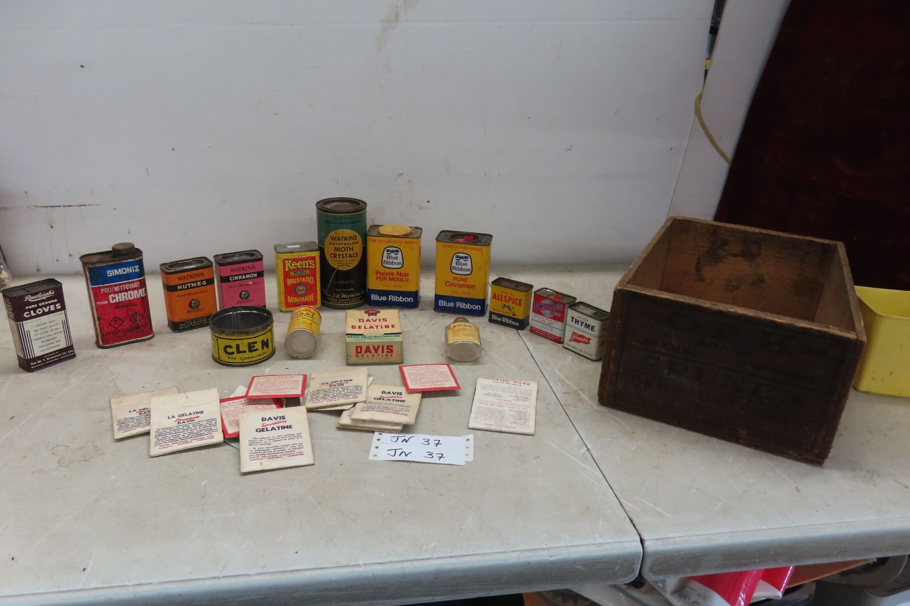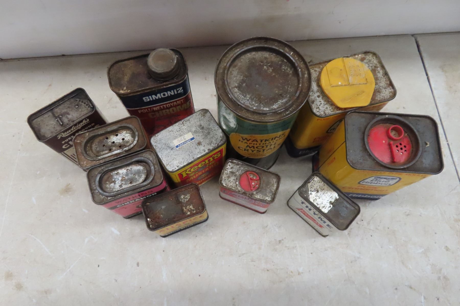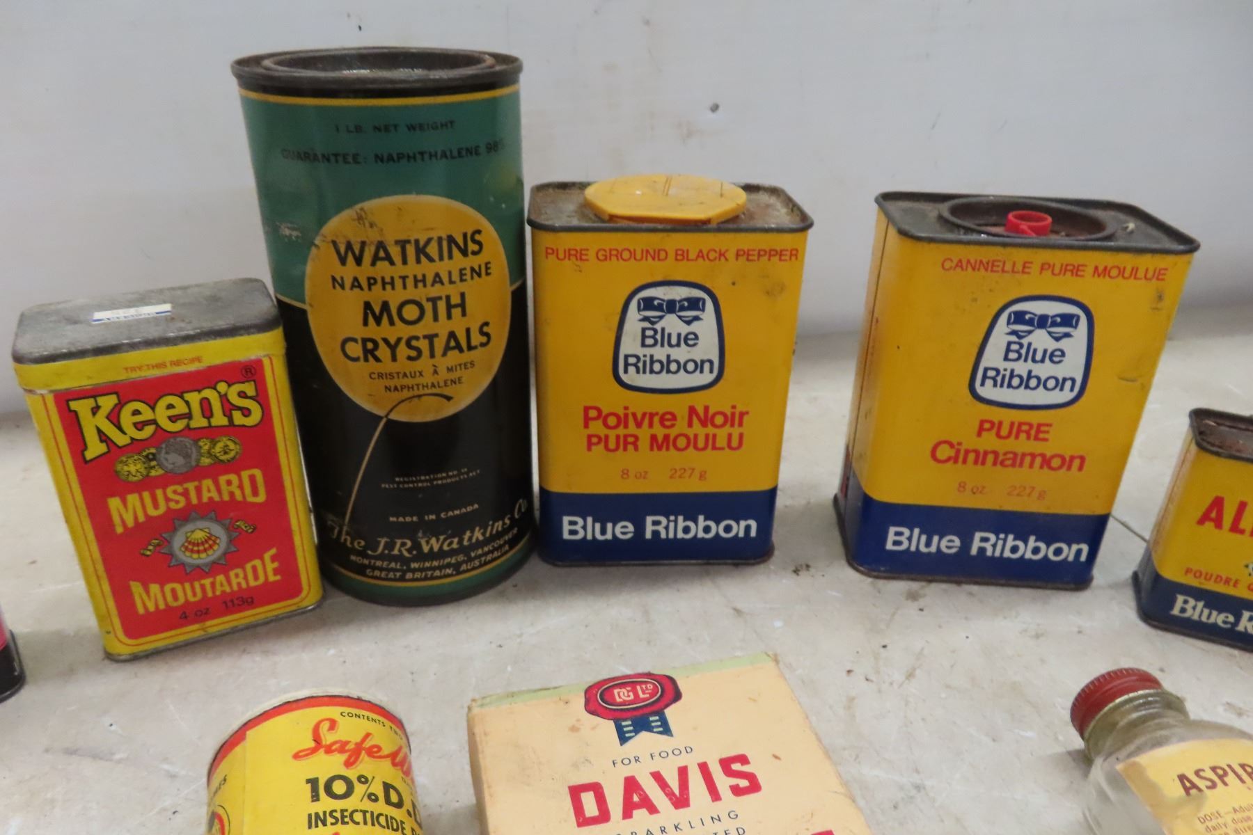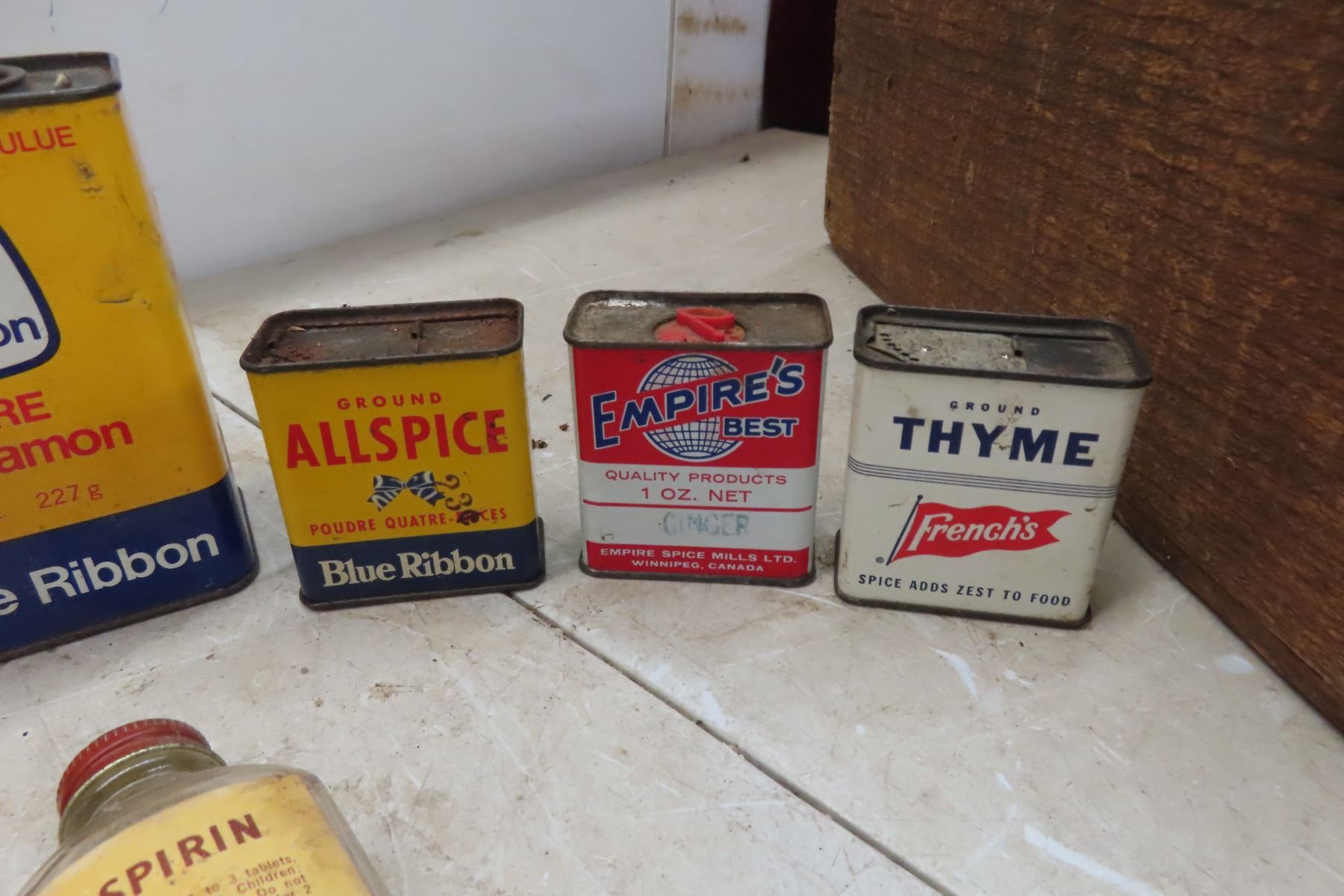 Vintage Spice Tins, Moth Crystals, Gelatin Packs, Asprin Bottle