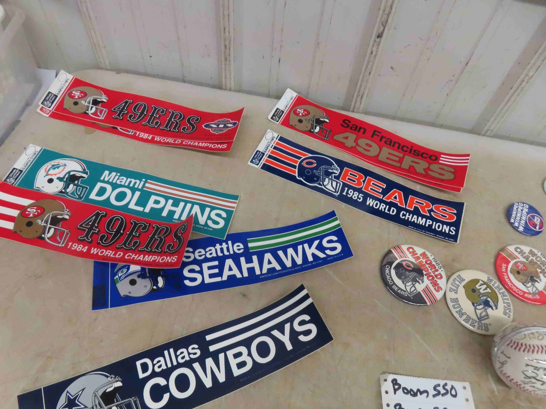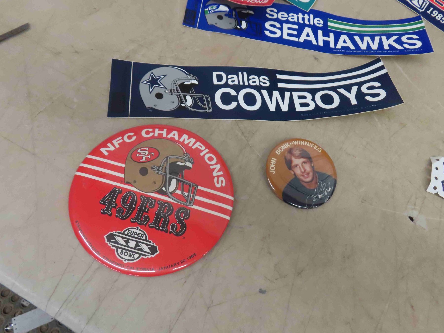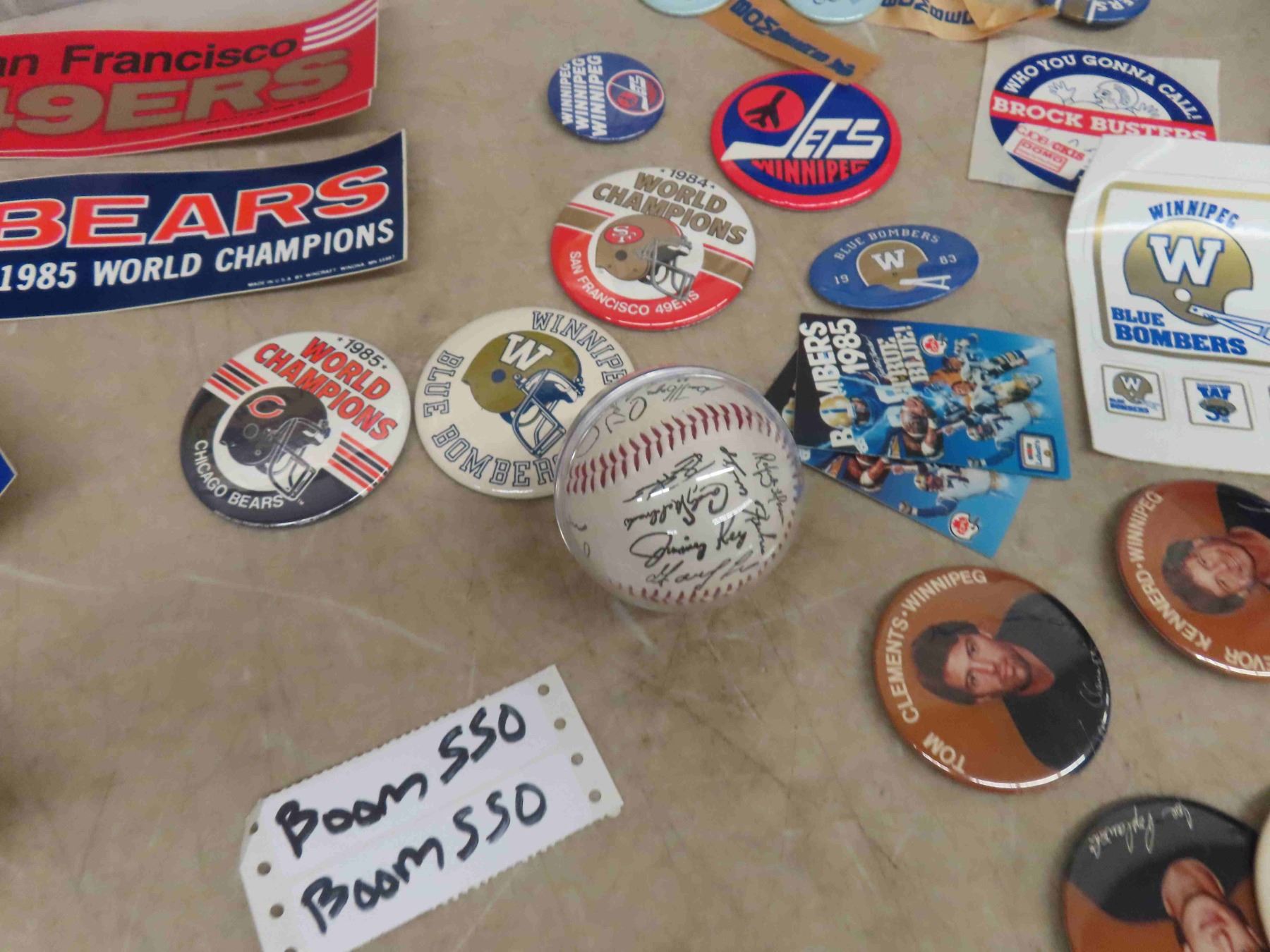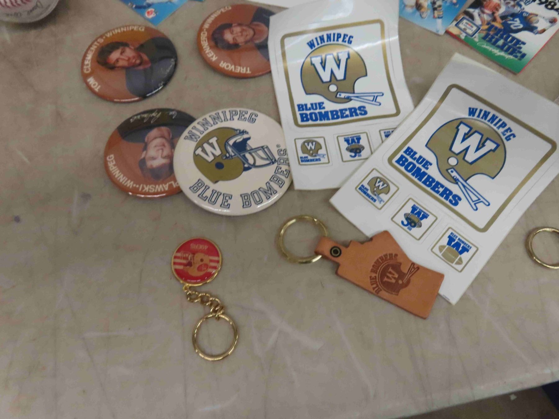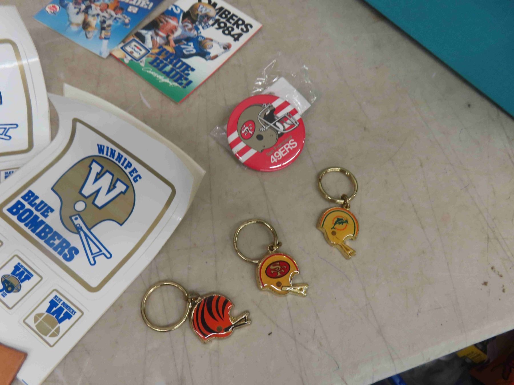 Vintage Sports Related Swag 1980s ; Blue Bombers, WPG Jets, NFL, plus others : Buttons, Stickers, Key Chains