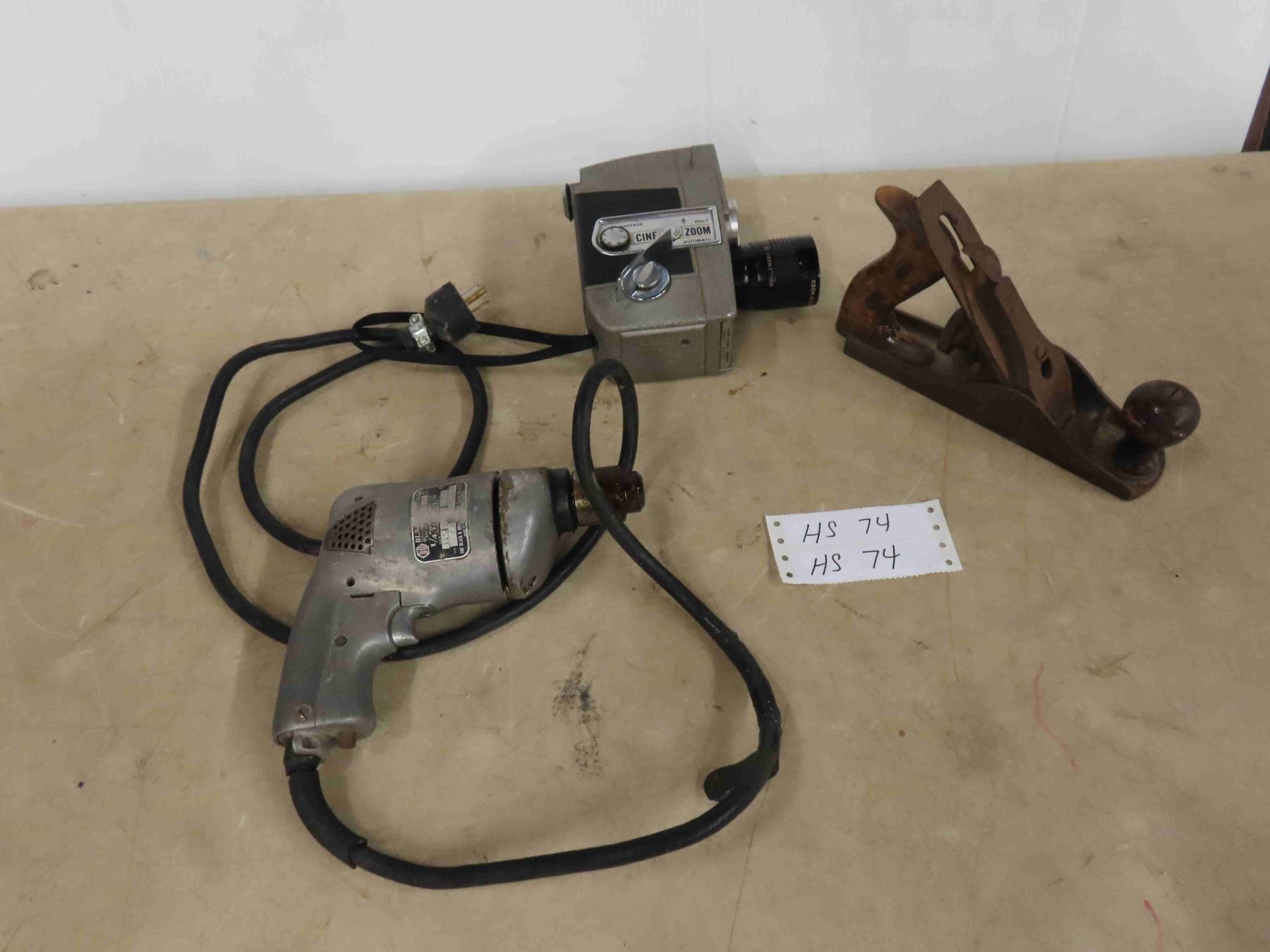 Vintage Stanley Planer , Black and Decker Power 1/4'' Drill , Revere Eye Matic Movie Camera
