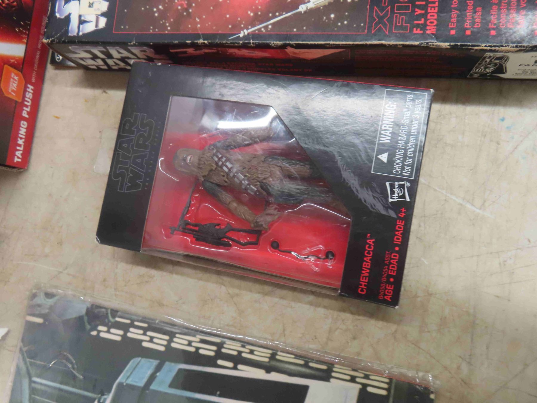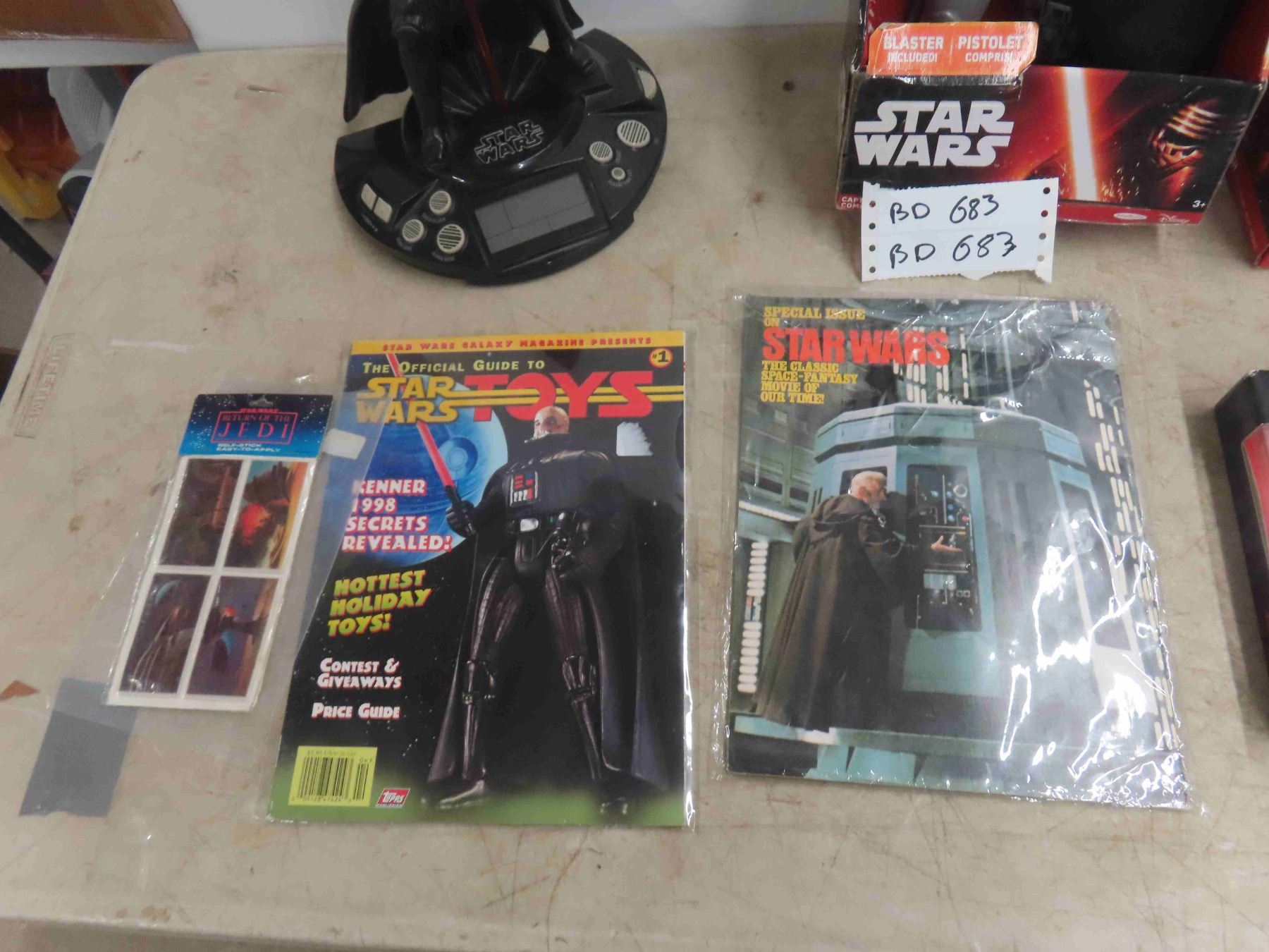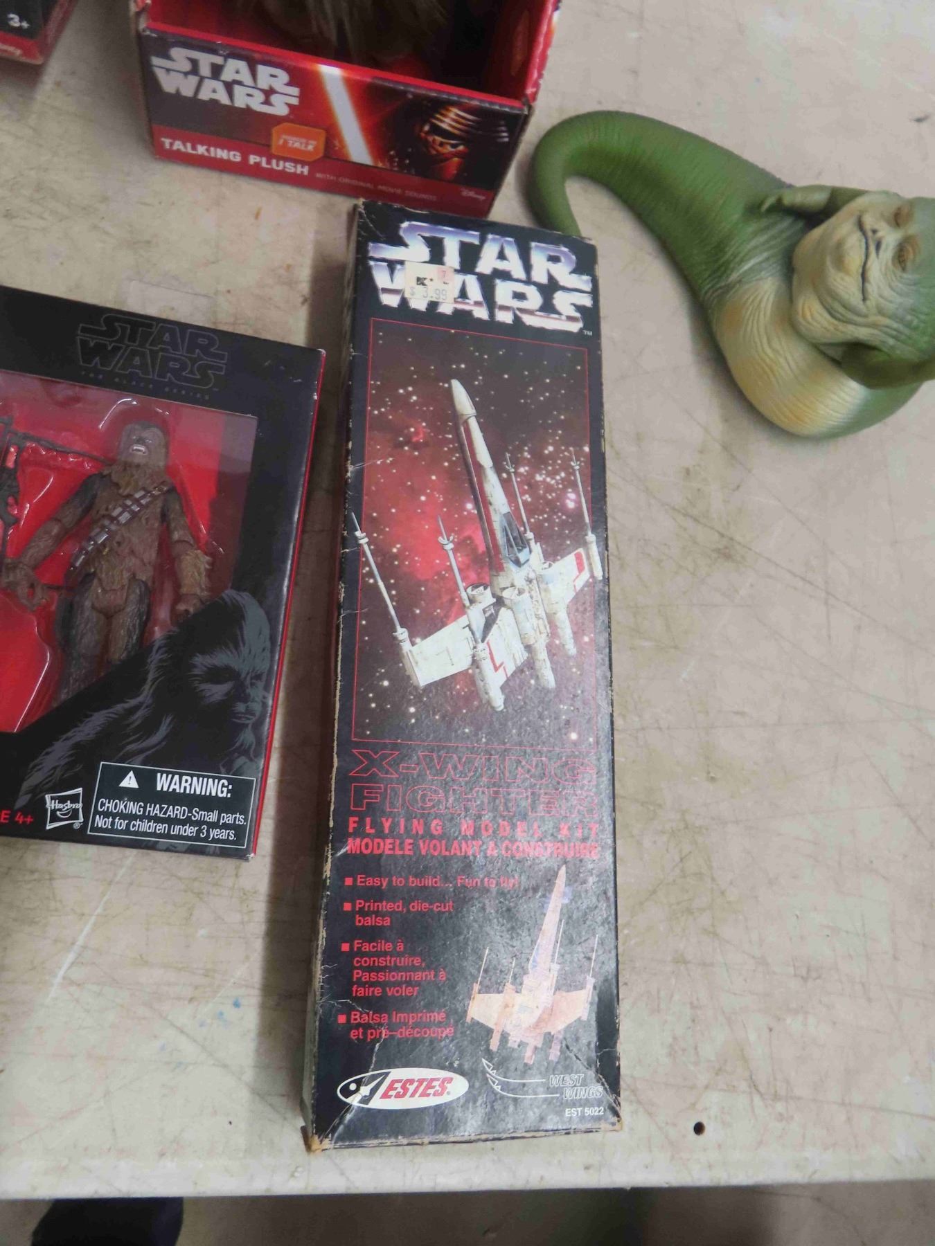 Vintage Star Wars Lot ; Darth Vadar Alarm Clock, Chewbacca Talking Plush, Captain Phasma Large Figurine 19" , Jabba The Hutt Dispenser, X-Wing Fighter Model Kit, 2 Magazines, 2 Vintage Puffy Sticker Packages, Chewy Action Figure