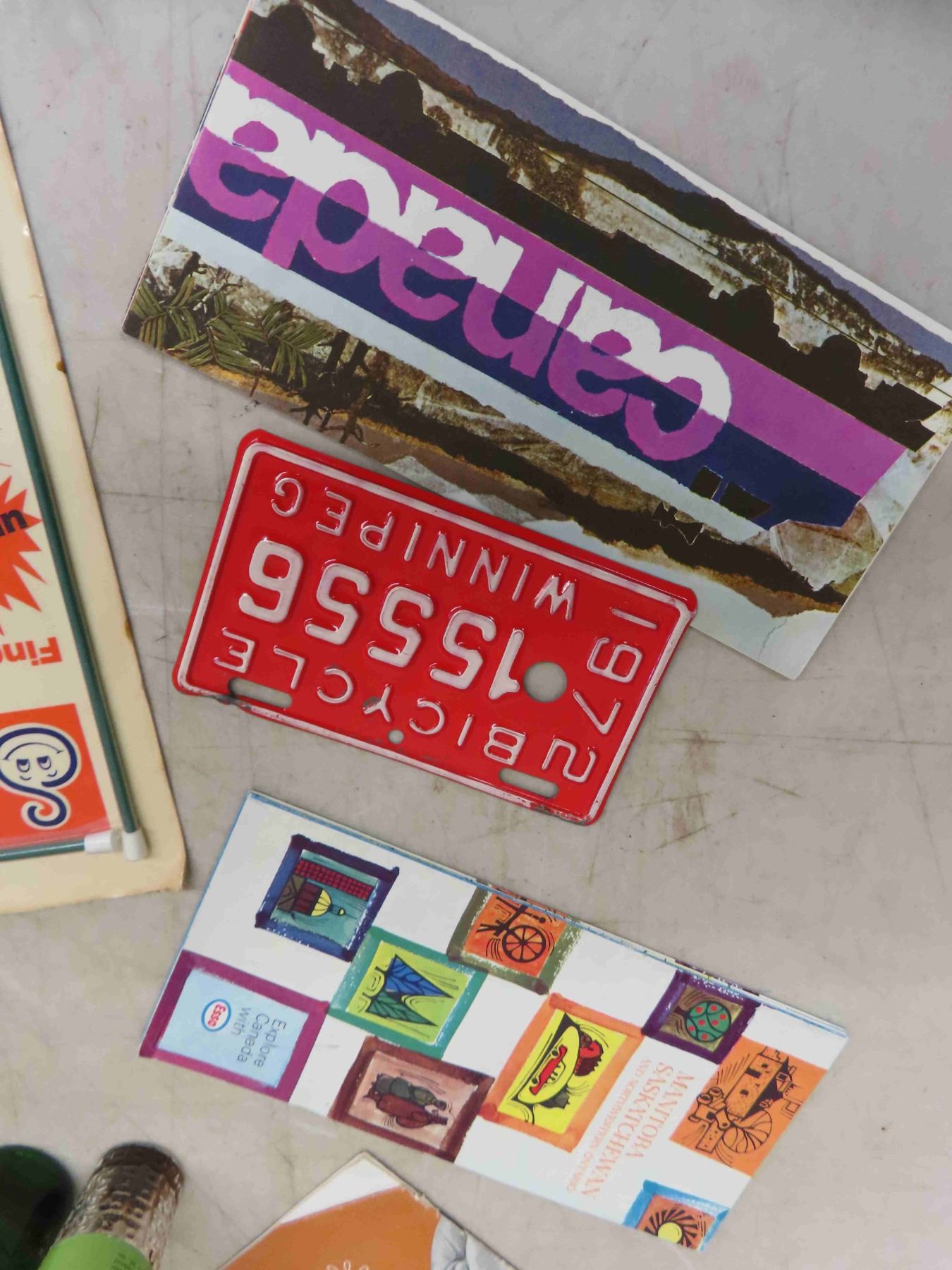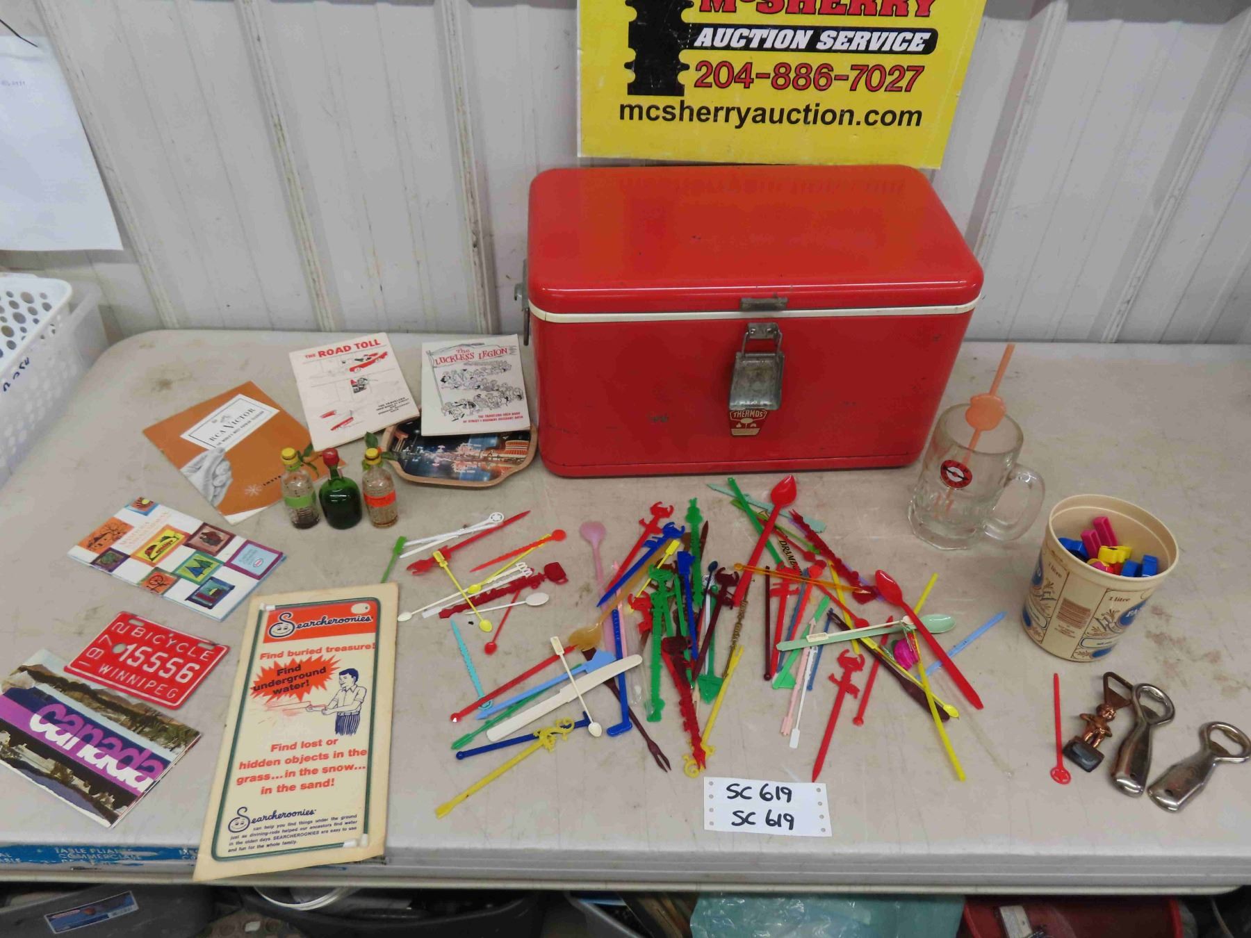 Vintage Thermos Cooler, Swizzle Sticks, Coke Spoons, Travellers Road Toll Data Books, Maps, 1972 Bike Plate, A&W Mug + Root beer Head Straw, plus more