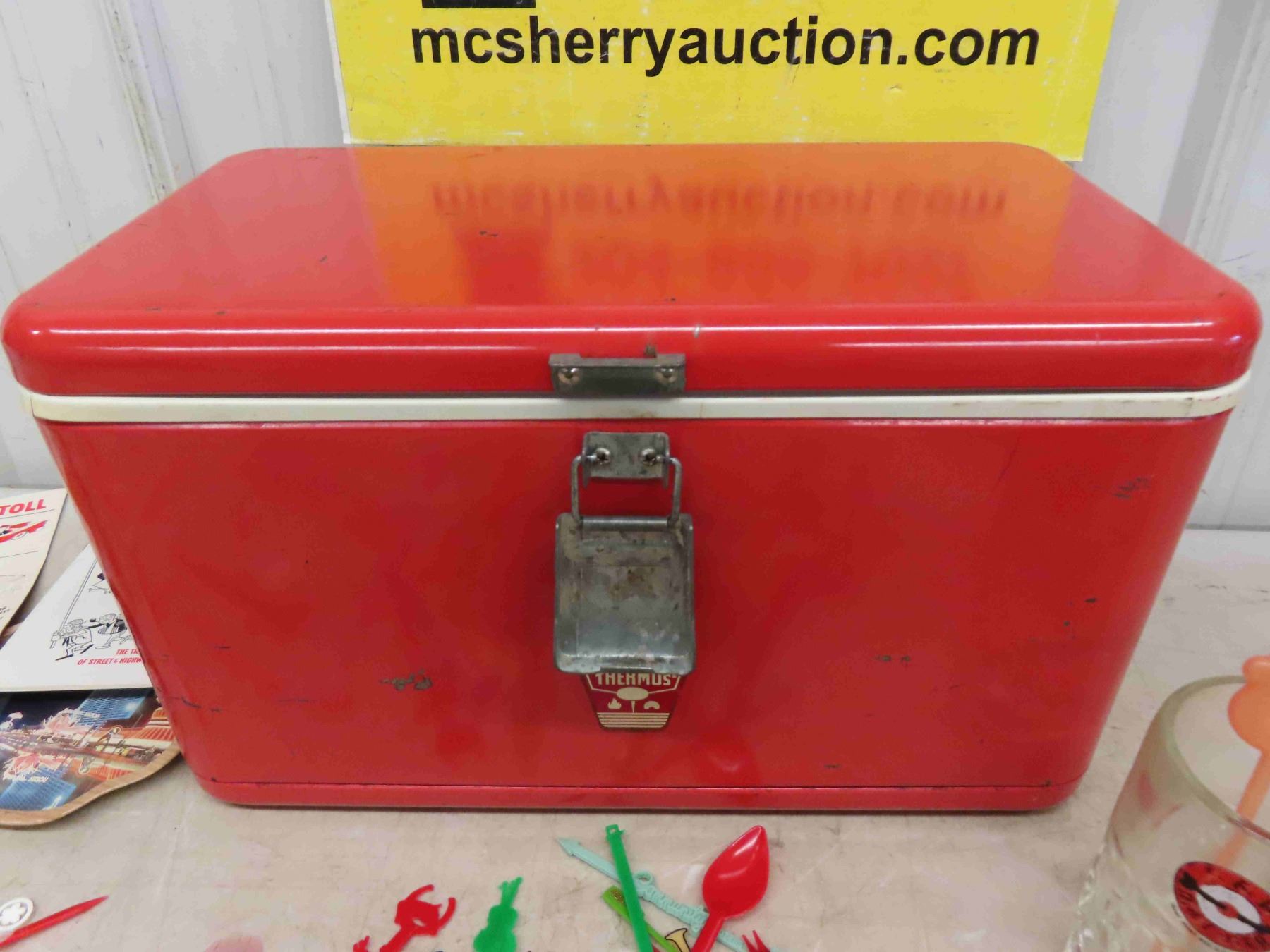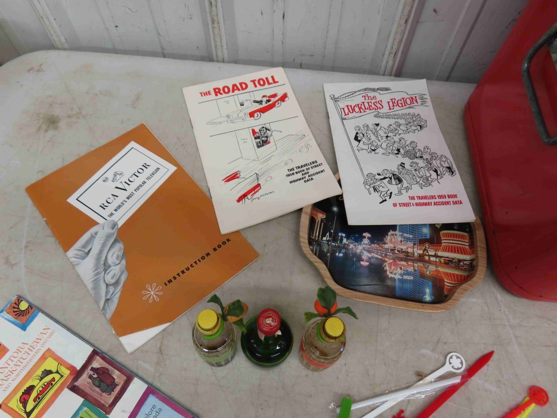Vintage Thermos Cooler, Swizzle Sticks, Coke Spoons, Travellers Road Toll Data Books,