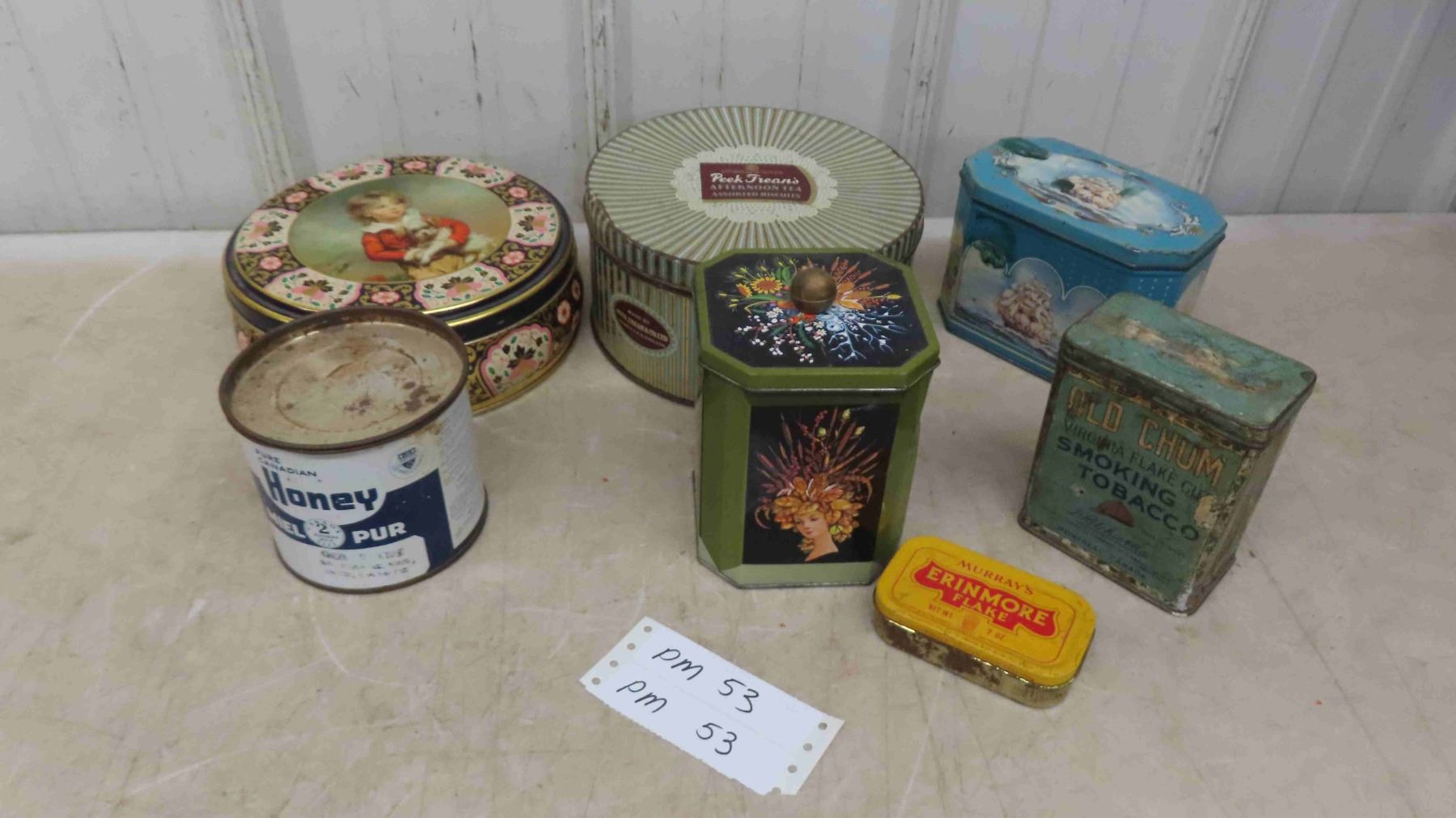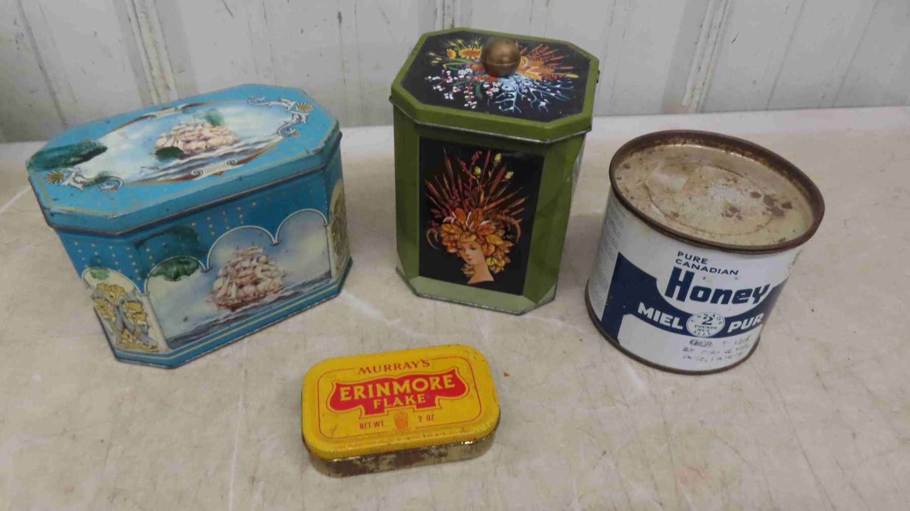 Vintage Tins ; Old Chum Smoking Tobacco, Pure Canadian Honey, Biscuits, plus more