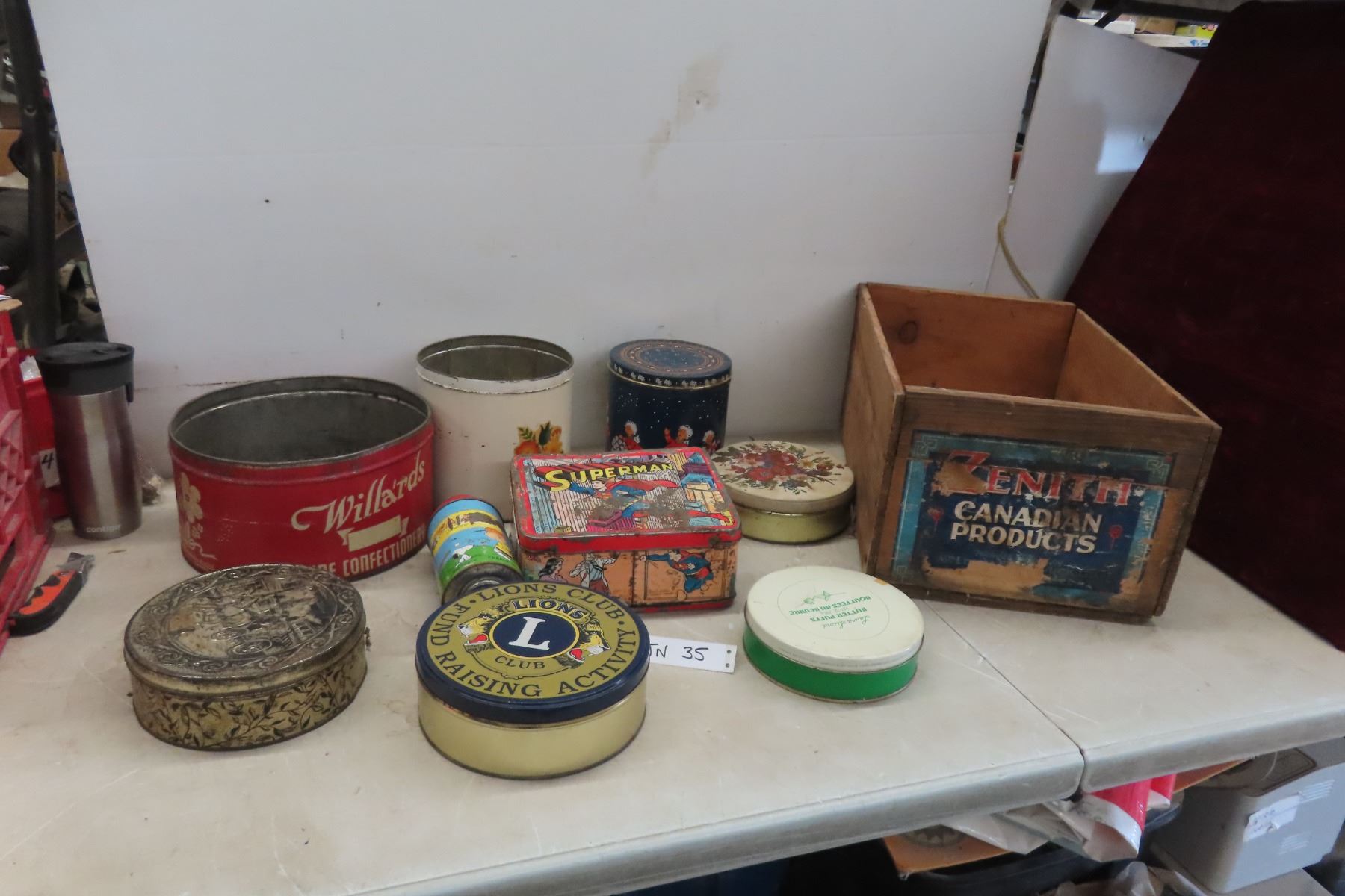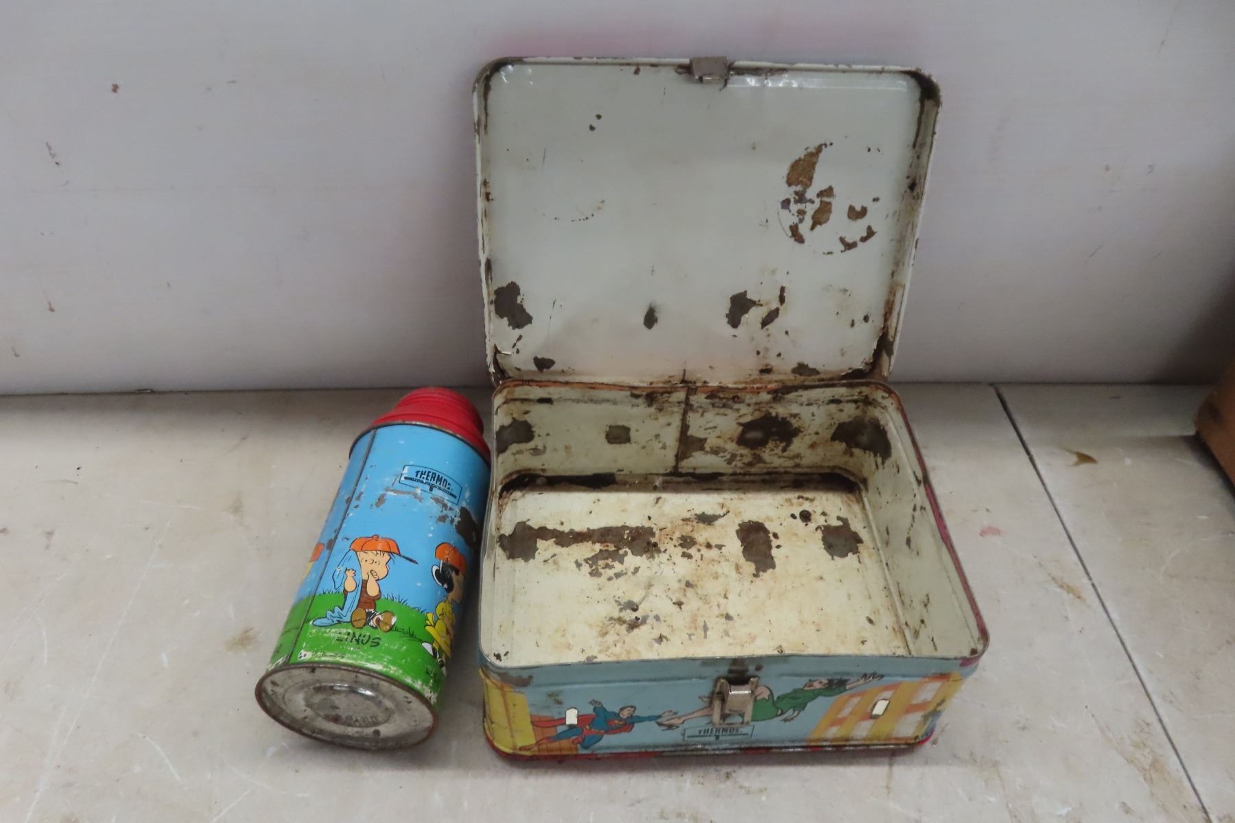 Vintage Tins, Wood Crate, Distressed Superman Metal Lunch Box, Distressed Peanuts Thermos