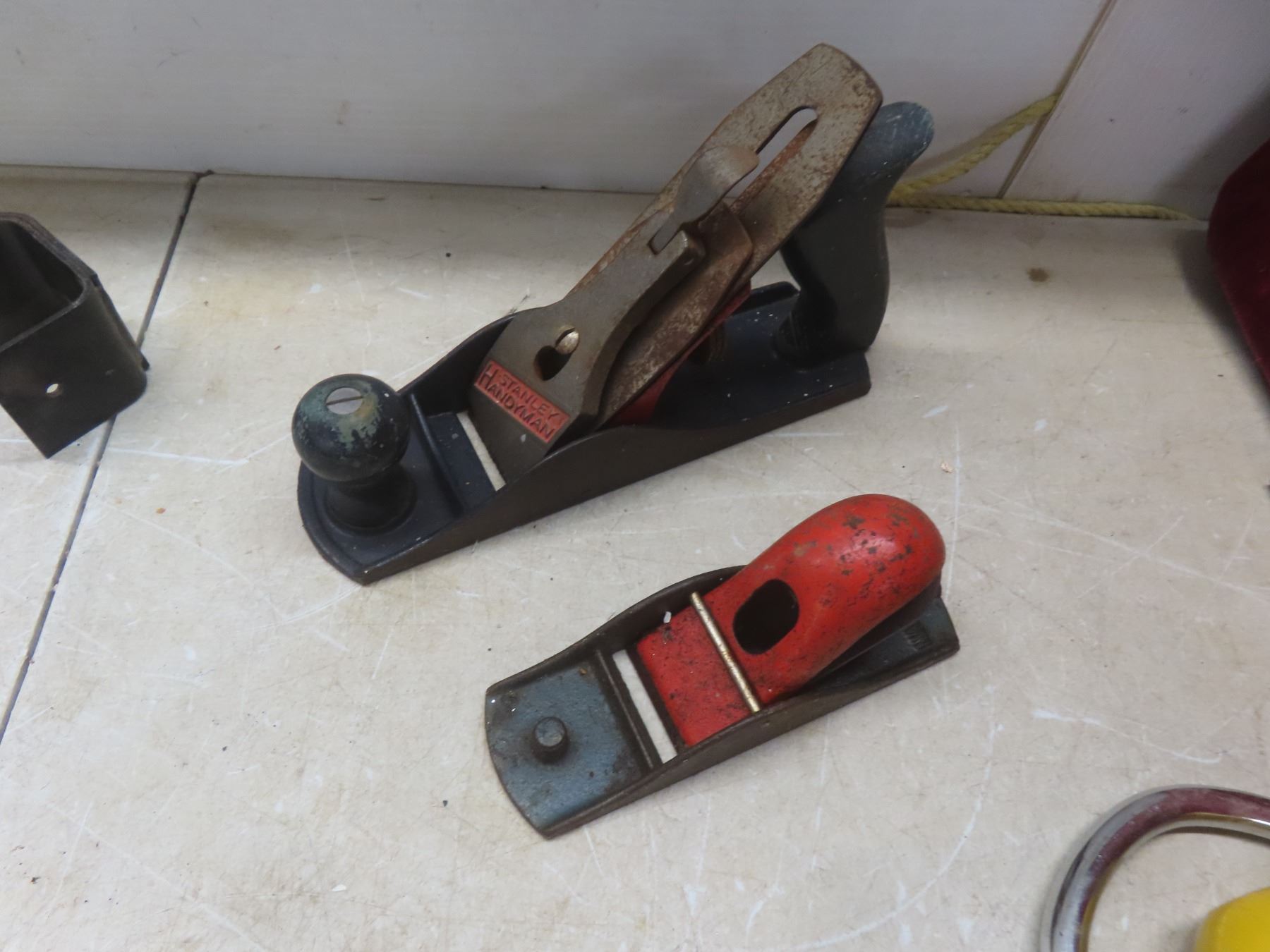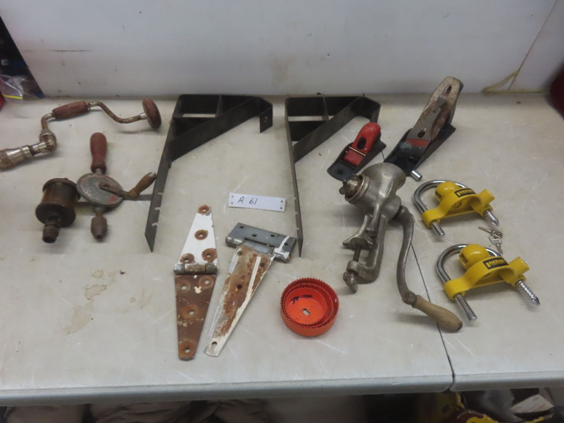 Vintage Tools Including Drills, Planes, Engine Oiler, Meat Grinder, Planer Blades, Tow Balls, and More