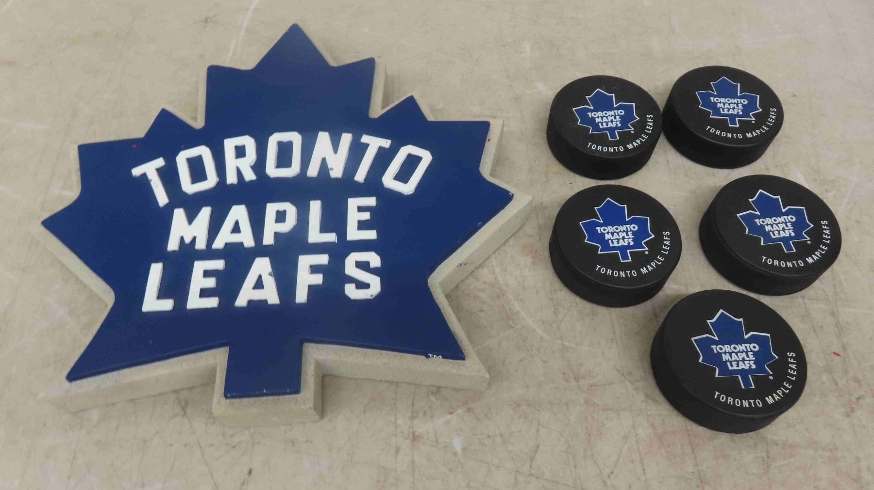 Vintage Toronto Maple Leafs Heavy Molded Logo Plaque with Raised Lettering and Leal 12'' x 12'' , NHL Licensed & Excellent Condition - 5 Hall of Fame Pucks : 2 Baun, 2 Barilko, Sittler