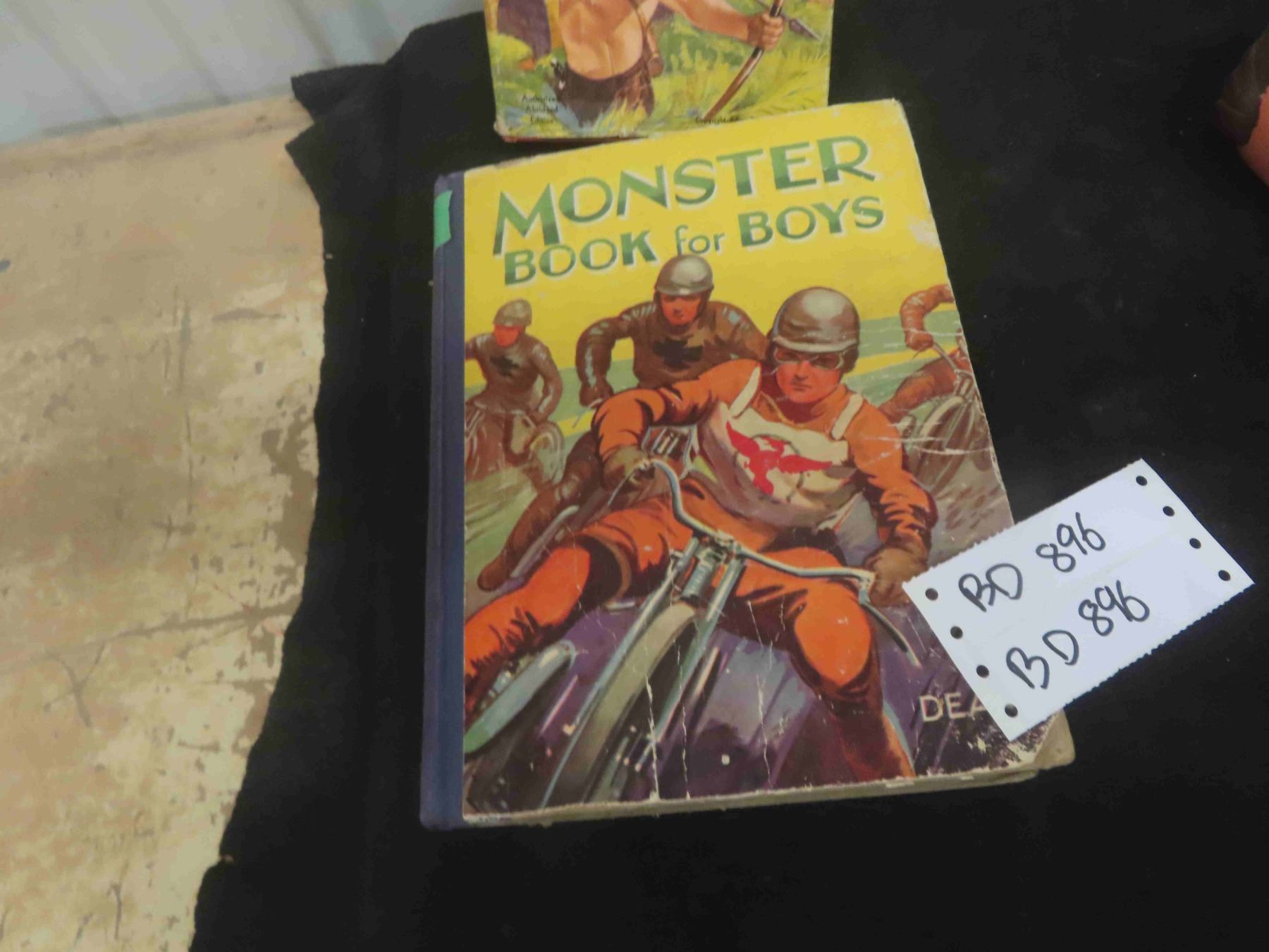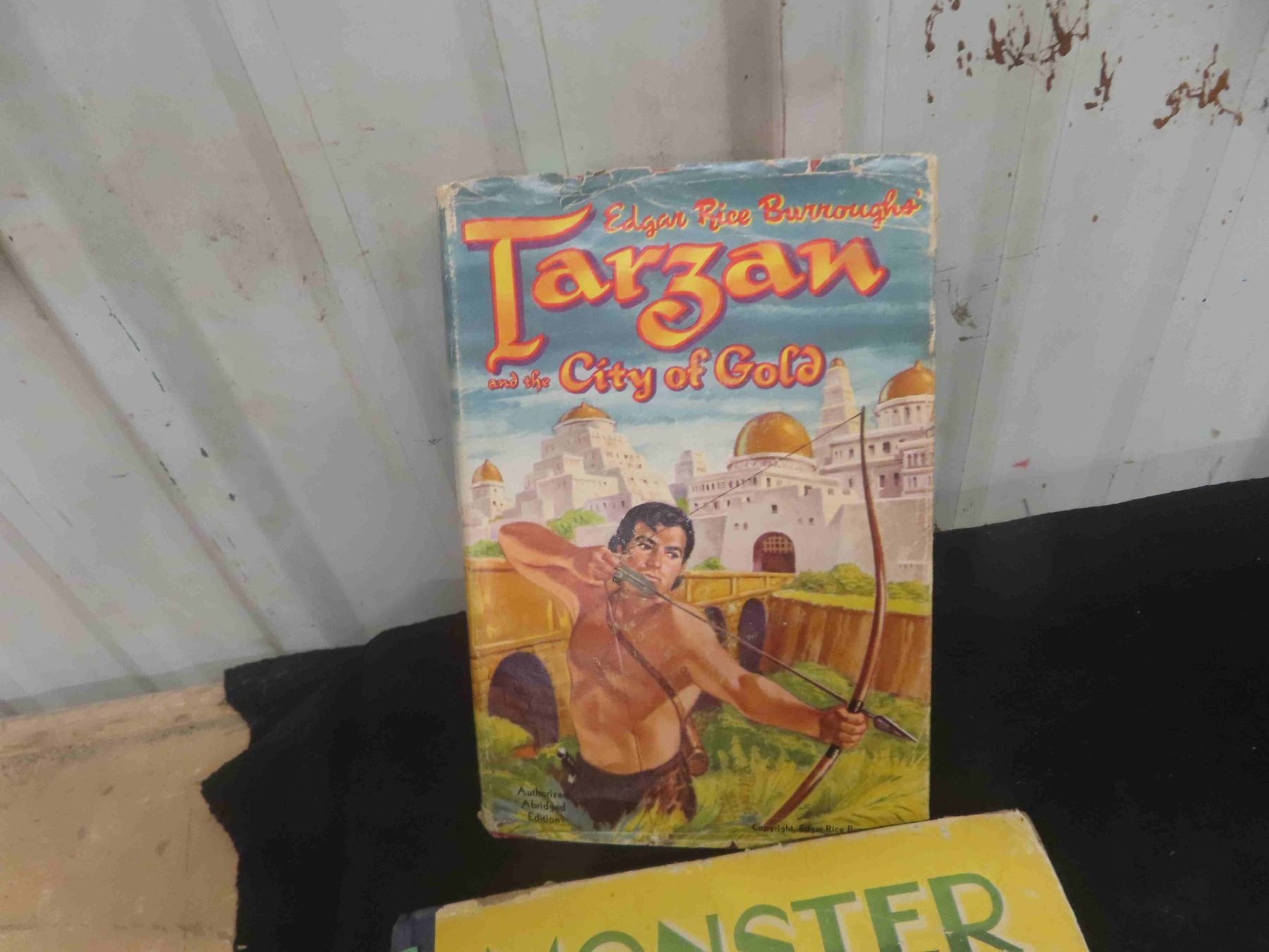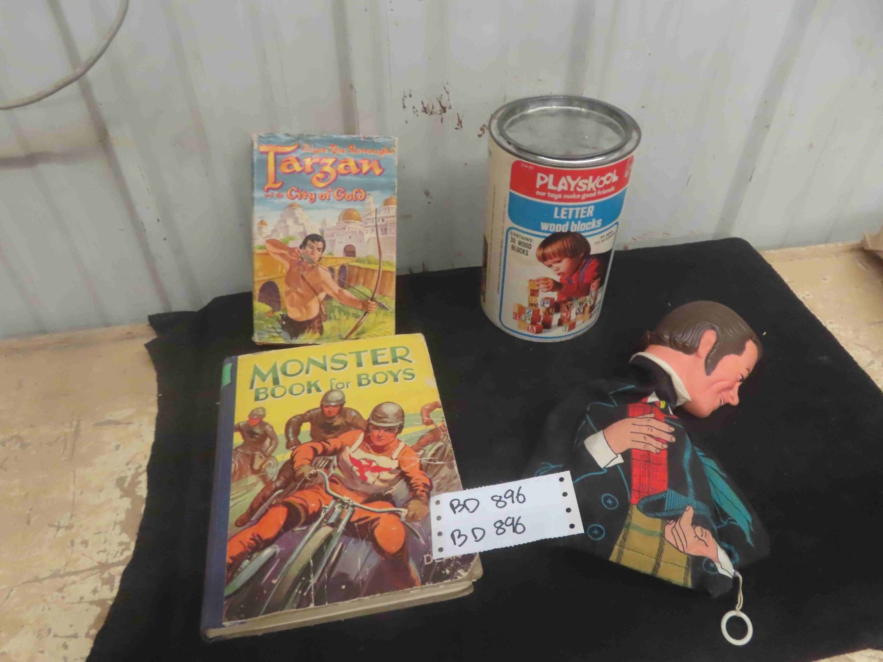 Vintage Toy Lot ; Playskool Wooden Blocks, Dr. Dolittle Puppet, Tarzan book with Dust Jacket, Monster Book for Boys