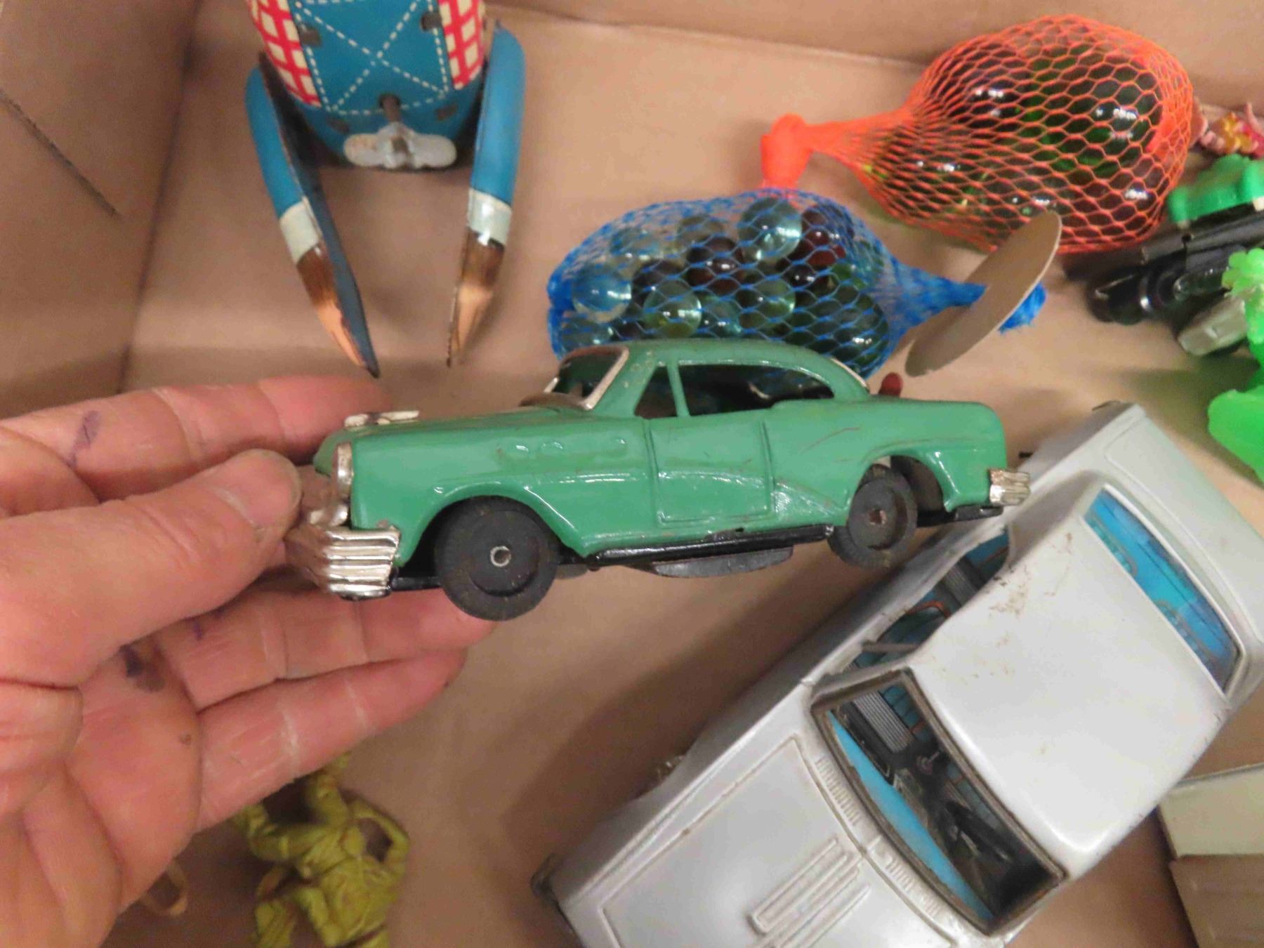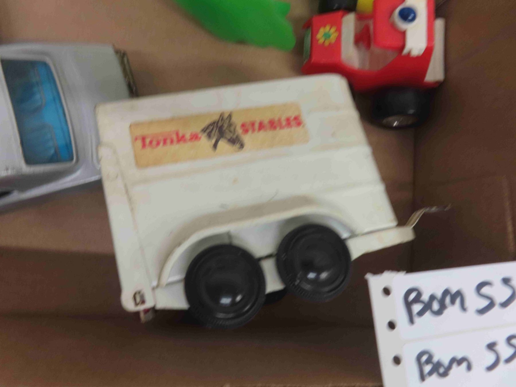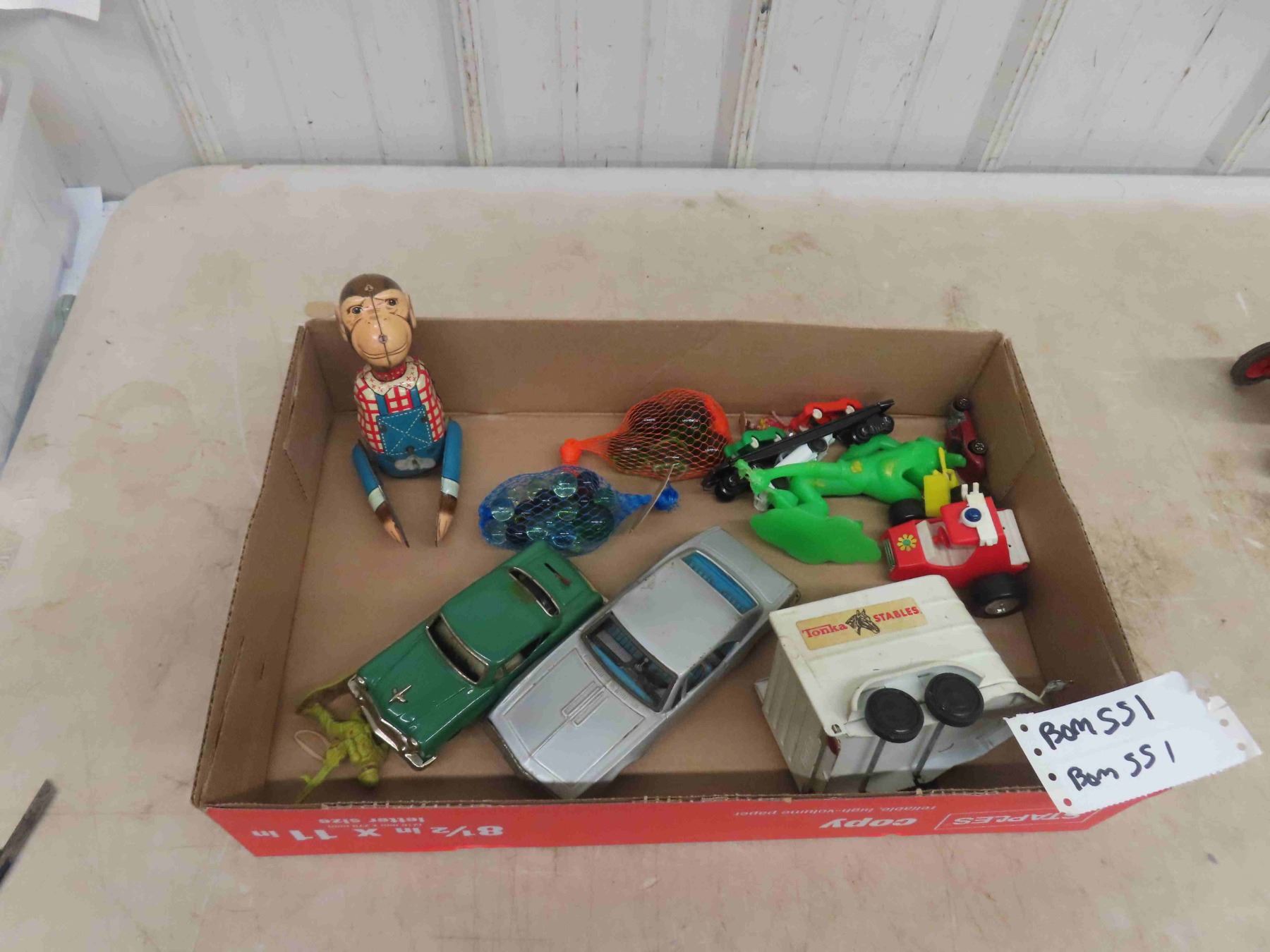 Vintage Toys ; Tin Japan Cars, Tonka Trailer, Metal Tin Wind Up Monkey - no arms