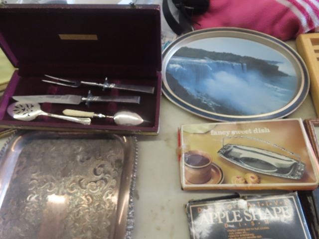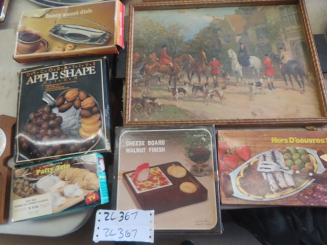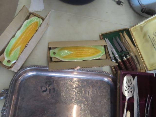 Vintage Trays, Cutting Boards, Knives, Corn Holders, Serving Dishes, Metal Baking Pans