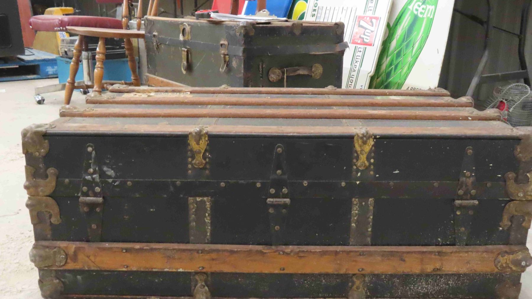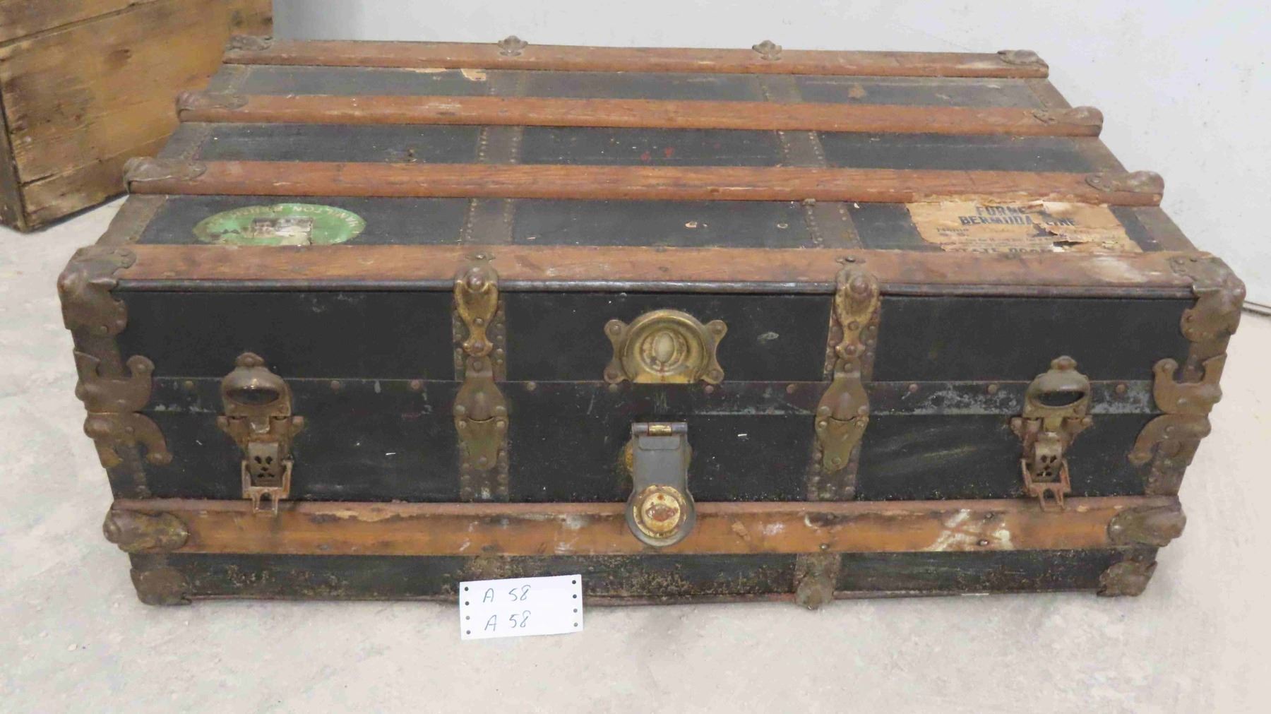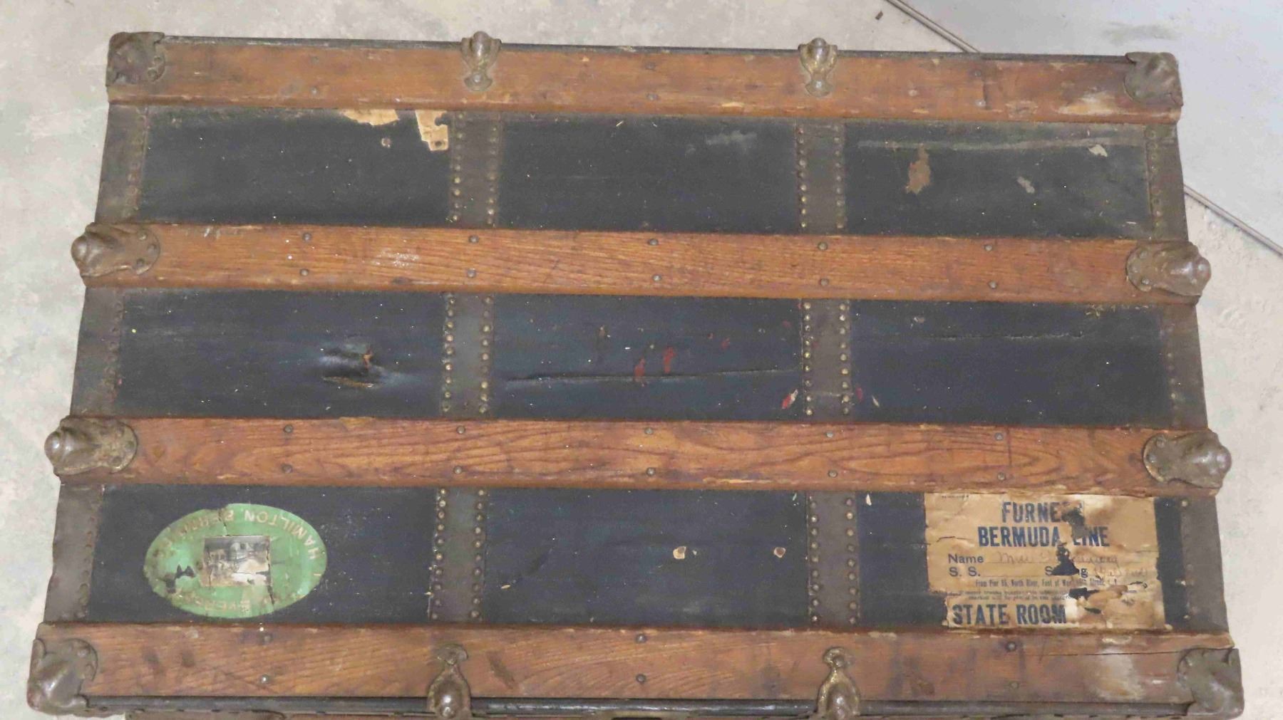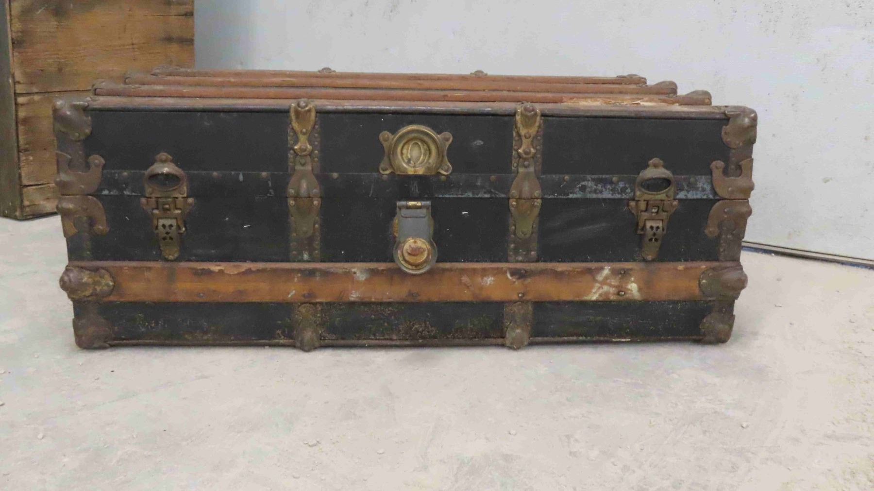 Vintage Trunk 13" x 22" x 36" with Brass + Wood Trim & Leather Handles