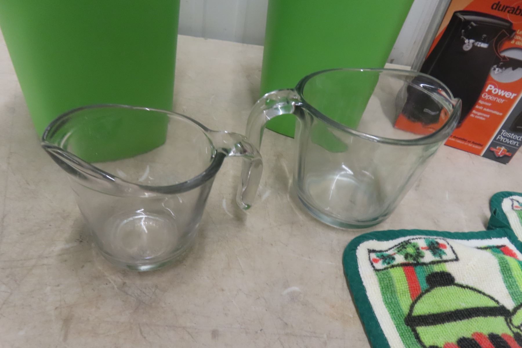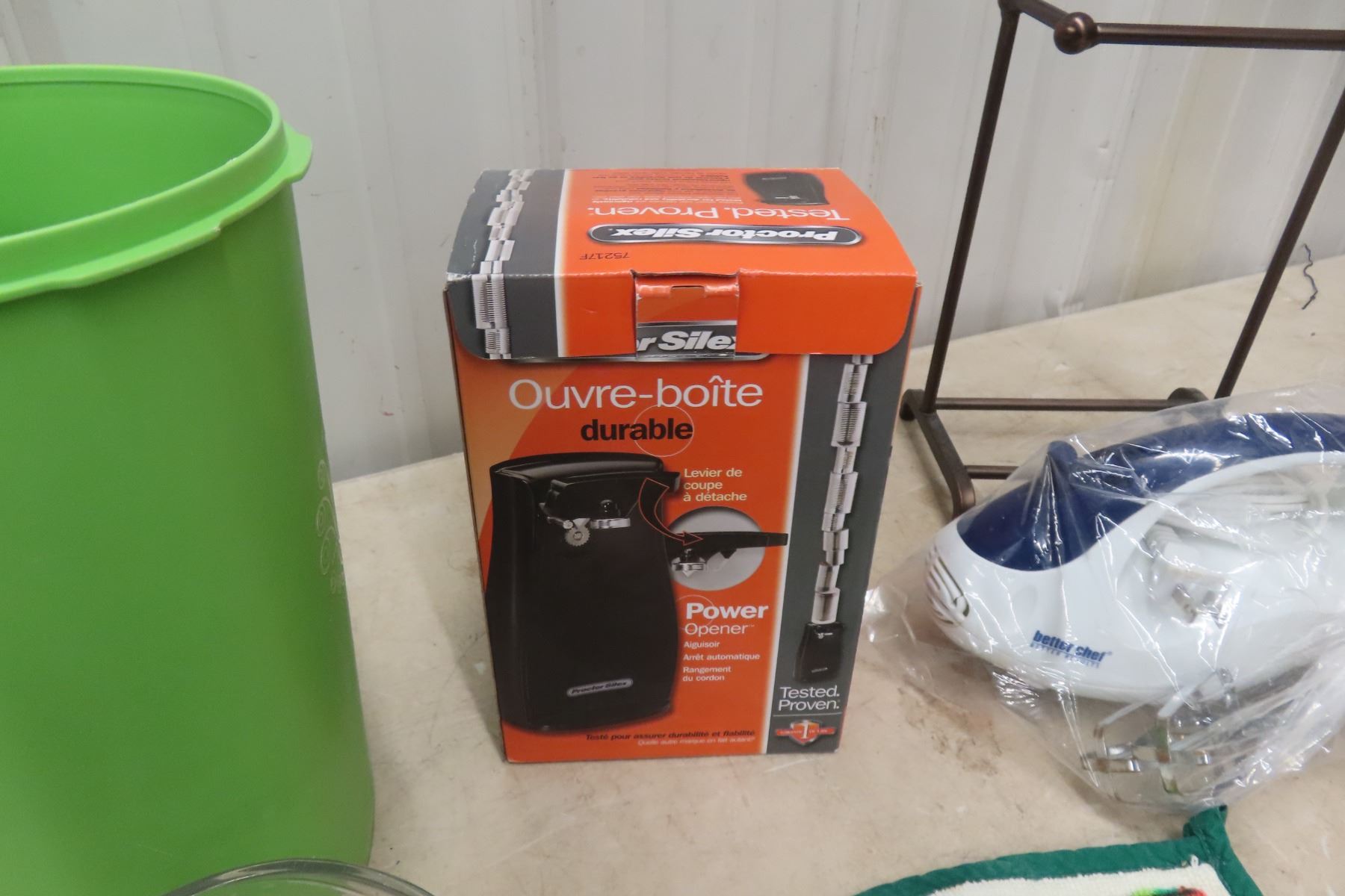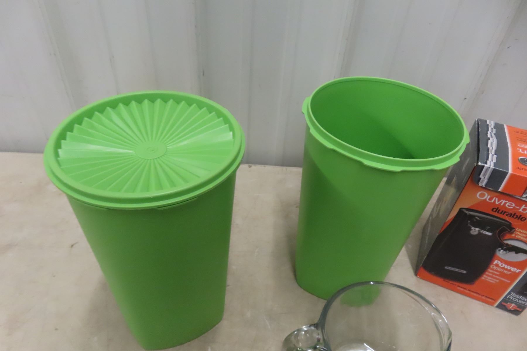 Vintage Tupperware Canister, Can Opener, Measuring Bowls, New Electric Mixer & More