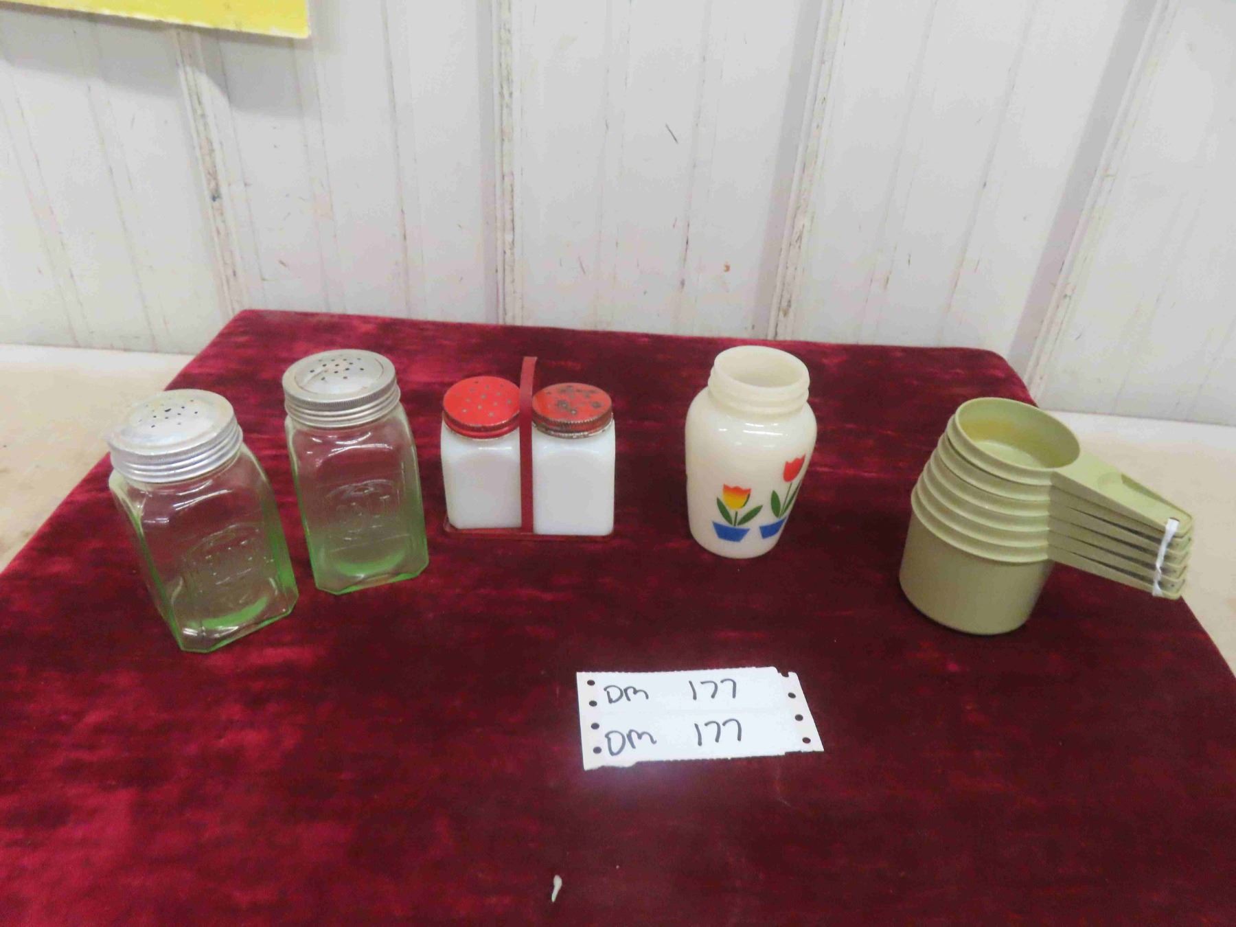 Vintage Tupperware, Measuring Glass, Salt/Peppers, Depression Glass, Milk Glass.