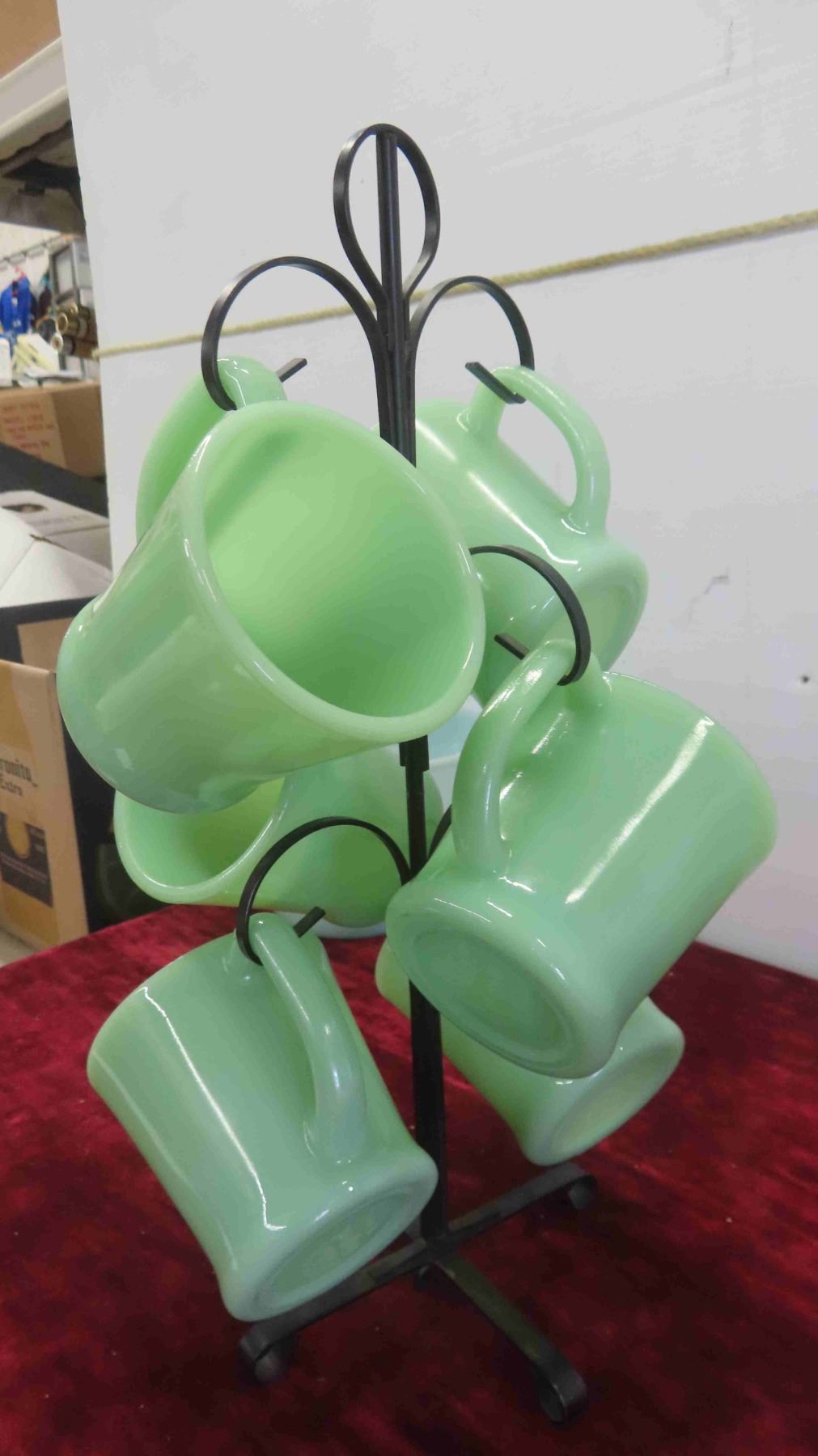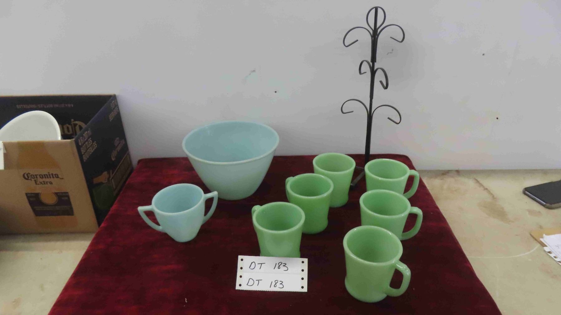 Vintage Turquoise Fireking Mixing Bowl, 6 Jadeite Mugs on Mug Tree