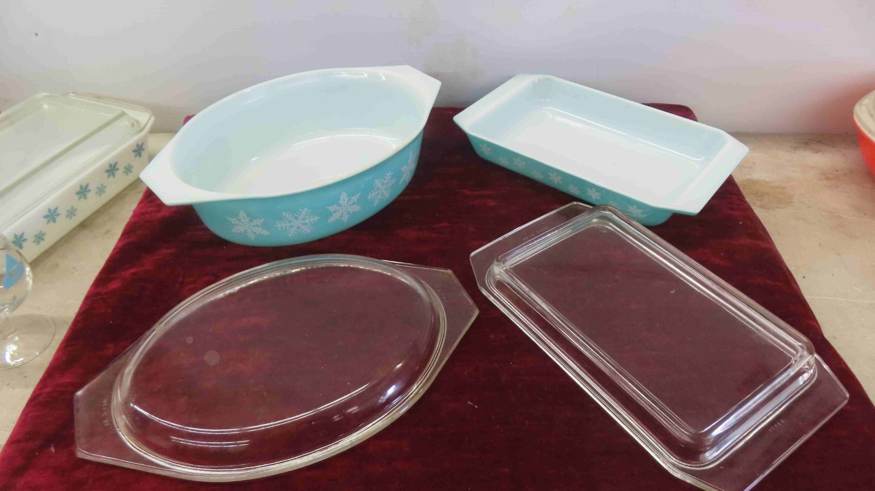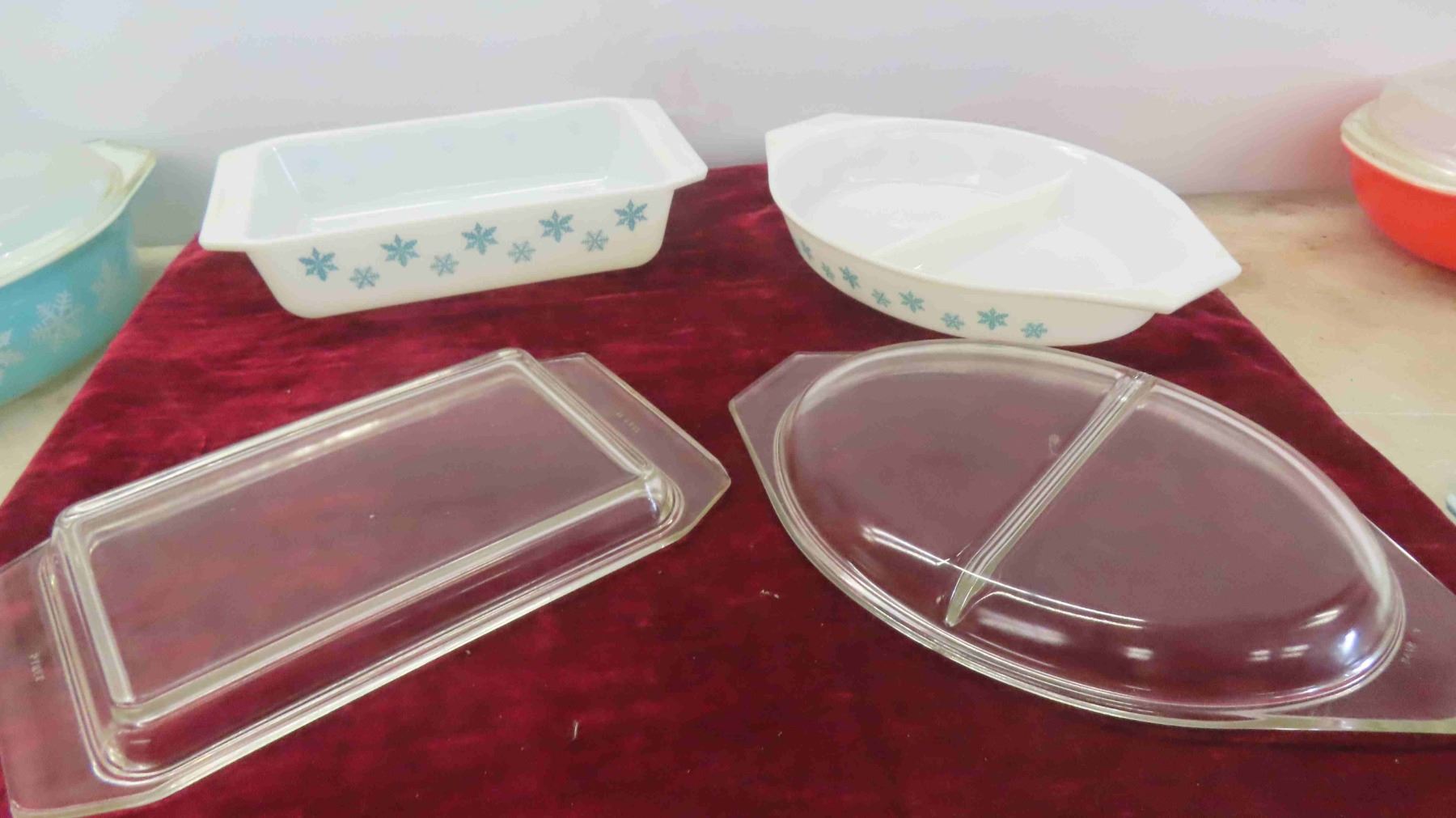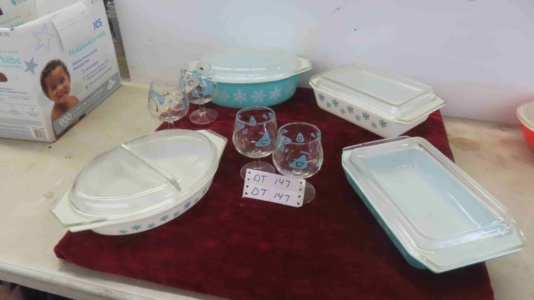 Vintage Turquoise Pyrex Snowflake Casserole 1.5 Divided, 2.5 Quart, 2 Space Savers, 4 Federal Amoeba Brandy Snifters
