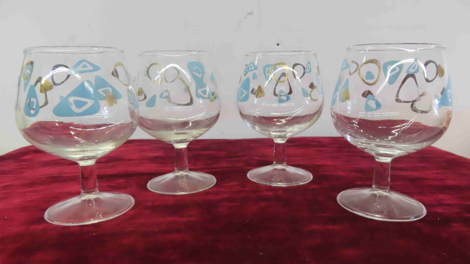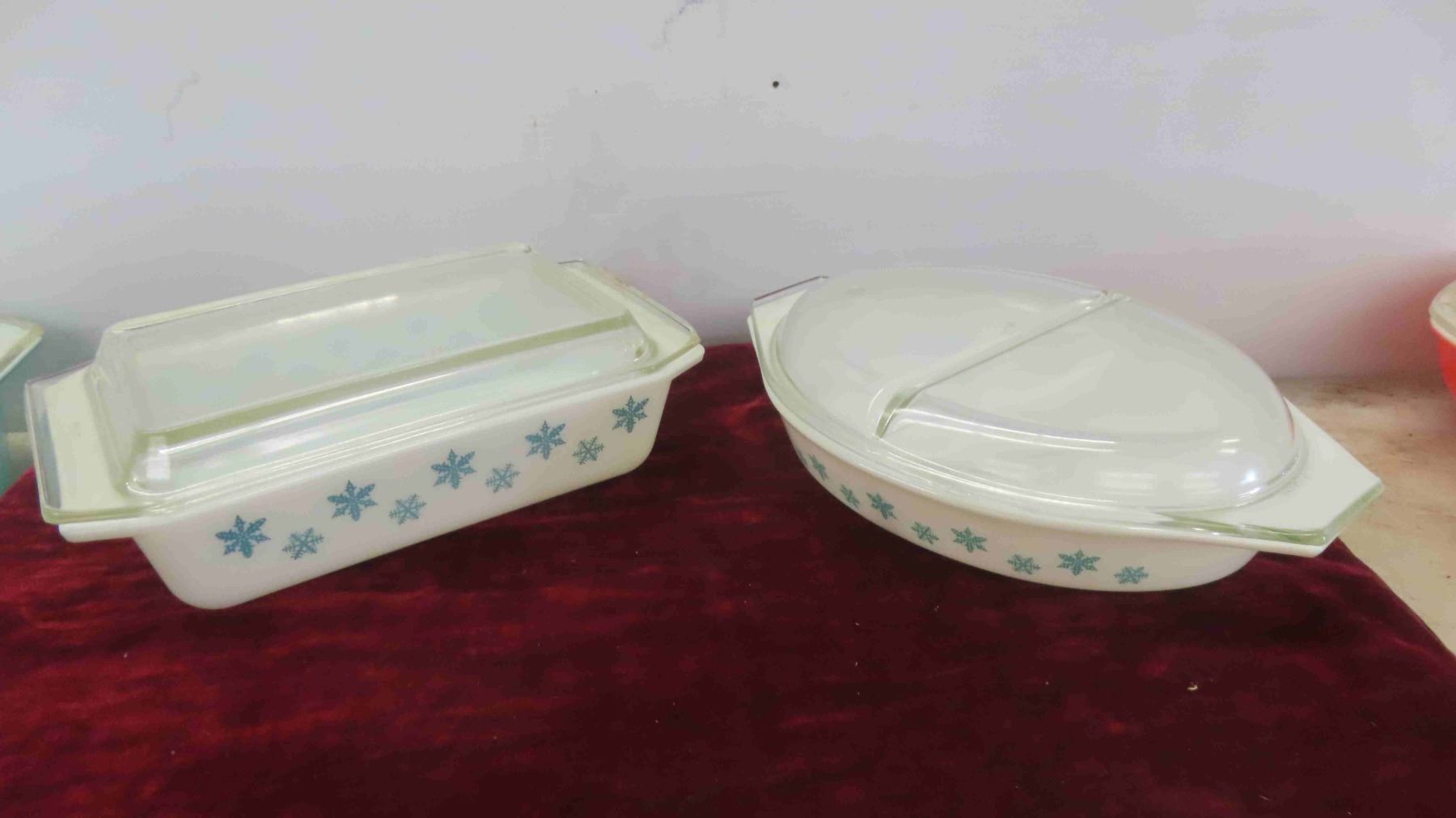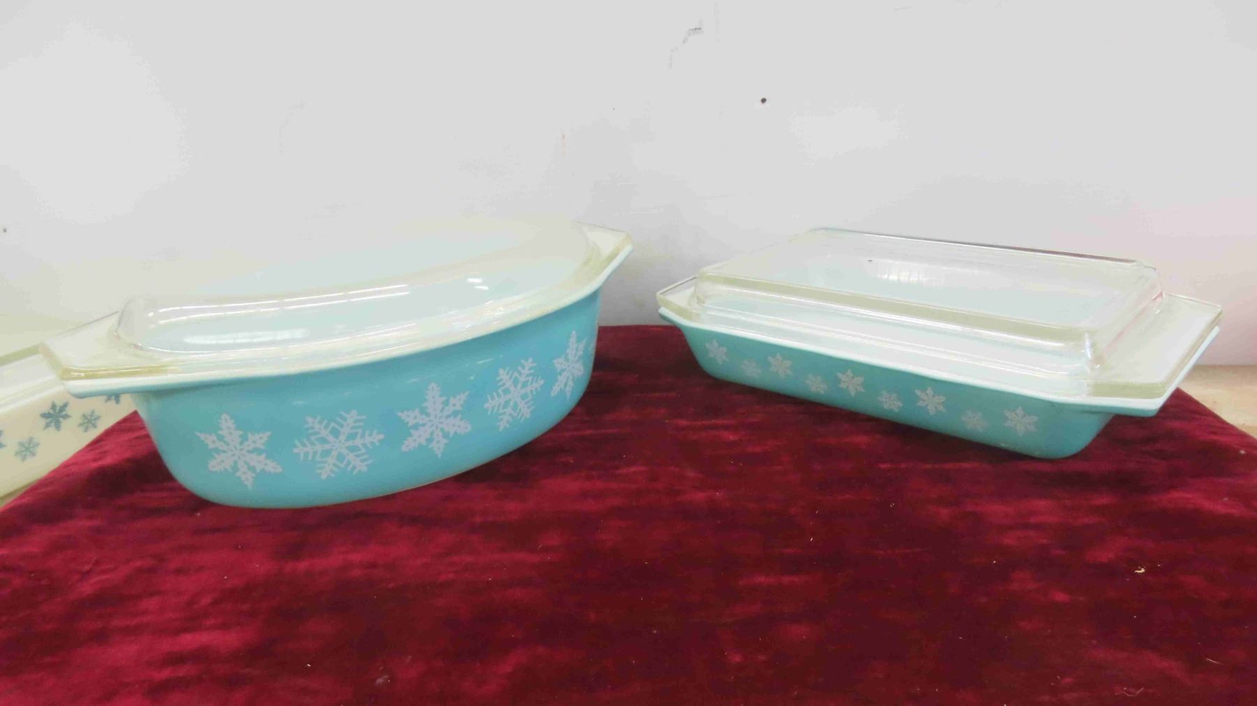 Vintage Turquoise Pyrex Snowflake Casserole 1.5 Divided, 2.5 Quart, 2 Space Savers, 4 Federal Amoeba Brandy Snifters