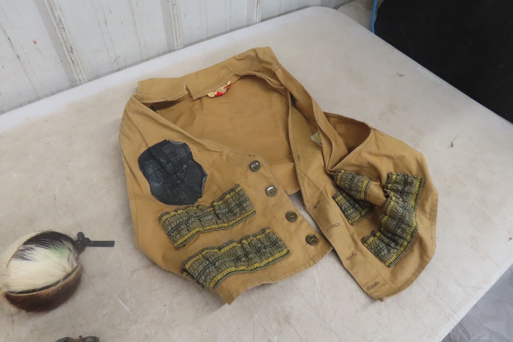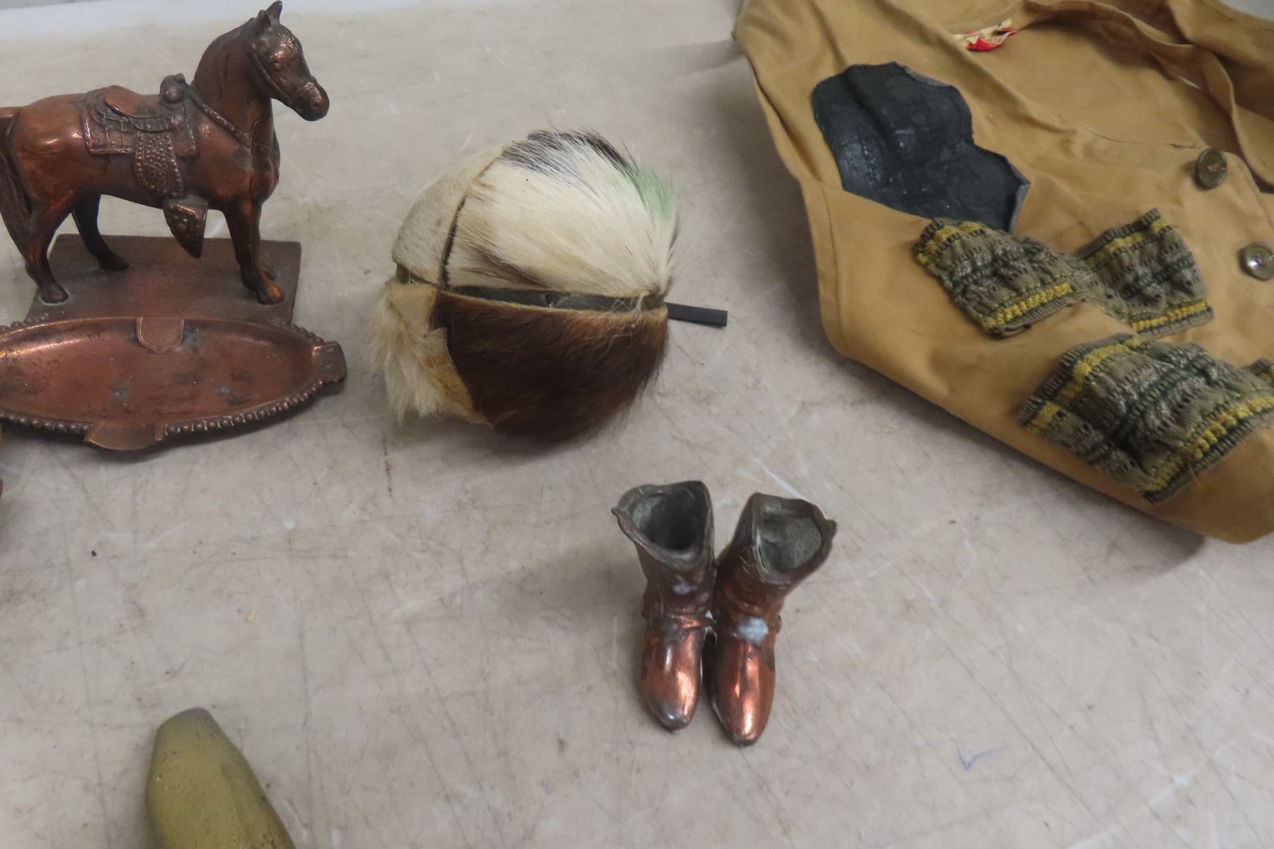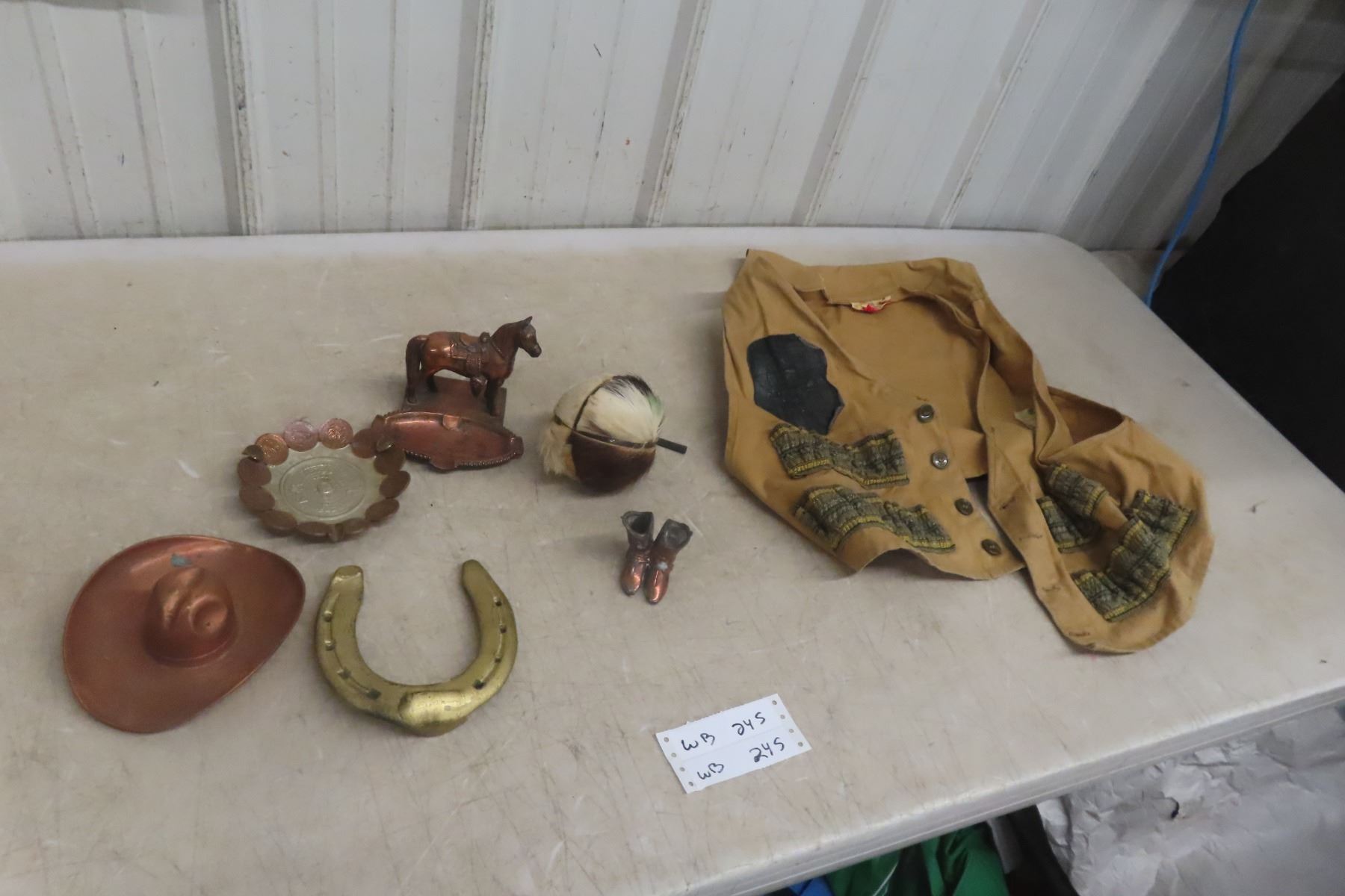 Vintage Western Décor Lot Including Ashtrays, Boots, Horseshoe, Medicine Bottle, and Woods Canvas Hunting Vest
