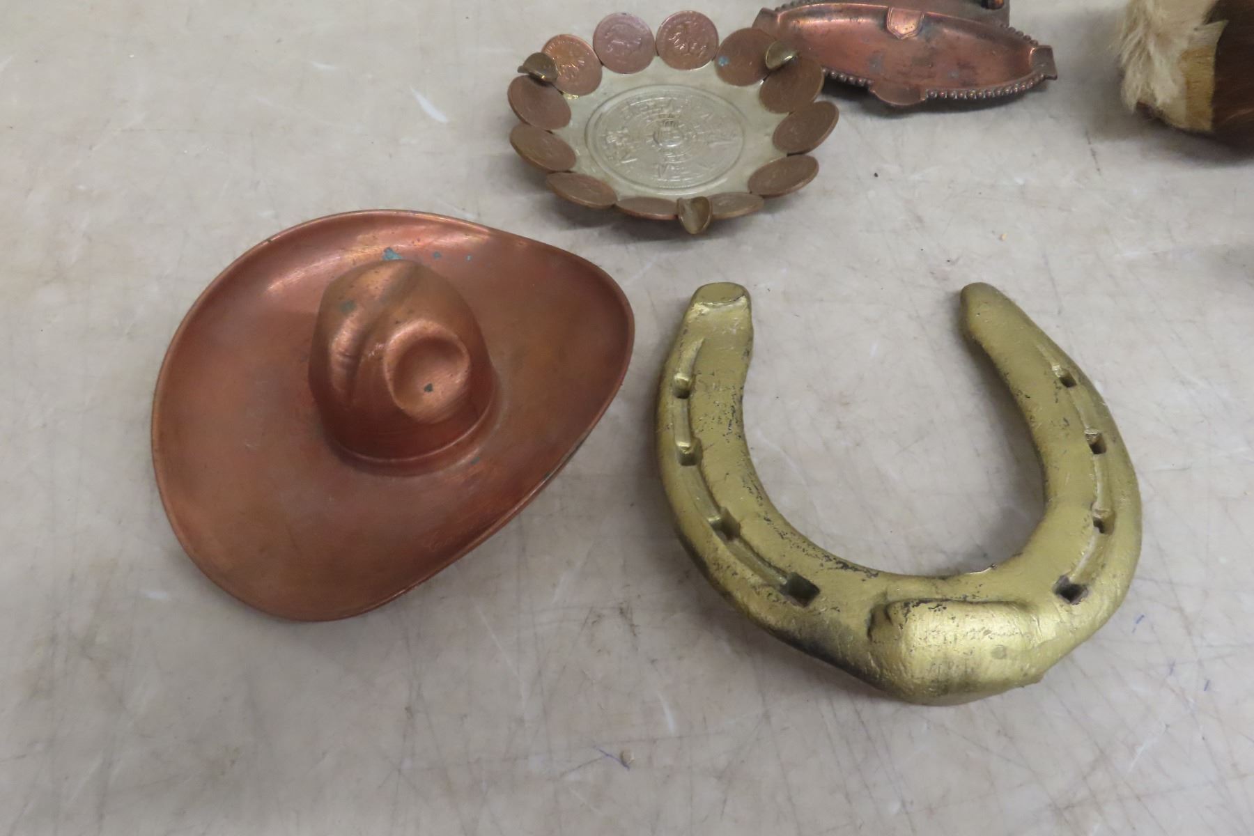Vintage Western Décor Lot Including Ashtrays, Boots, Horseshoe, Medicine Bottle, and Woods Canvas