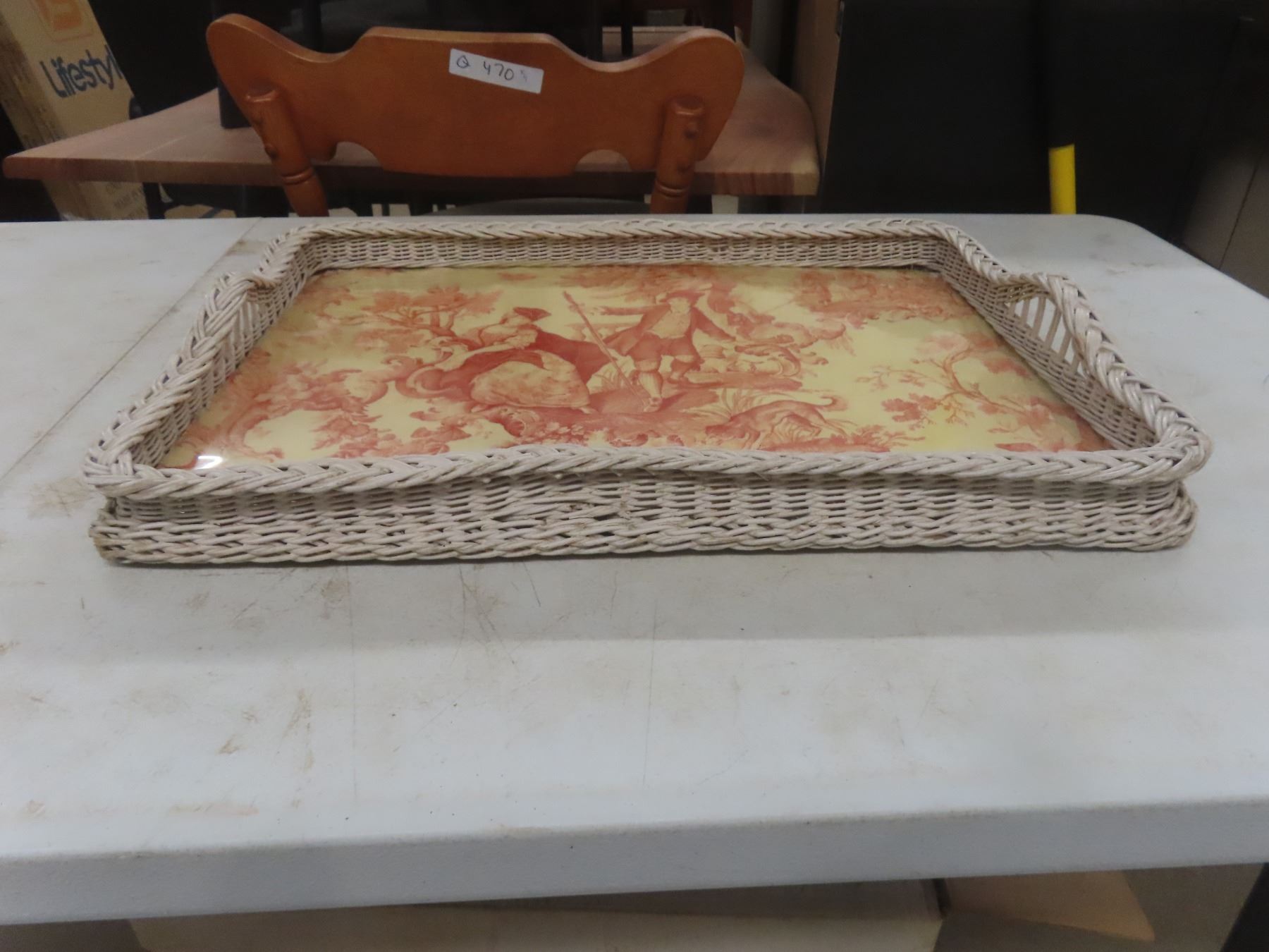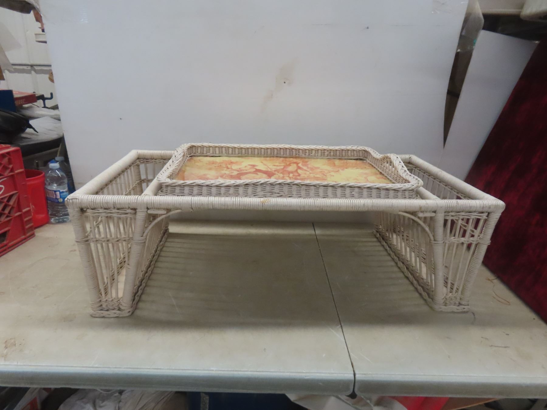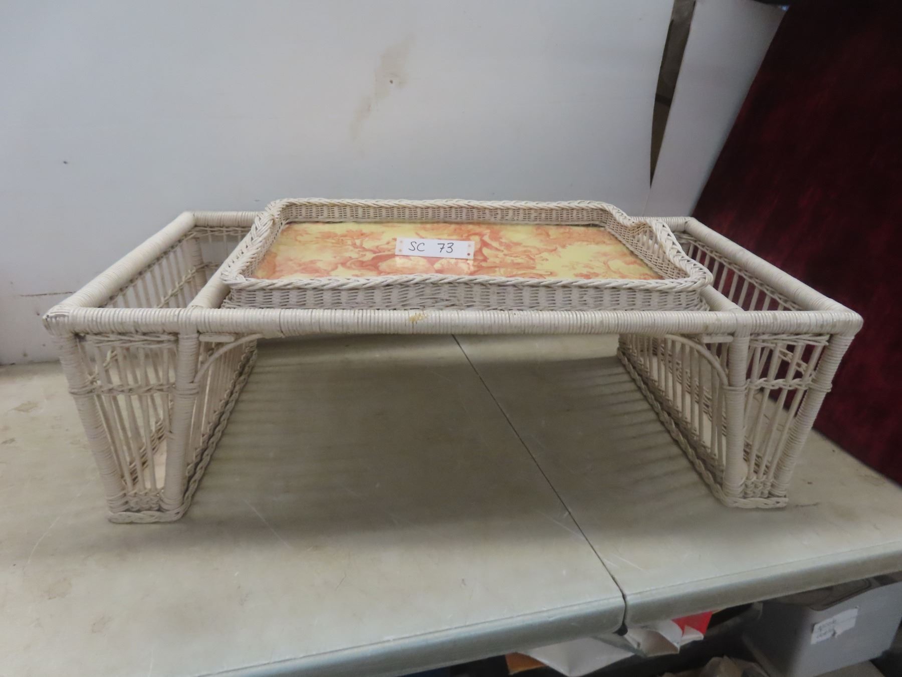 Vintage Wicker Breakfast-in-Bed Table with Book Storage and Removable Tray  10 x 18 x34  Tray 22 x16