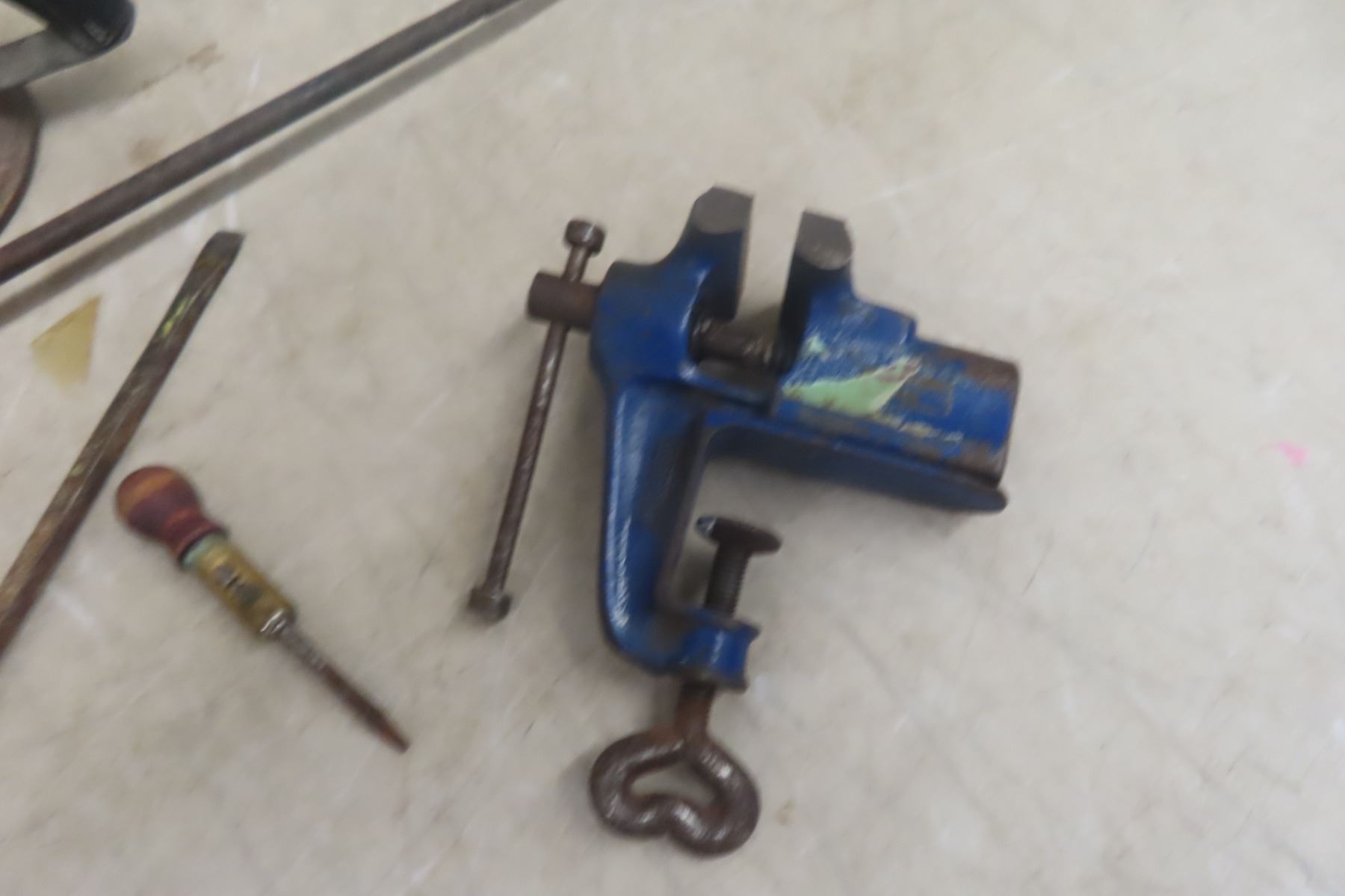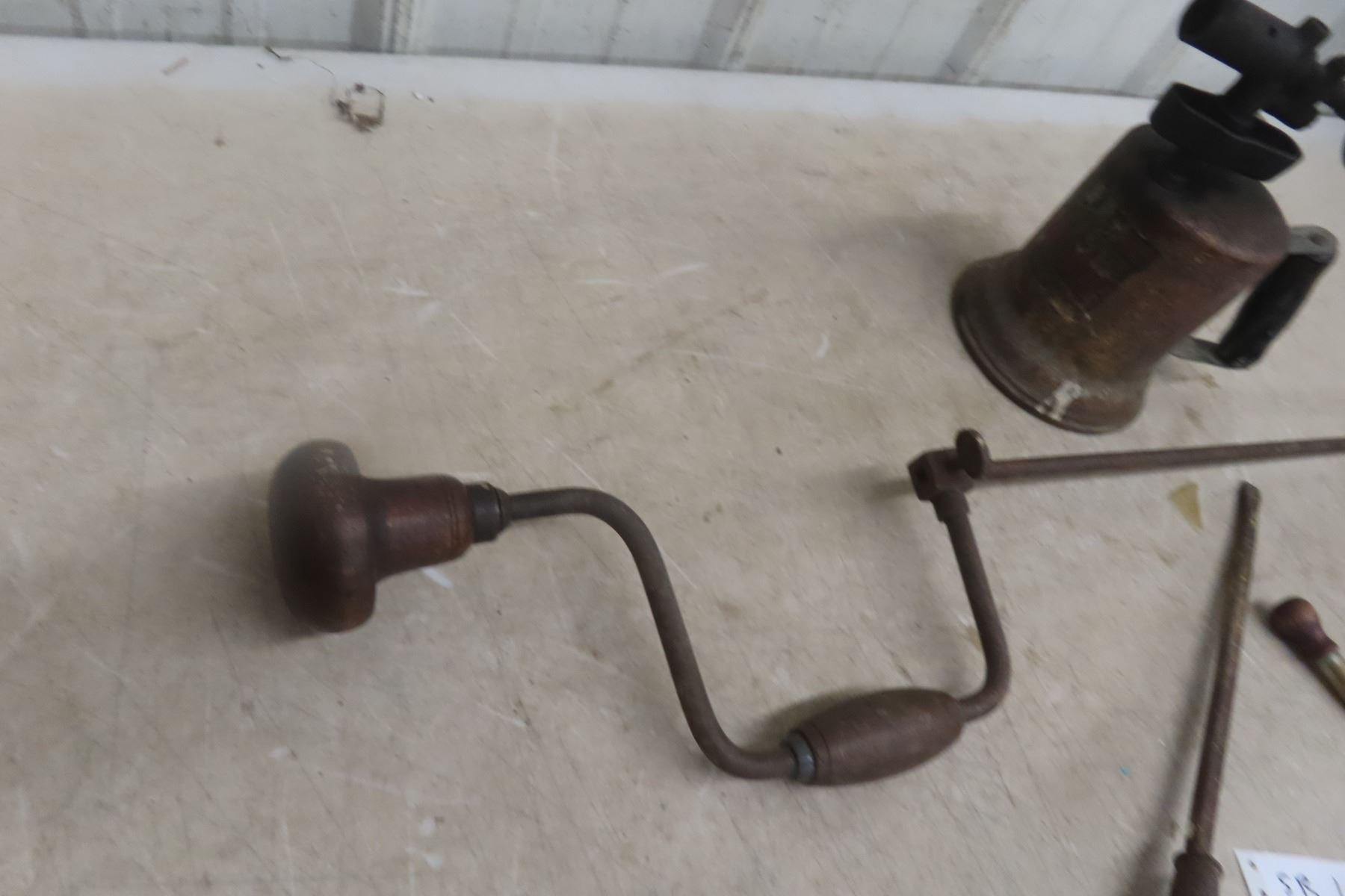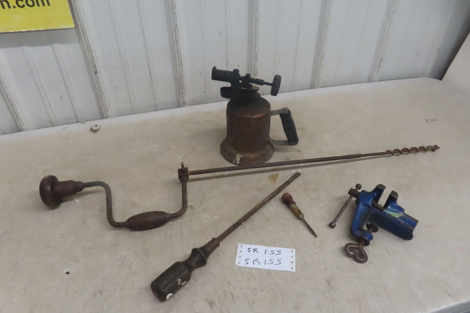Vintage Wood Drill; Long Screwdriver; Yankee #10 Ratcheting Screwdriver; Small Bench Vise; 1 Torch; Vintage Drill Press