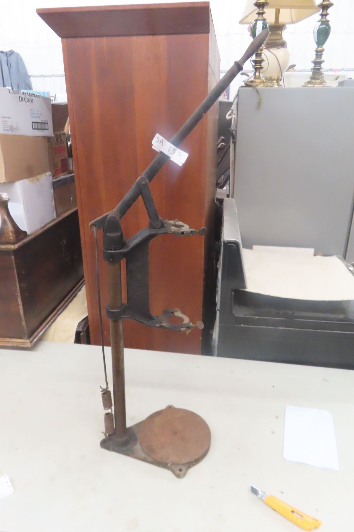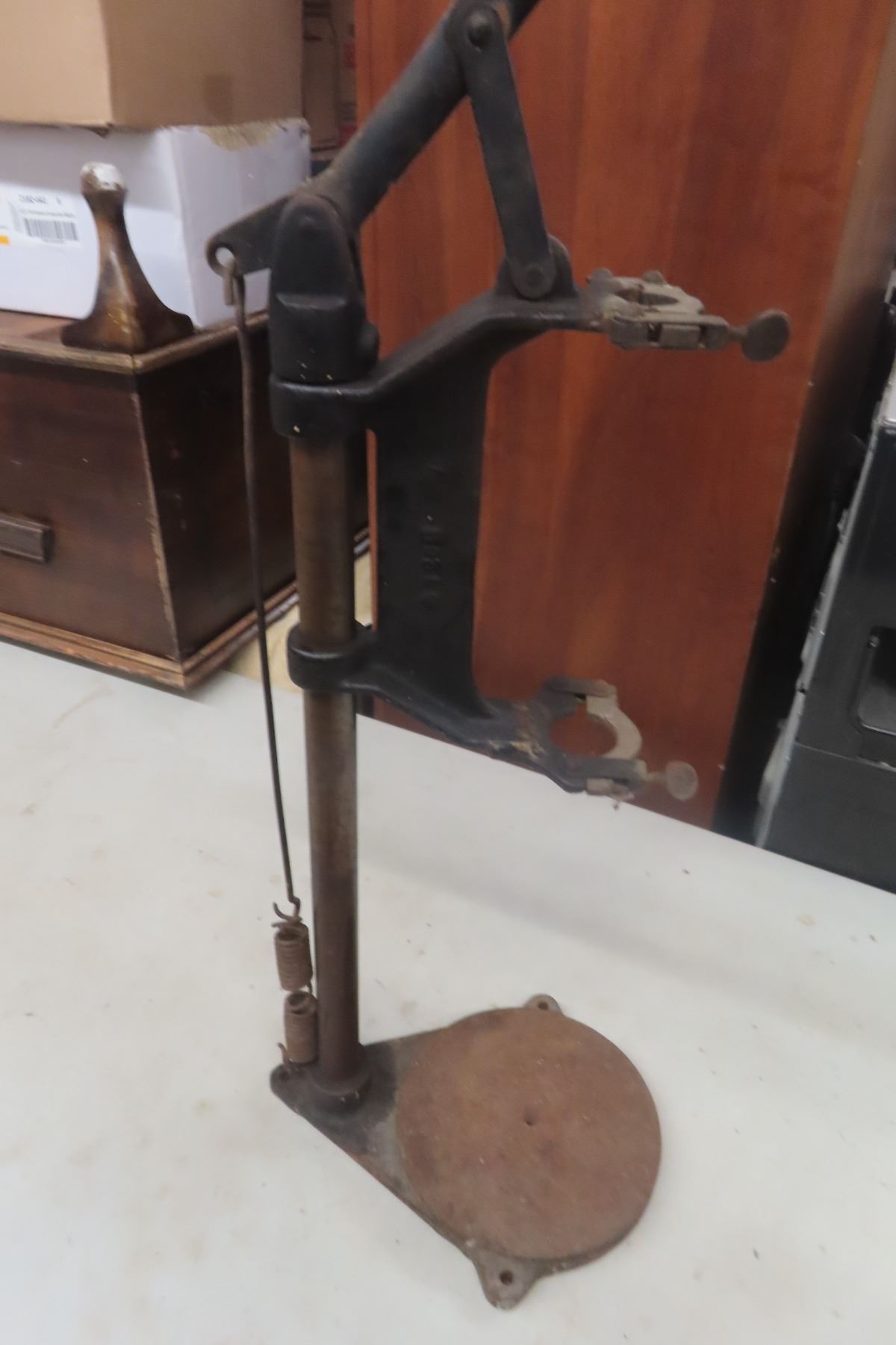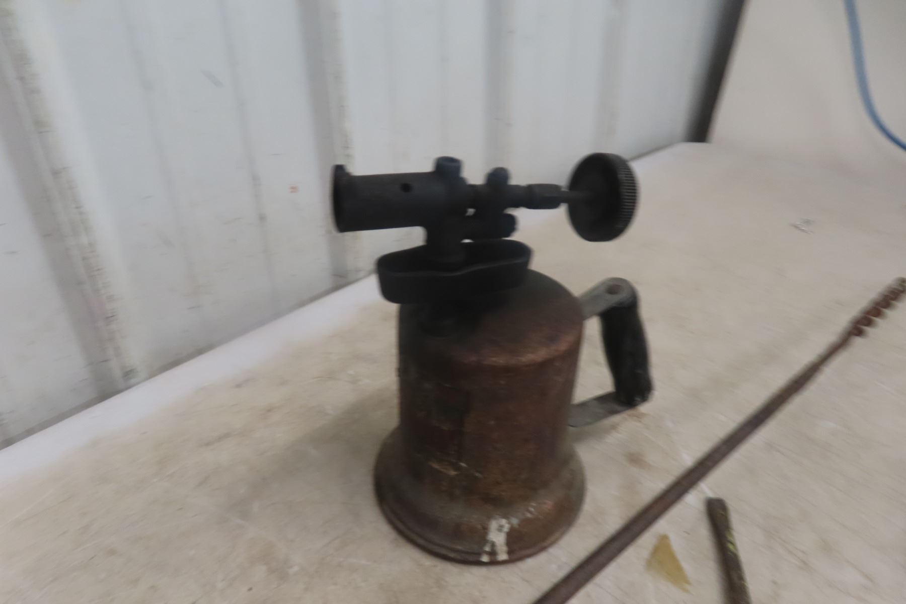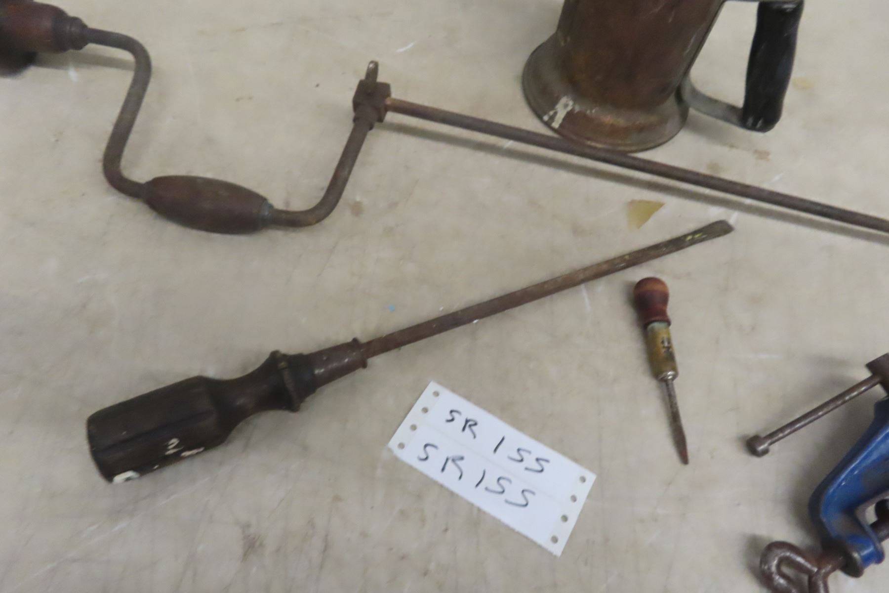 Vintage Wood Drill; Long Screwdriver; Yankee #10 Ratcheting Screwdriver; Small Bench Vise; 1 Torch; Vintage Drill Press
