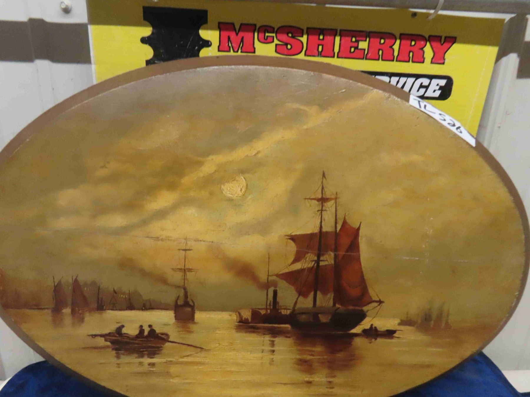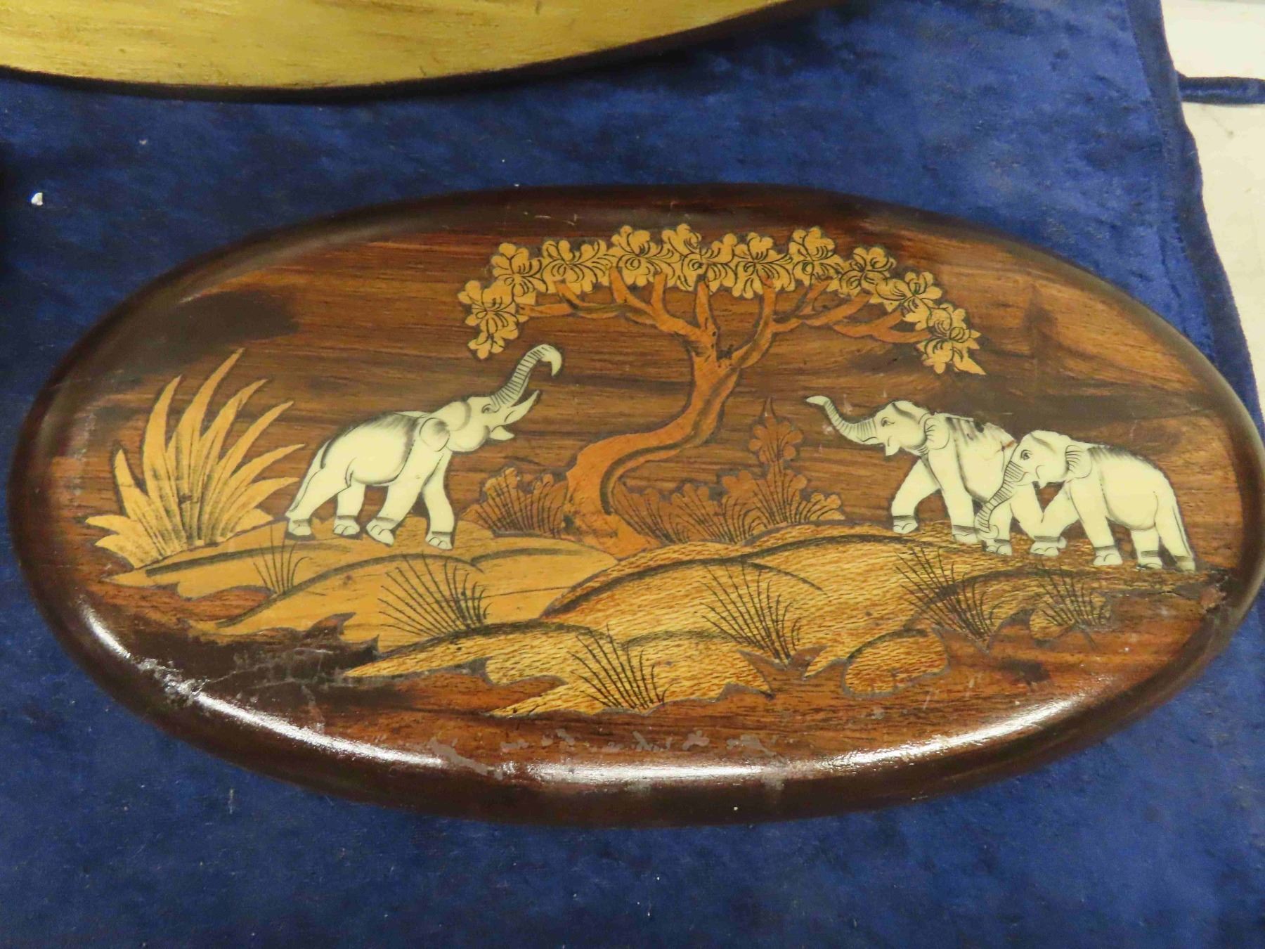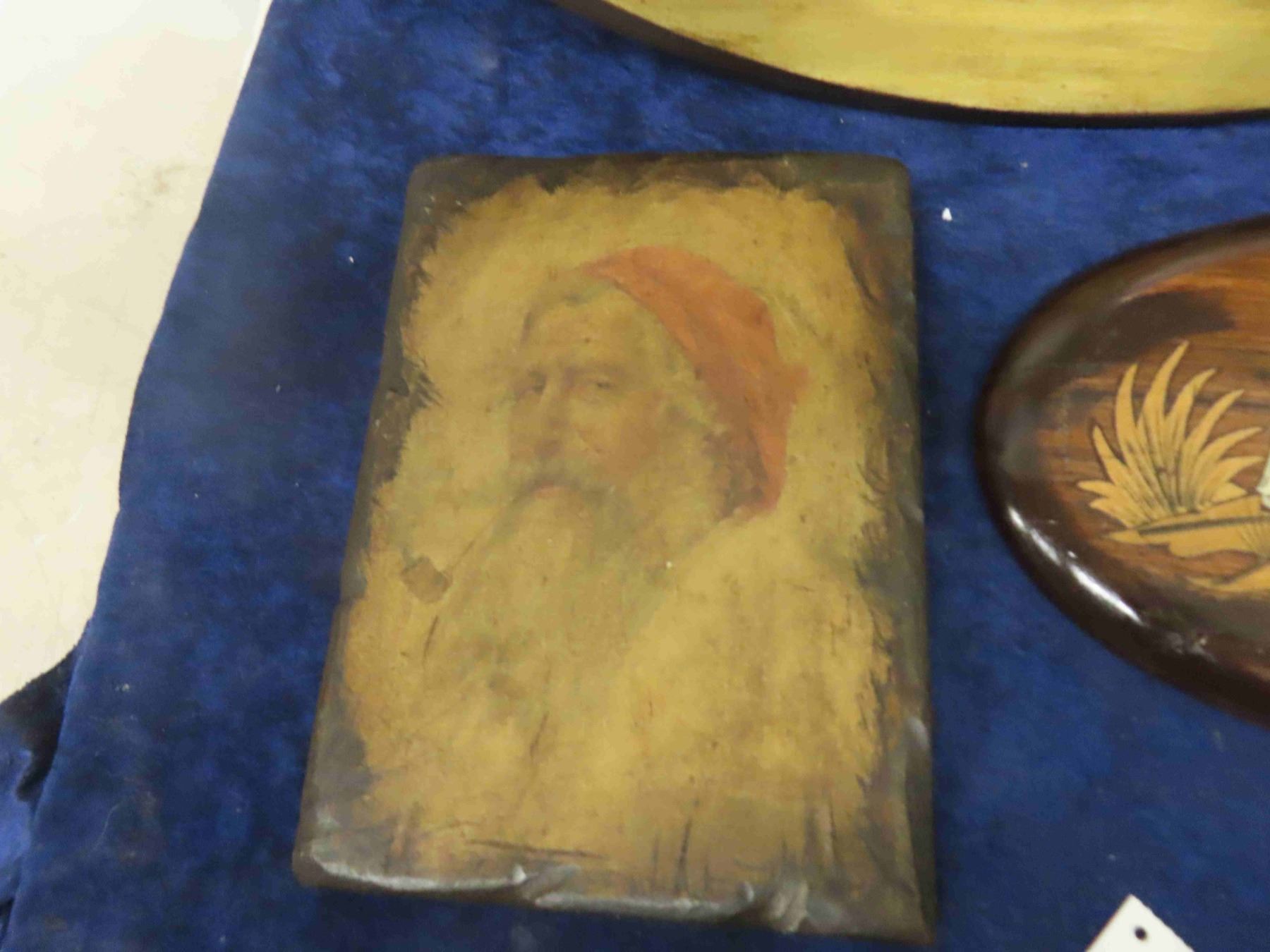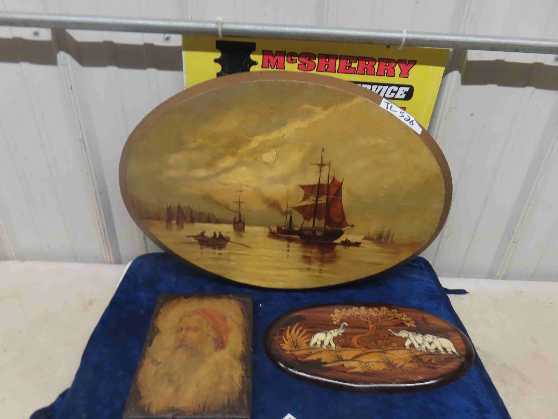 Vintage Wooden Elephant Plaque & Old Oil on Wood Ship Scene 16" x 23" - Oval Shape 7" x 10" Wooden Picture Elderly Man with Pipe 1940s Era