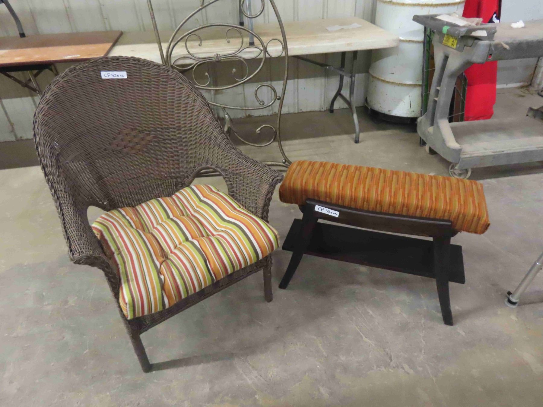 Vinyl Wicker High back Arm Chair with Cushion + Upholstered Top Bench/ Shelf