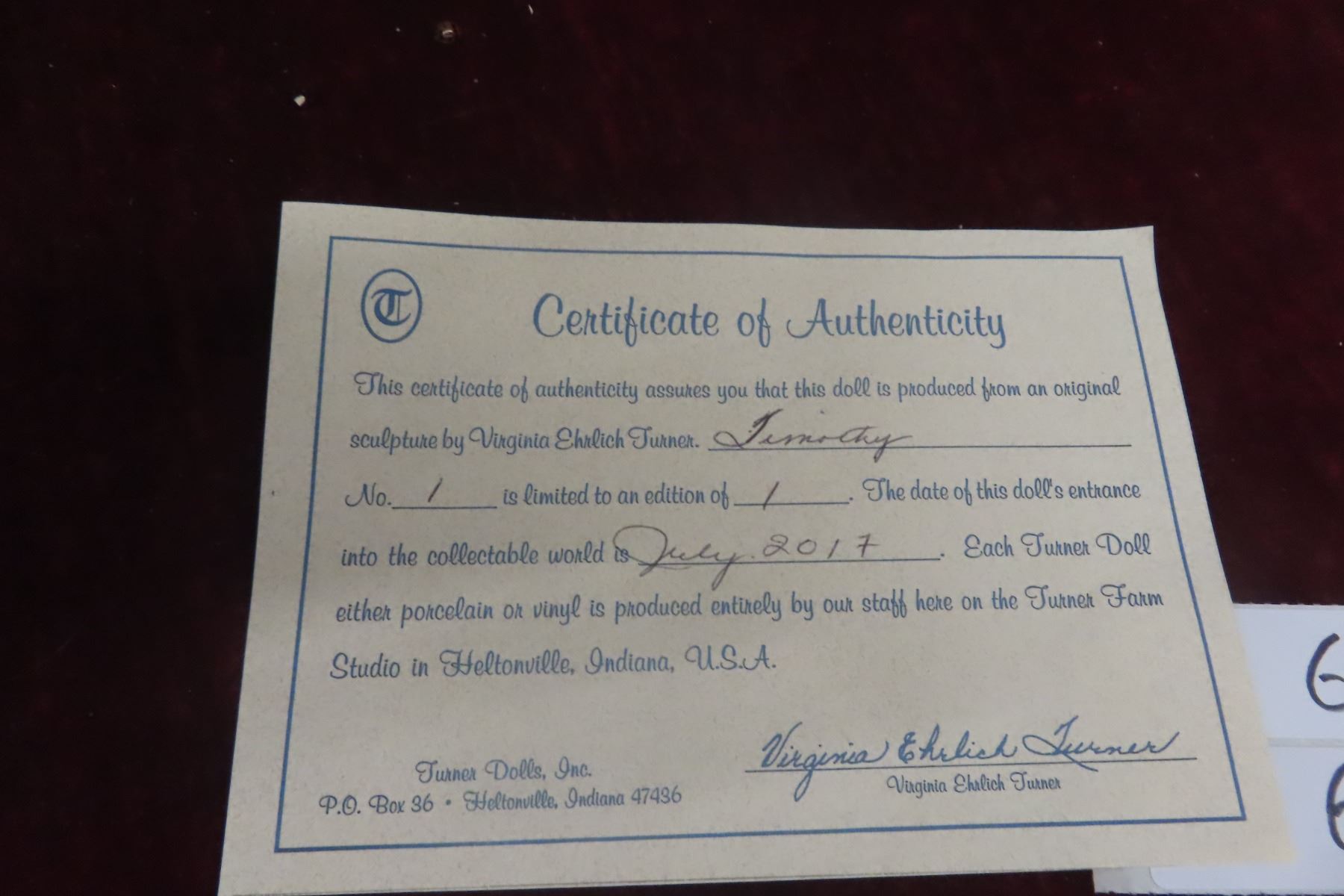 Virginia Turner Doll “Timothy,” One-of-a-Kind (No. 1 of 1), 27" Vinyl, Box with Certificate & Puppy