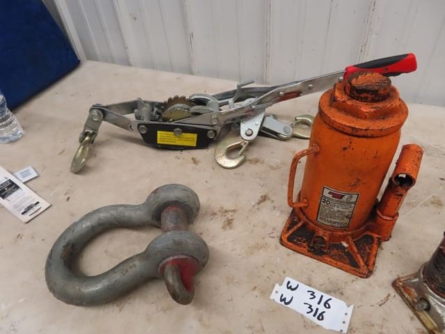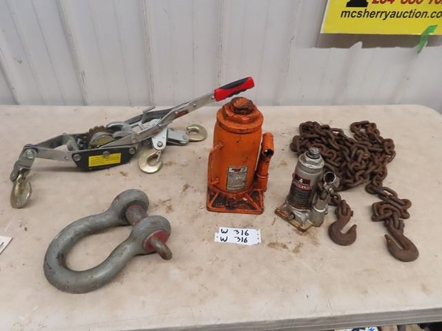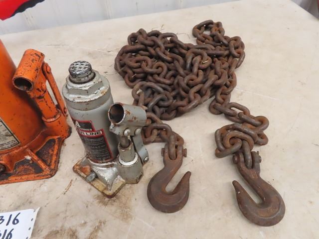 (W) 2 Bottle Hyd Jacks- 1 is 20 Ton & 1 is 4 Ton Come A Long, 20' Plus Chain w 2 hooks & Large Clevis