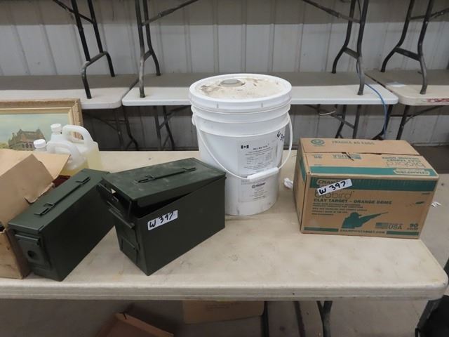 (W) 5 Gal Pail Mill Mix 70/30, Full Box of Clay Pigeons, 2 Ammo Boxes