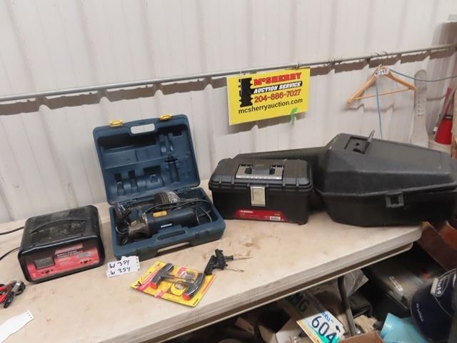 (W) Battery Charger, Mastercraft Angle Grinder Tire Repair, Tool Box, Chainsaw Case