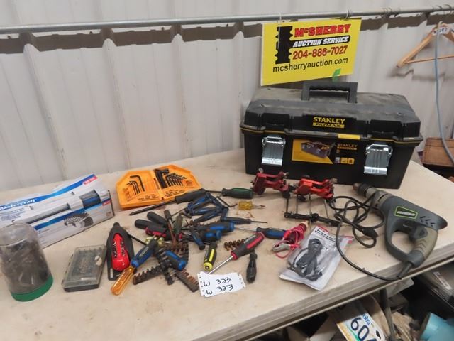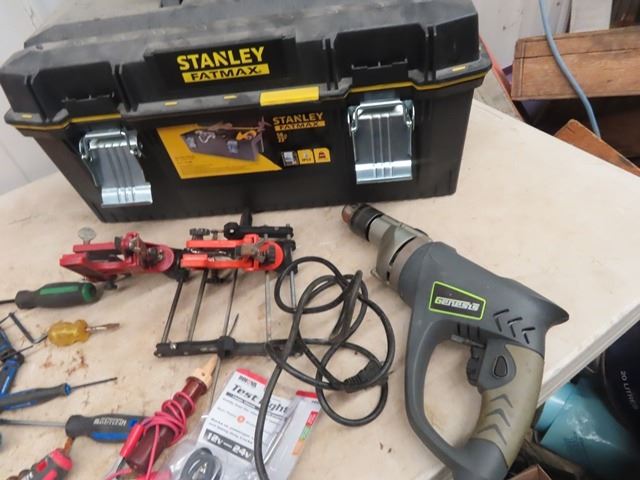 (W) Fat Max Tool Box, Genesis Power Hammer Drill, Chain Saw Sharpener, Screwdrivers, Allan Wrenches