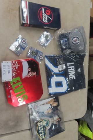 WPG Jets + Elvis Package ; Laine Sz XL T- Shirt, Jets Cap, Dustin Byfuglien Mini Jersey, Elvis Action Figure, Elvis Tin