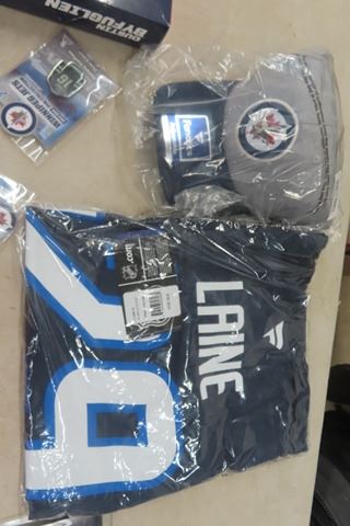 WPG Jets + Elvis Package ; Laine Sz XL T- Shirt, Jets Cap, Dustin Byfuglien Mini Jersey, Elvis Actio