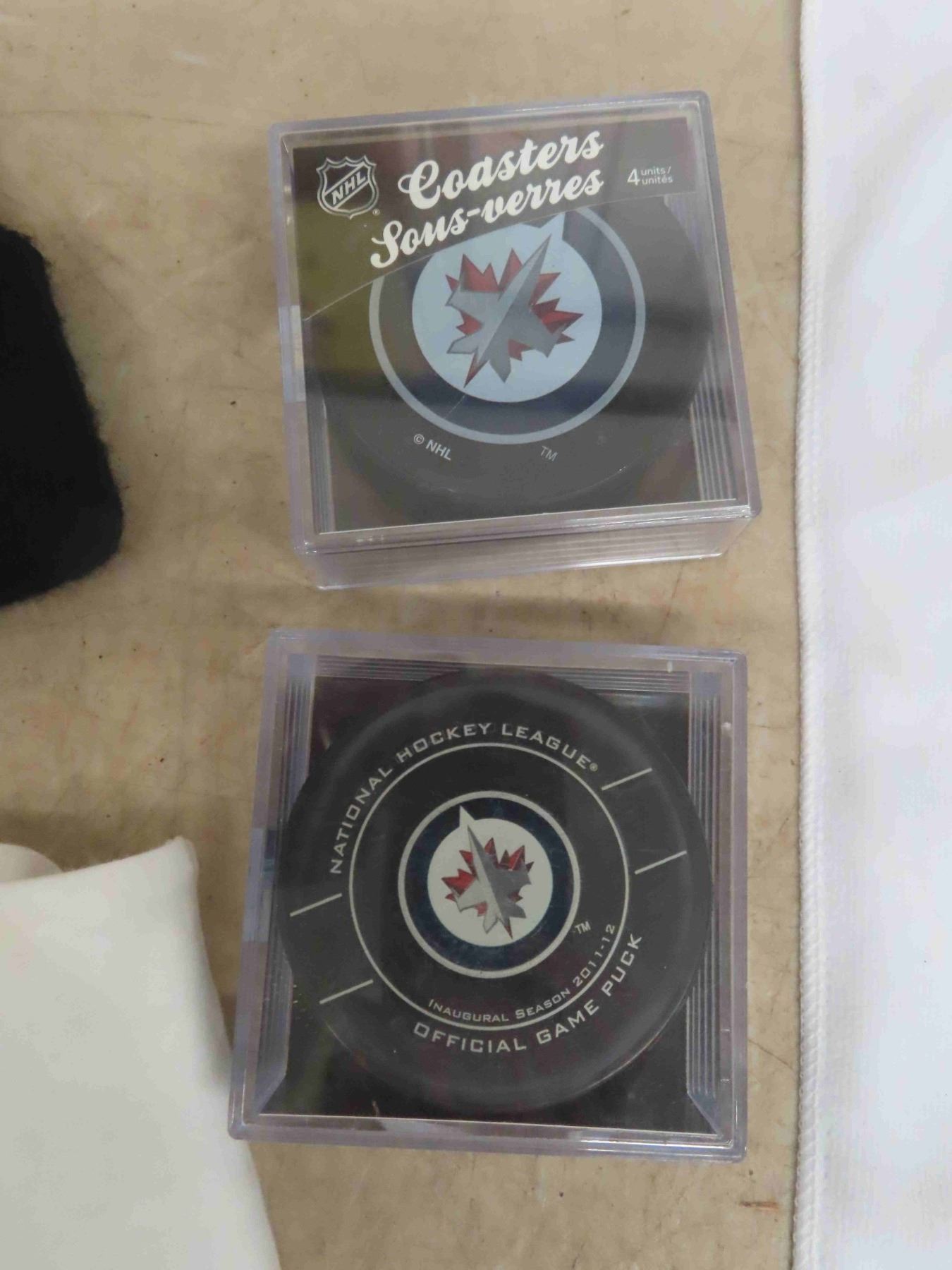 WPG Jets New Ball Cap, Game Puck, Playoff Towels; 2018 + 2019, 1996 New Old Stock T-Shirt, Coasters