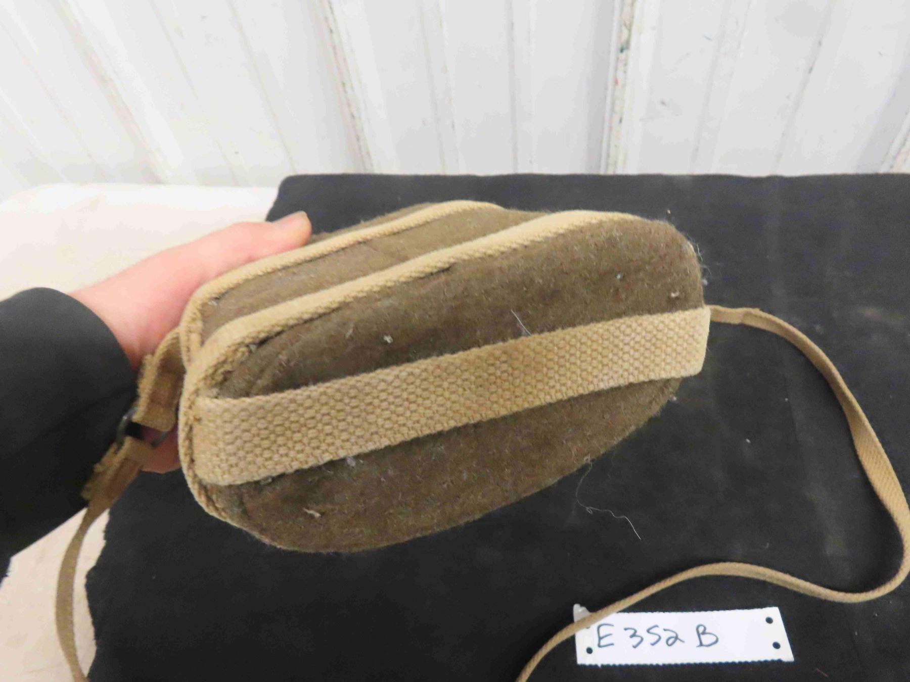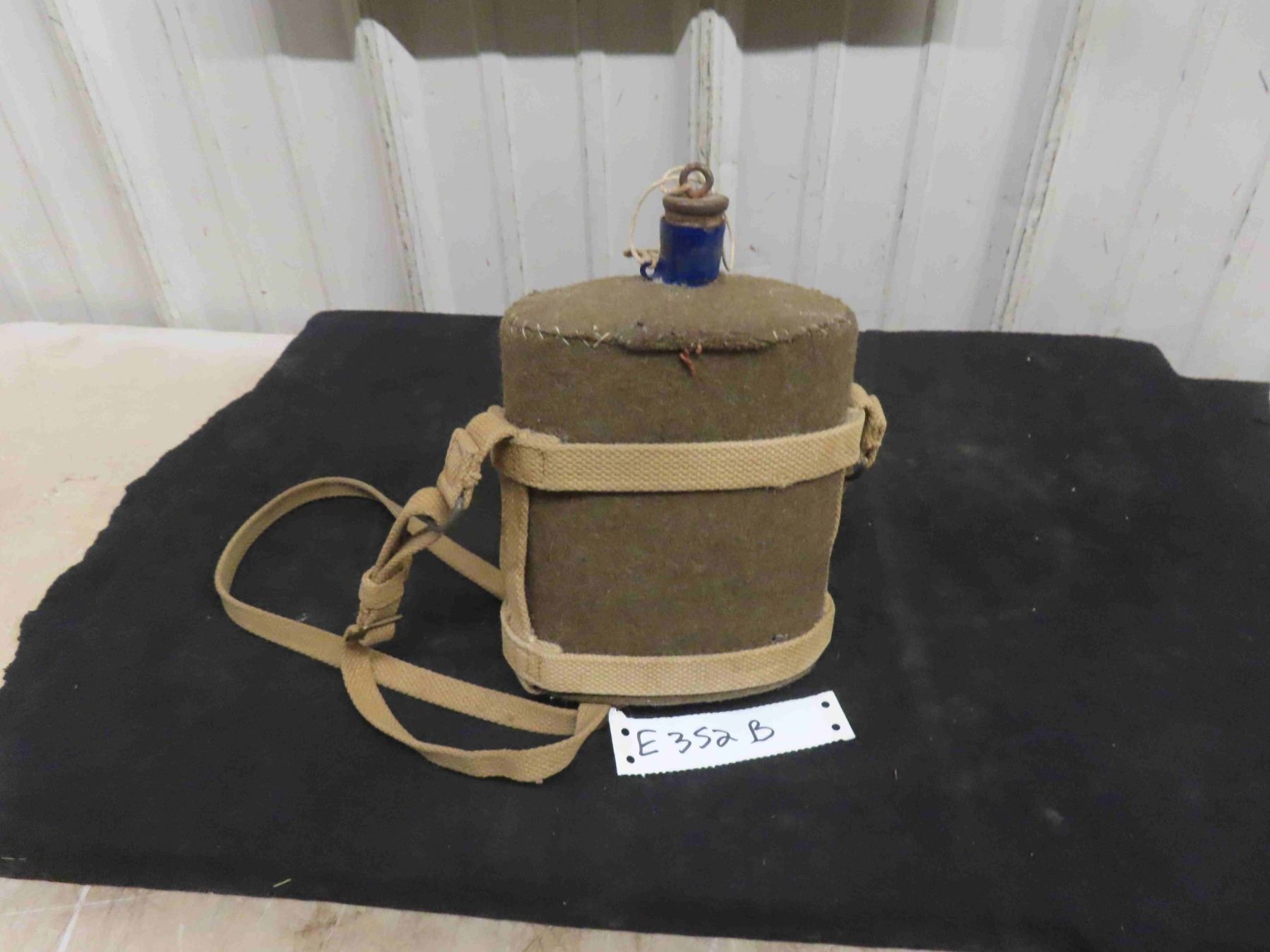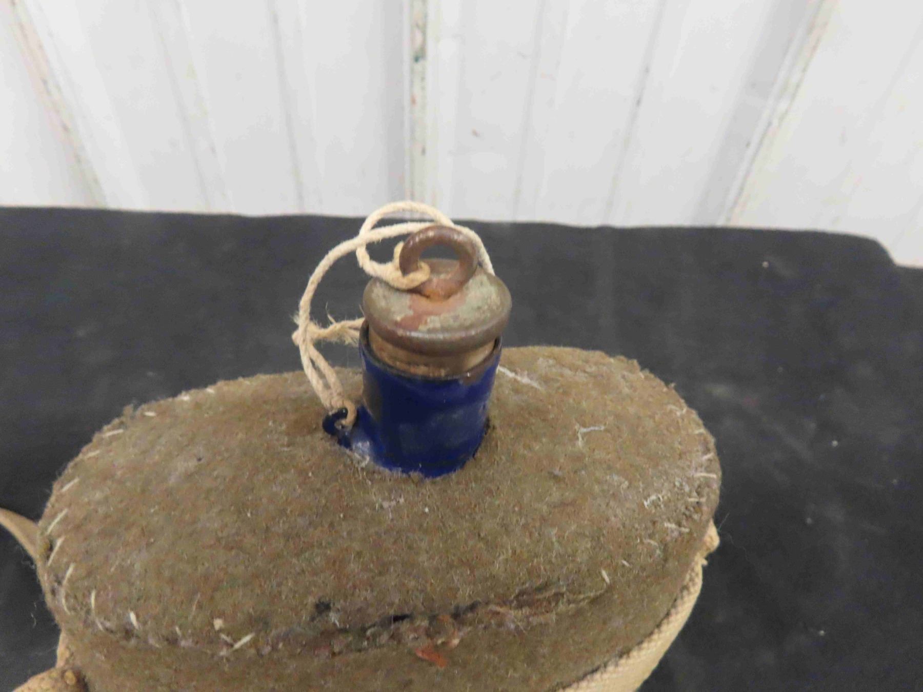 WWII Military Canteen. Green Felt Covering with Blue Porcelain Metal. Cork Stopper. Excellent Condition.