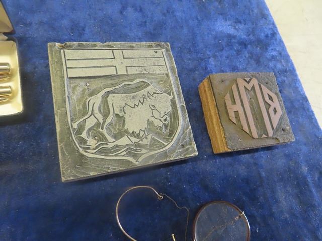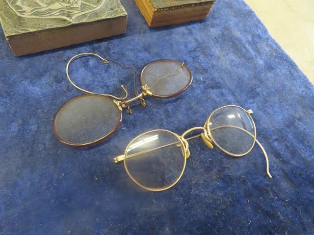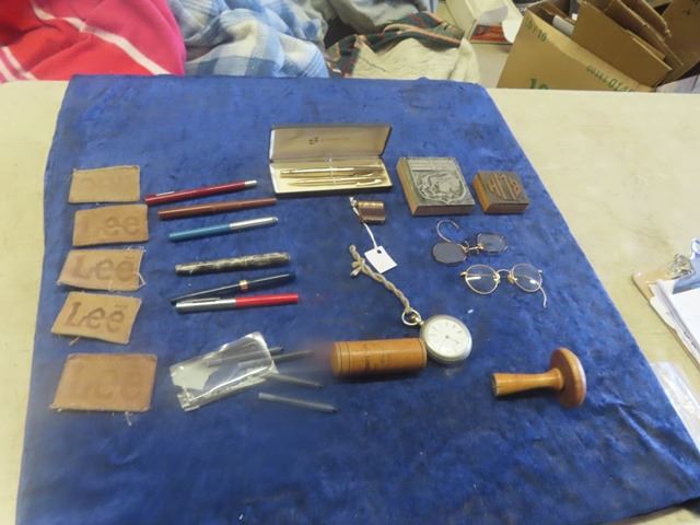 Walt Pocket Watch, Old Eye Spec Glasses, Stamp Press, Pens plus more