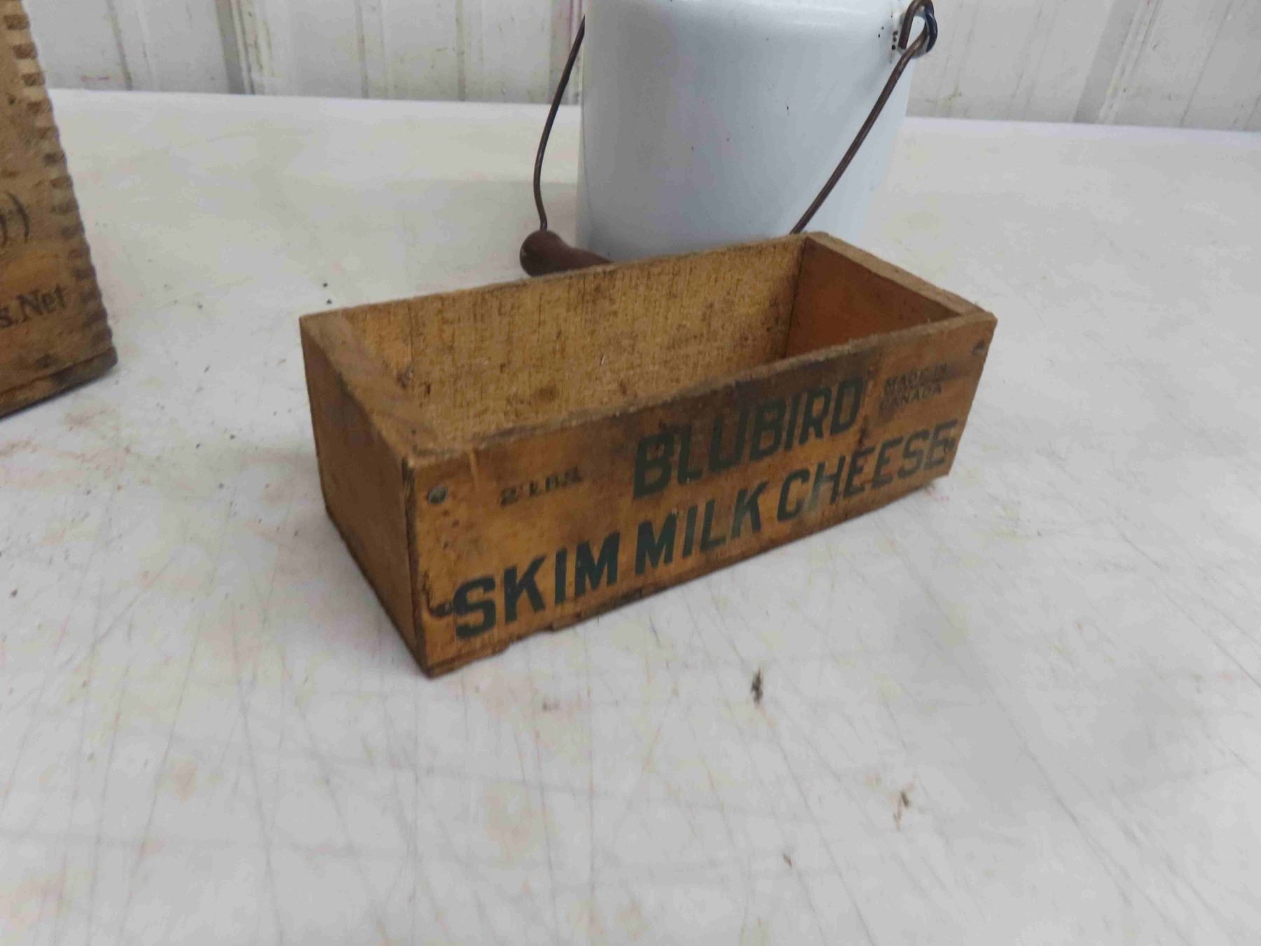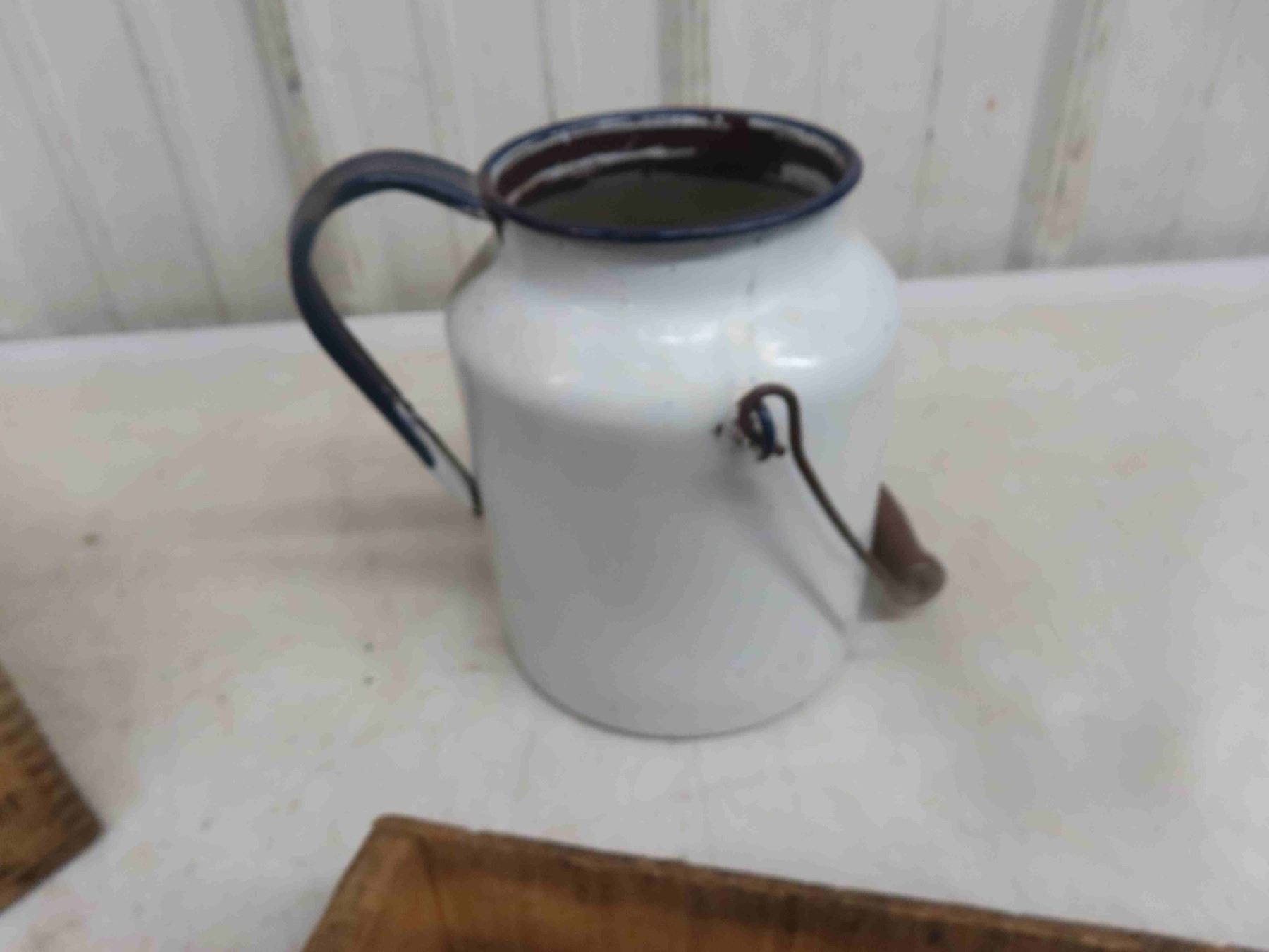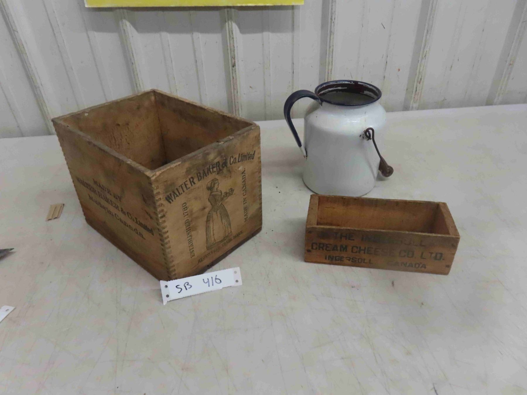 Walter Baker Crate Cheese Box , Enamel Pitcher