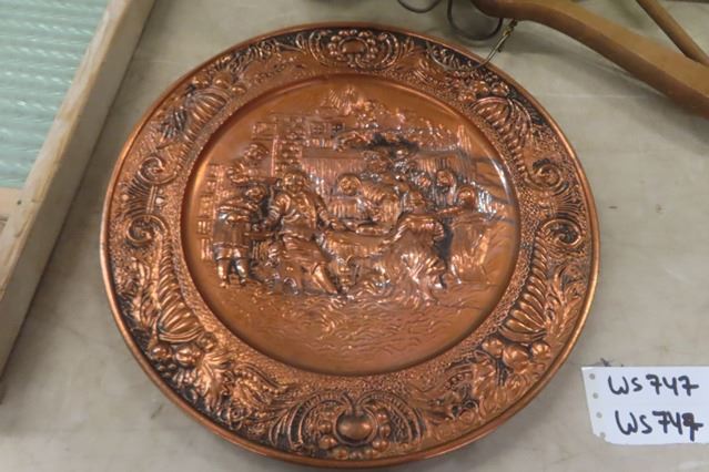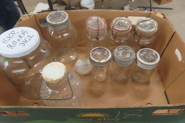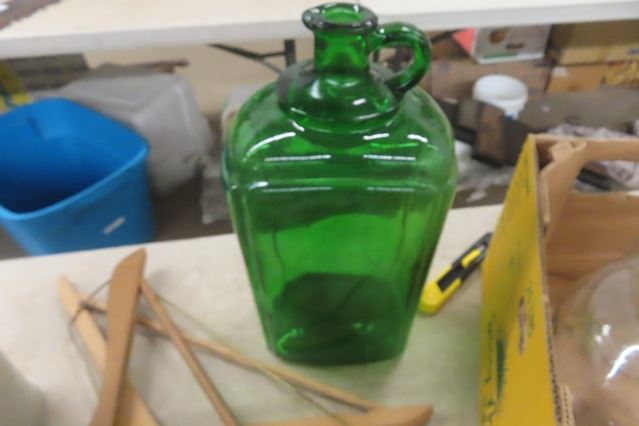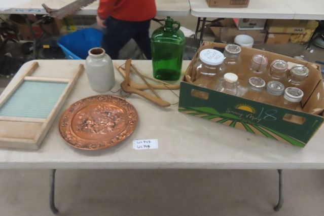Wash Board, Assorted Sealers, Crock, Green Jug, Copper Tray