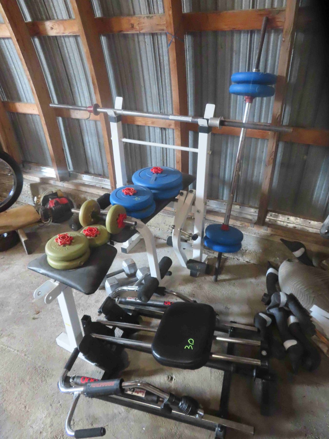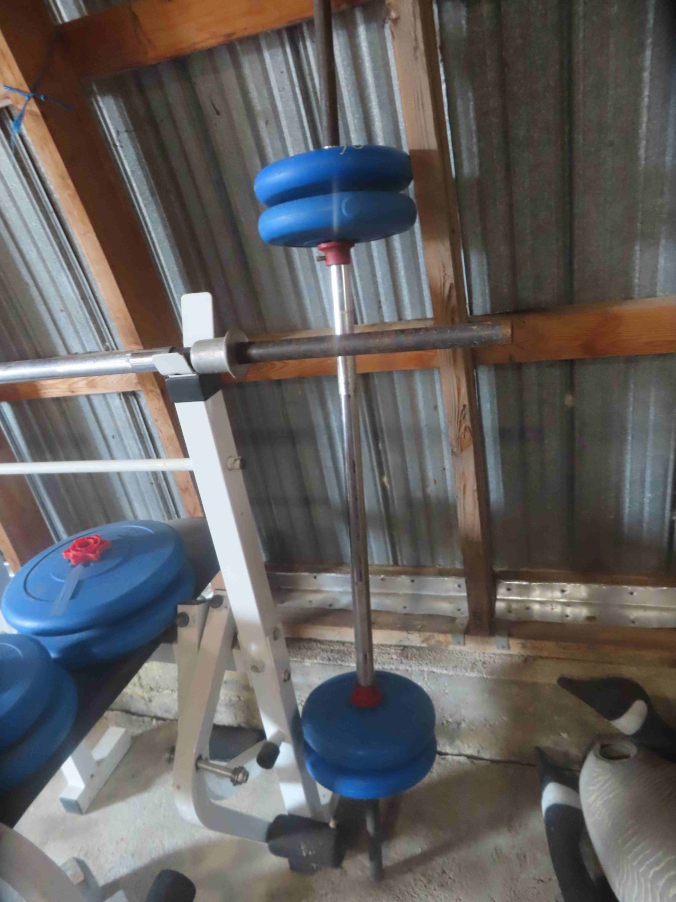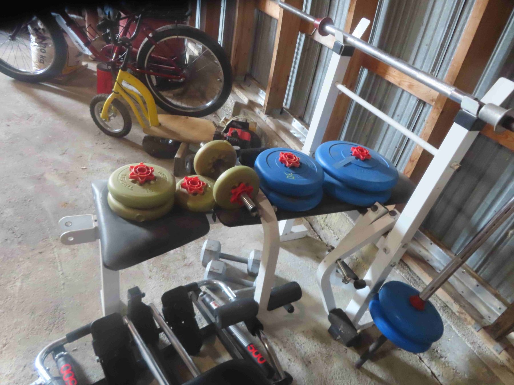 Weight Bench with Bar, York + Weider Plates, 25 LBS Dumbells, York 500 Rower Machine